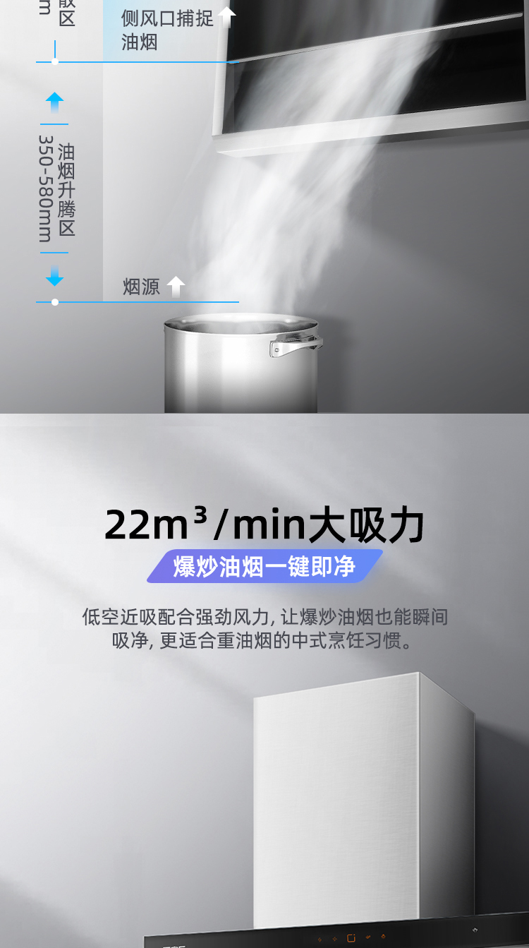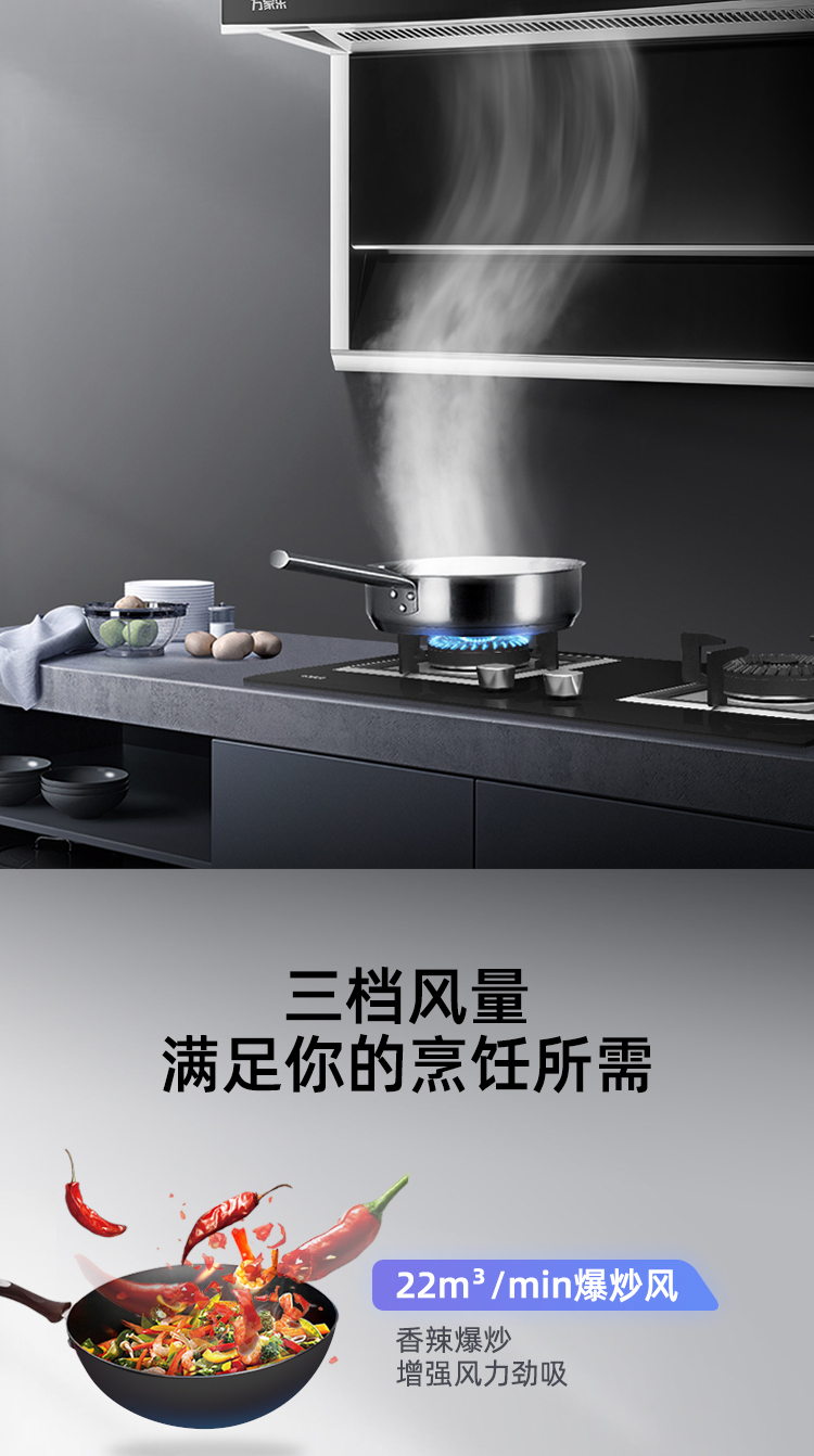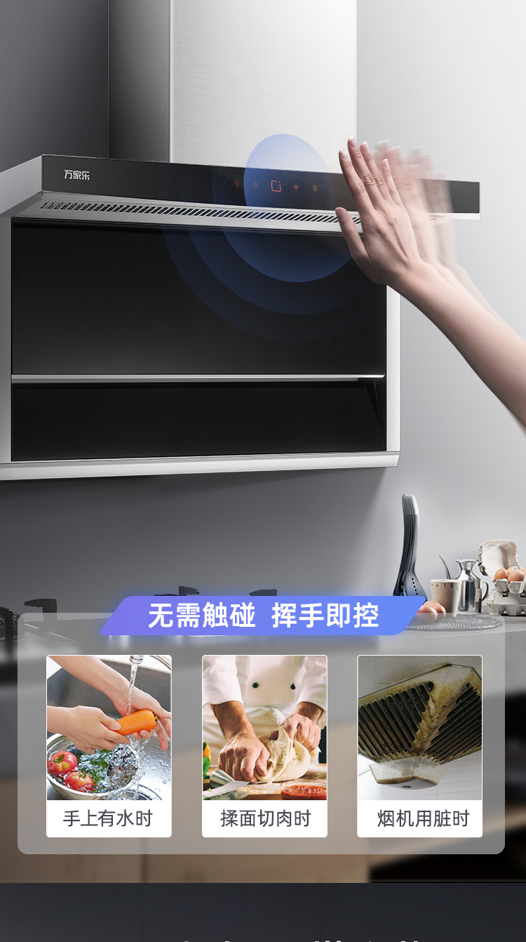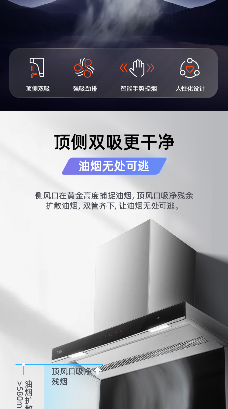 万家乐 油烟机 22立方 爆炒大吸力 钢化玻璃面板 顶侧双吸 挥手智控 家用脱排油烟机CXW-360-CL072