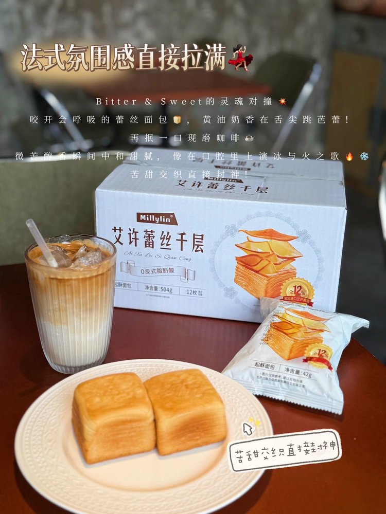 🍞 蕾丝千层×咖啡=味觉核弹级暴击咬下云朵般的蕾丝面包,黄油焦香在舌尖炸开🧈✨!再猛吸一口拿铁,Bitter & Sweet疯狂battle💥——面包的绵密甜蜜撞上咖啡的清爽微苦,冰火两重天的快乐,直接原地升天