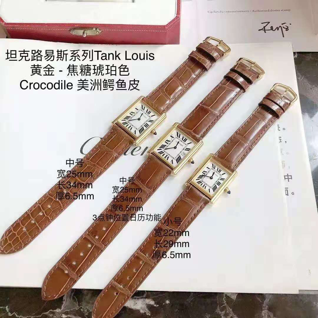 中号:宽25mm 长34mm 厚6.5mm#卡地亚坦克路易斯系列TankLouis 进口瑞士石英机芯,316L精钢表壳,太阳折射纹表盘,蓝宝石水晶镜面,蓝宝石尖晶石表冠(Crocodile 美洲鳄鱼皮、缎面绢丝小牛皮、意大利节纹小牛皮)表壳尺寸:
