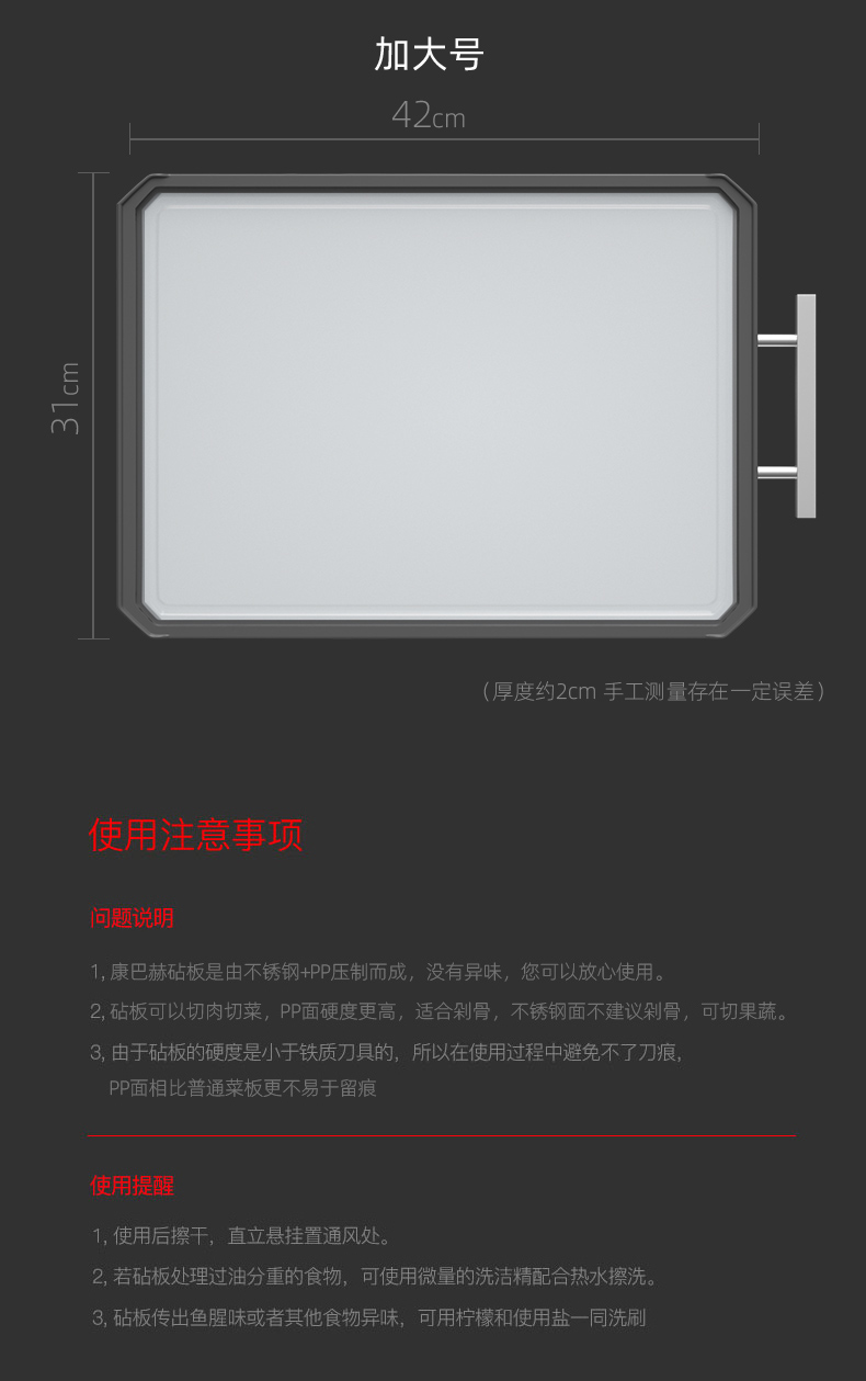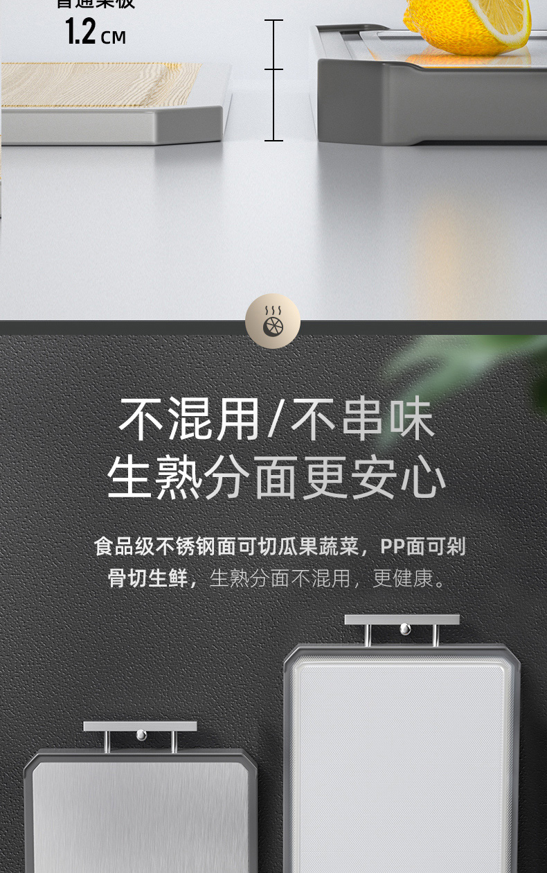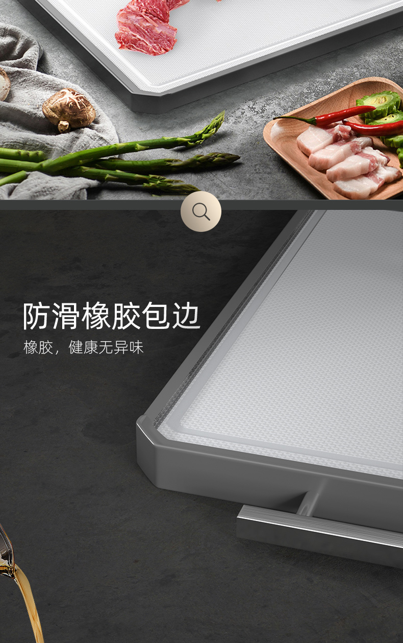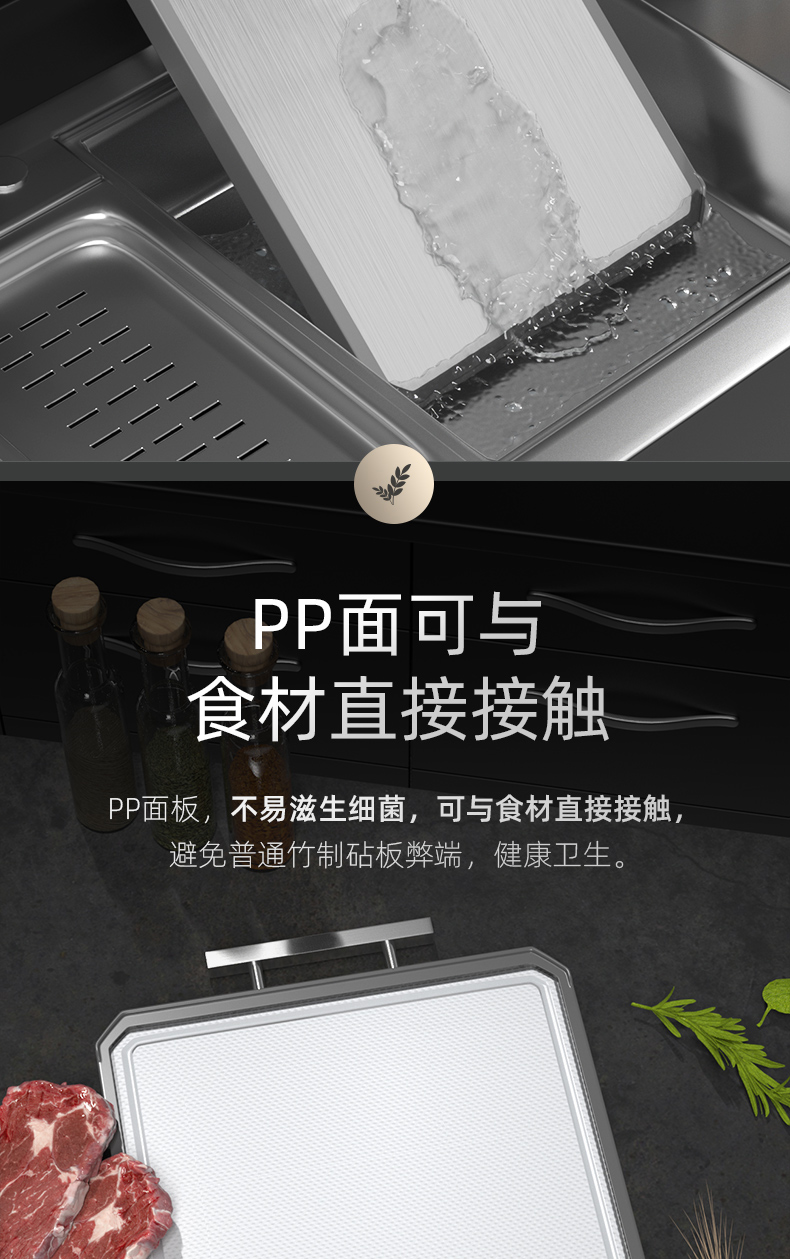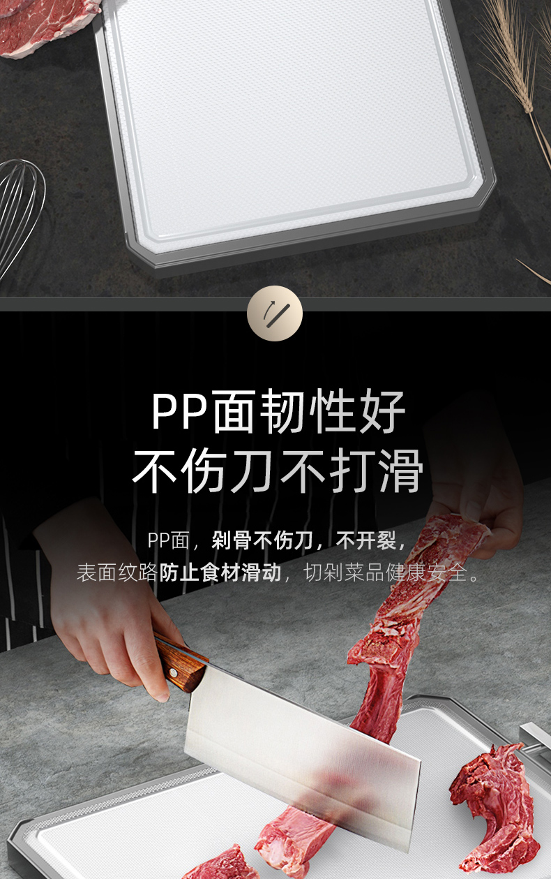 2,砧板可以切肉切菜,PP面硬度更高,适合利骨,不锈钢面不建议剁骨,可切果蔬。