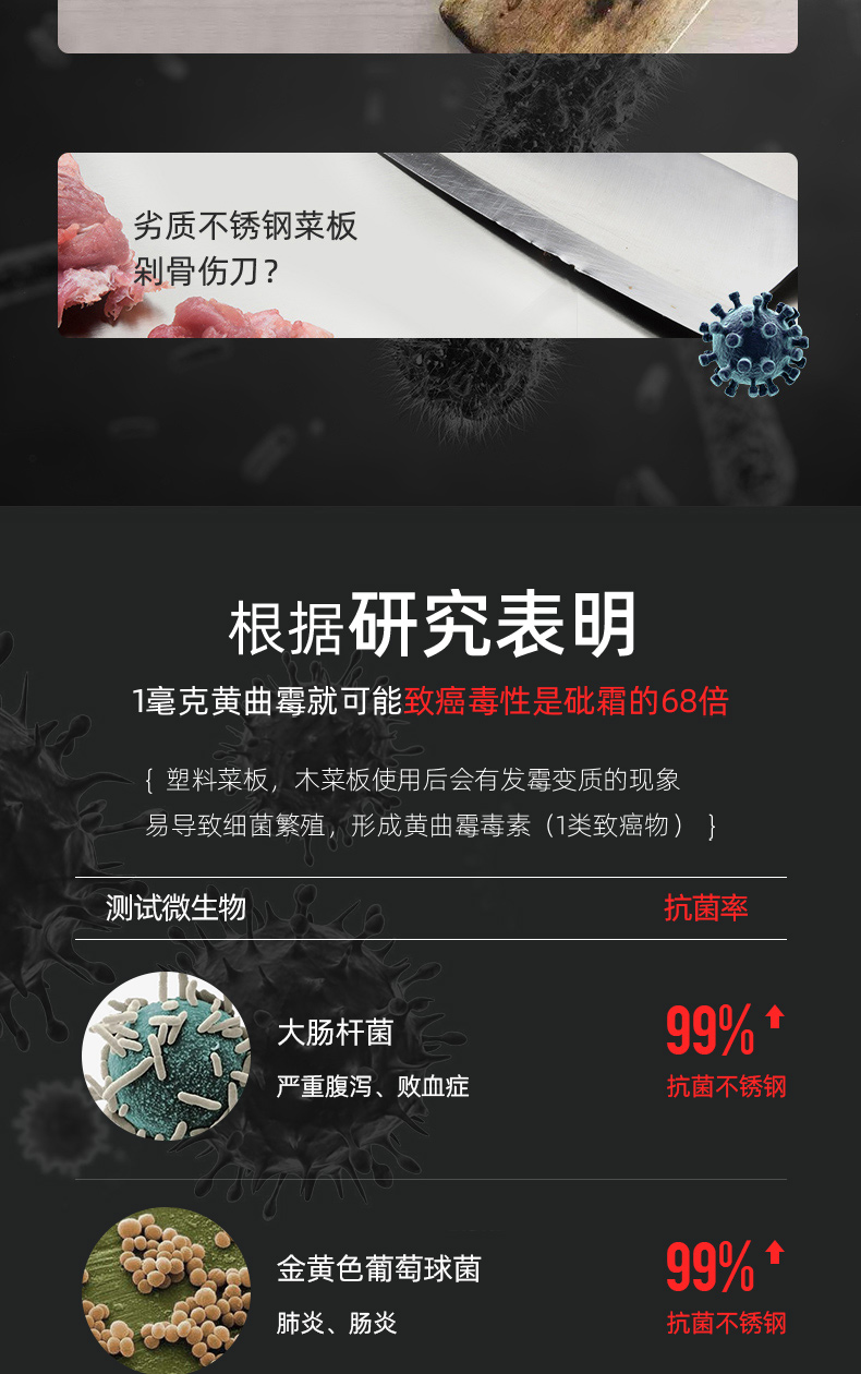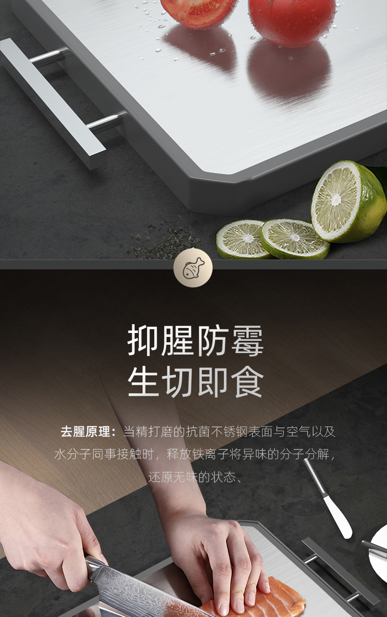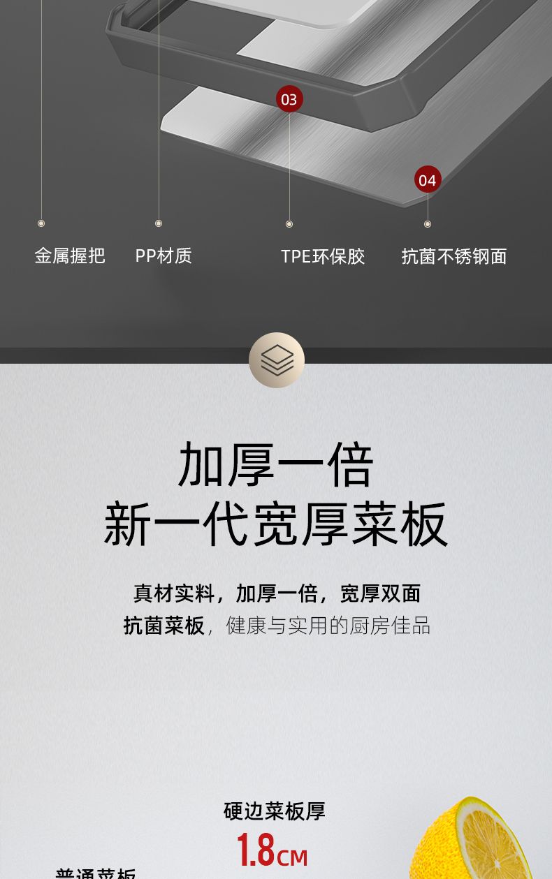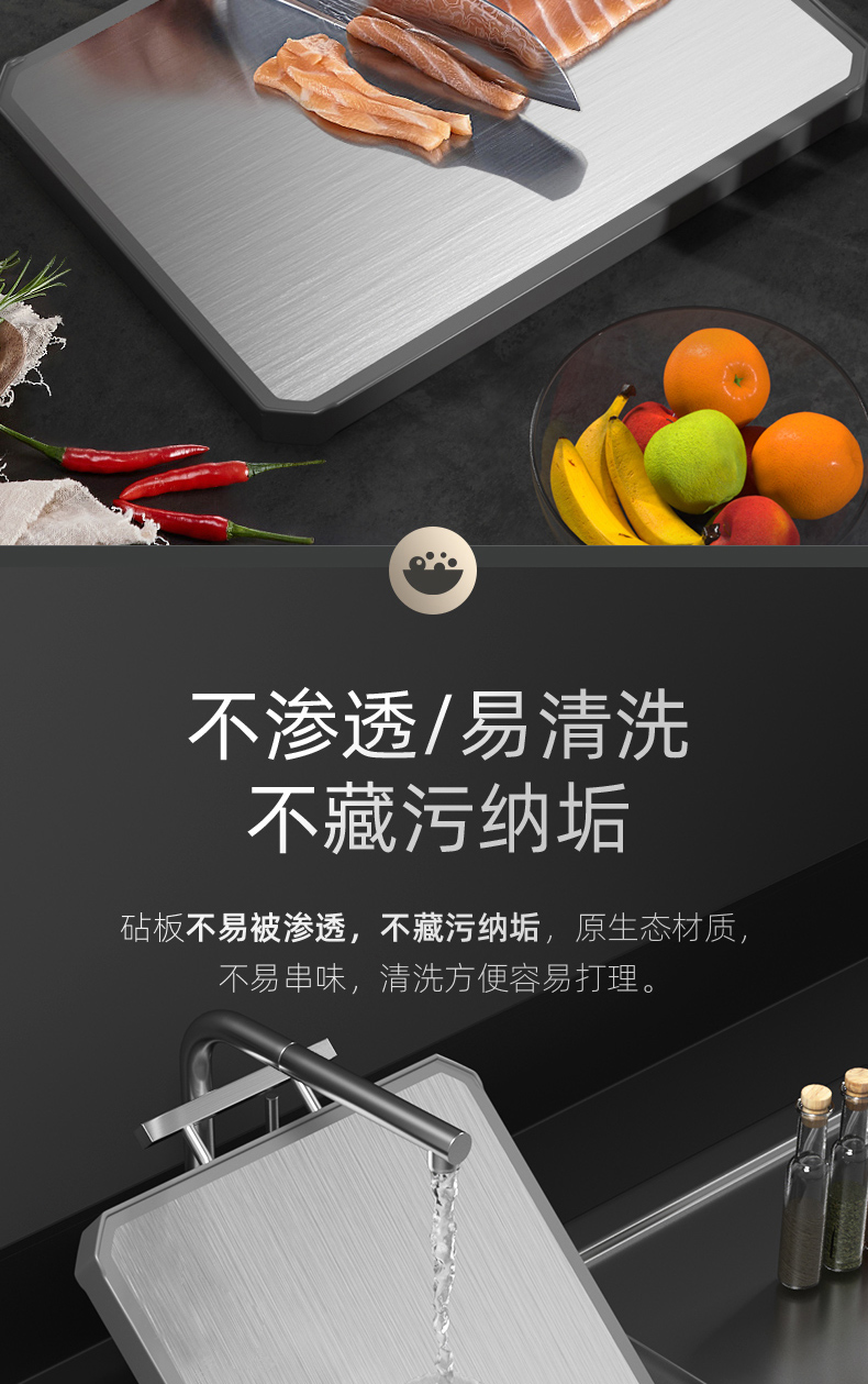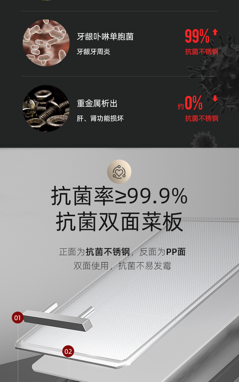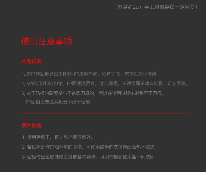 2,砧板可以切肉切菜,PP面硬度更高,适合利骨,不锈钢面不建议剁骨,可切果蔬。