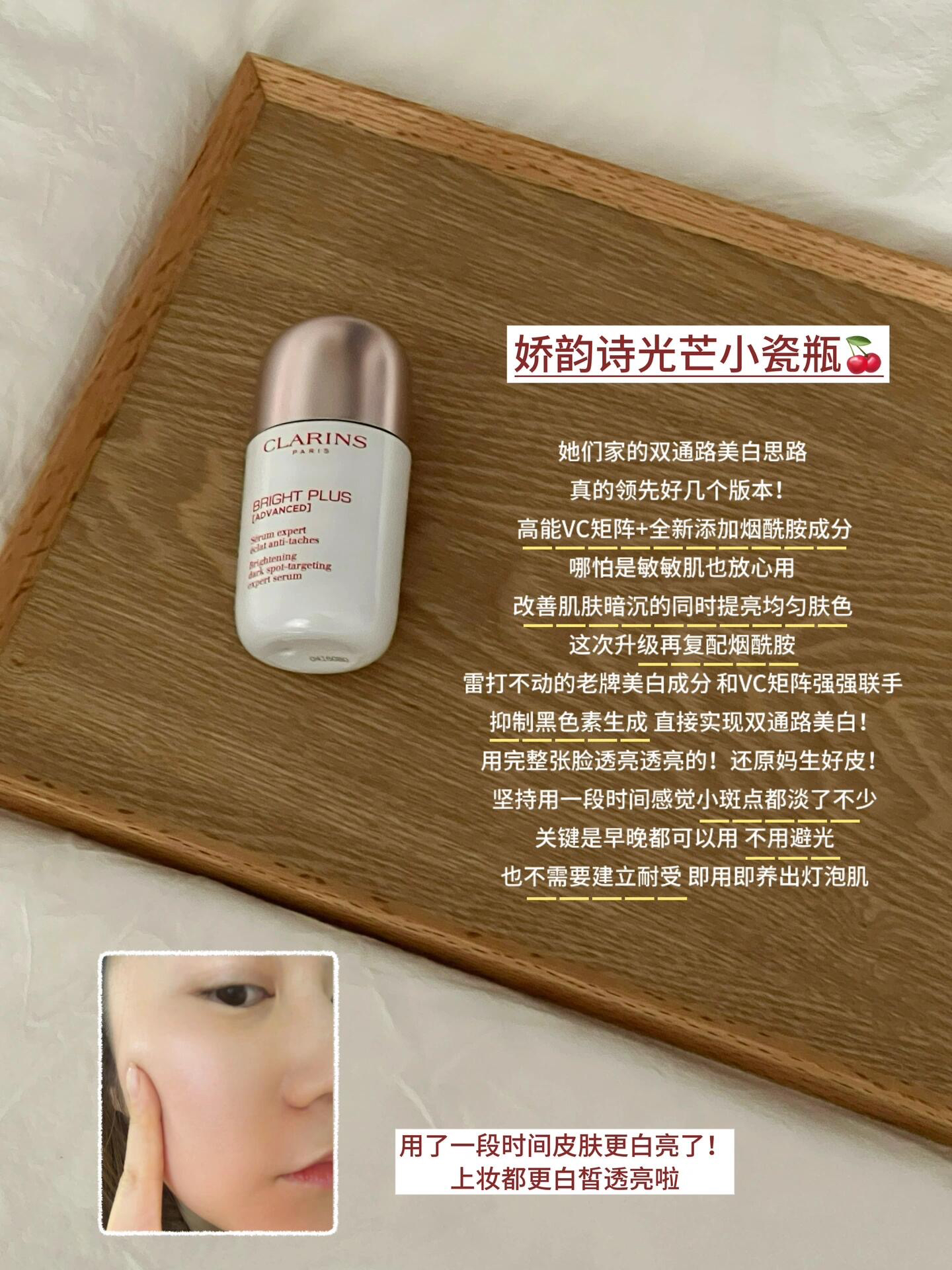 娇韵诗美白淡斑小瓷瓶50ml零差评好产品适合所有肤质!质地轻盈特别好吸收。回购率很高!两周重现透白!一般美白精华都会有点干。从樱桃中提取维c精华,清透润白,淡化已有色斑晒斑和痘印!阻绝黑色素沉淀和新斑形成!弱酸性,纯植物提取,配方安全~