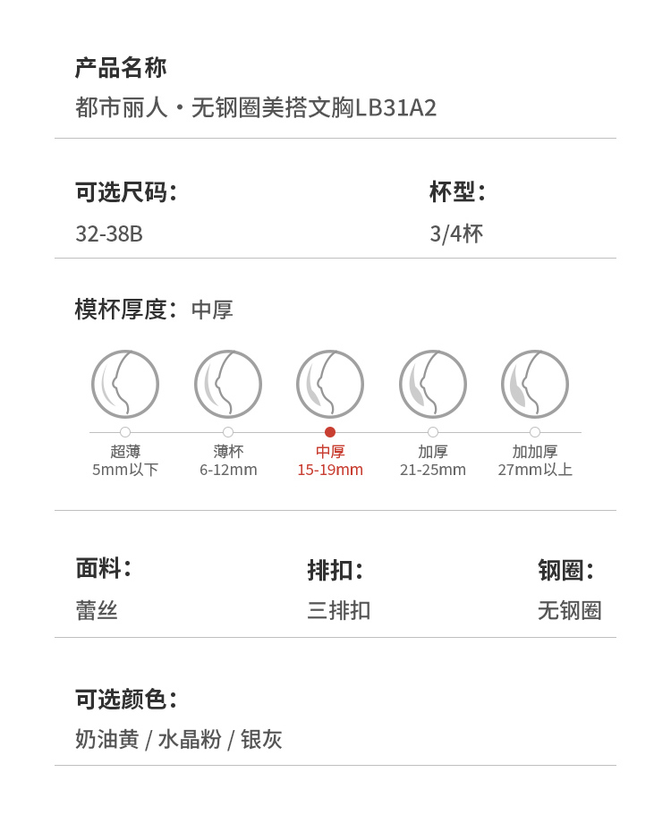 都市丽人自然舒适常规内衣B中厚3/4杯蕾丝文胸三排无钢圈LB31A2