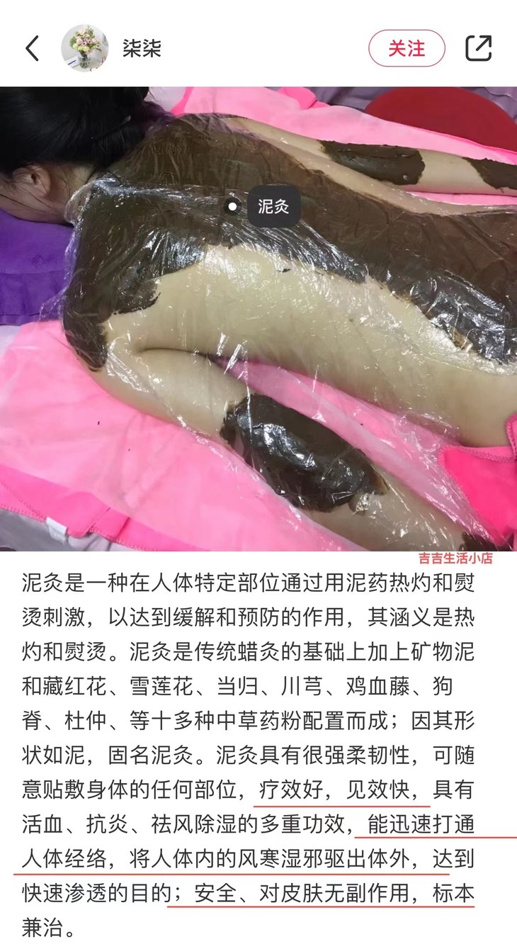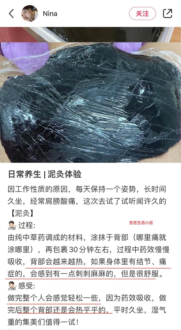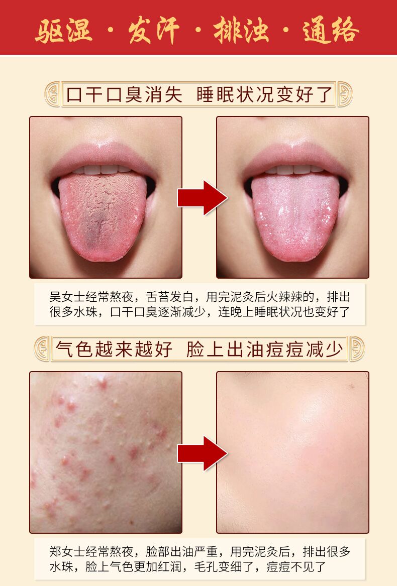 泥灸热敷于皮肤上,可深入人体内部升温,达到深层排汗,甚至是排出晶体的效果,相当于给细胞洗了个热水澡。排出的都是湿气,寒气,浊气