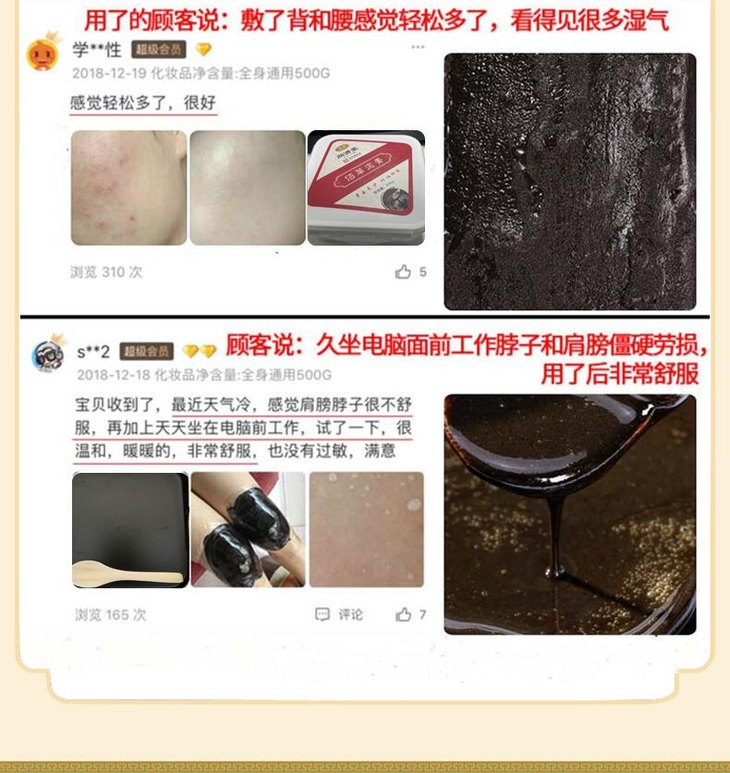 顾客的使用反馈都很这款泥灸是在传统蜡灸的基础上加上矿物泥和艾草、益母草、柴胡、甘草、番红花等多种珍稀药材配置而成,因其形状如泥,故名泥灸。