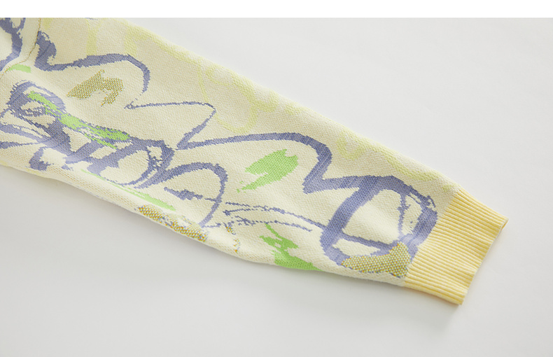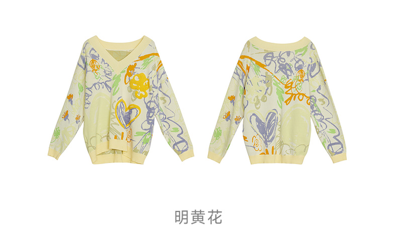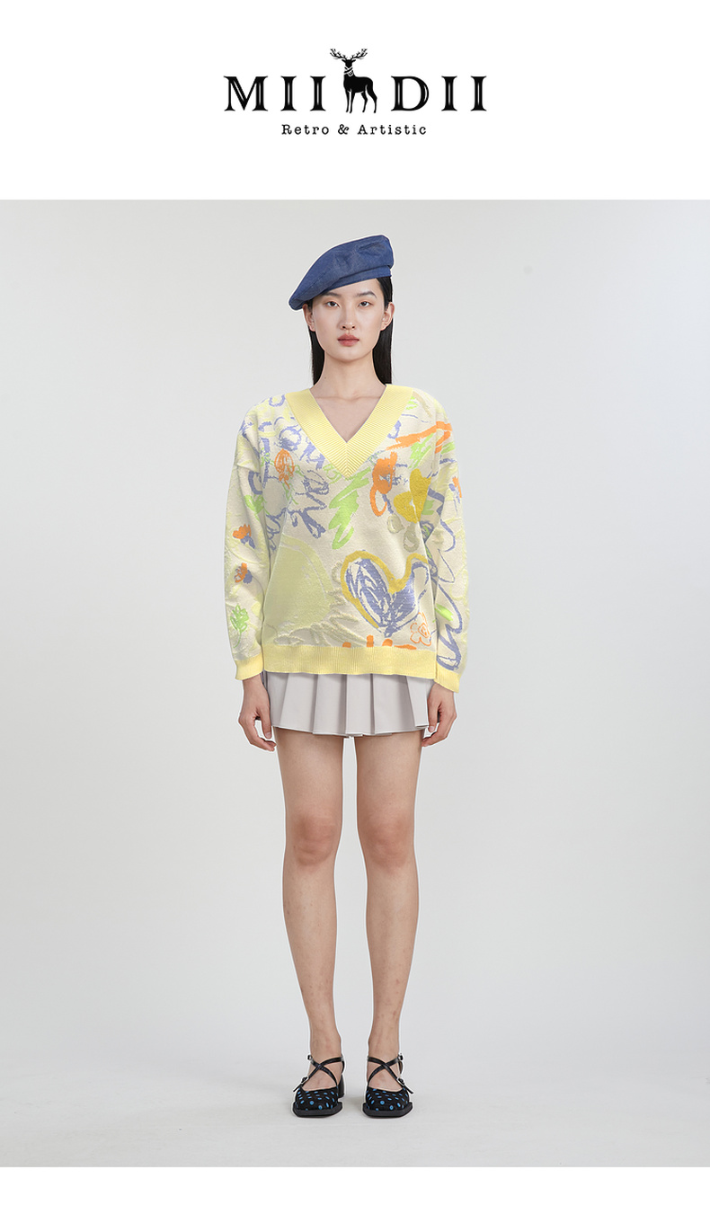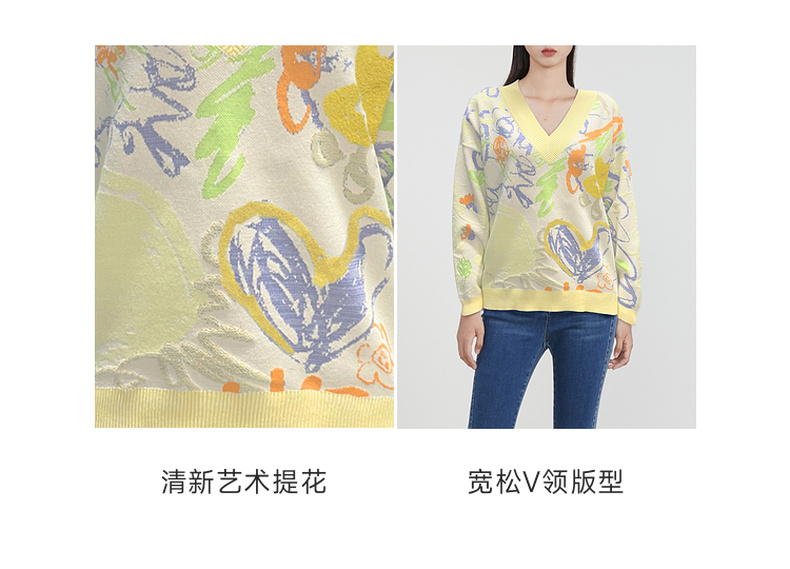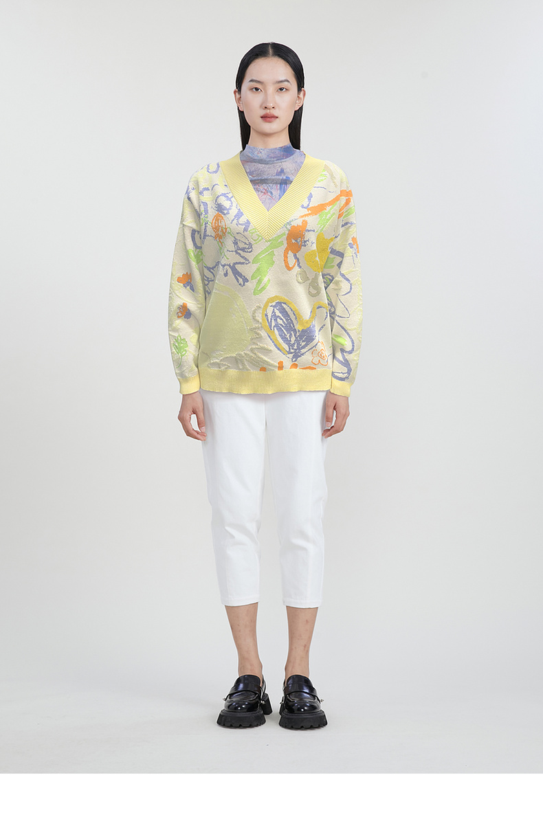 谜底V领套头针织衫女2023春季新款复古主题花色毛衫长袖231MZ0302