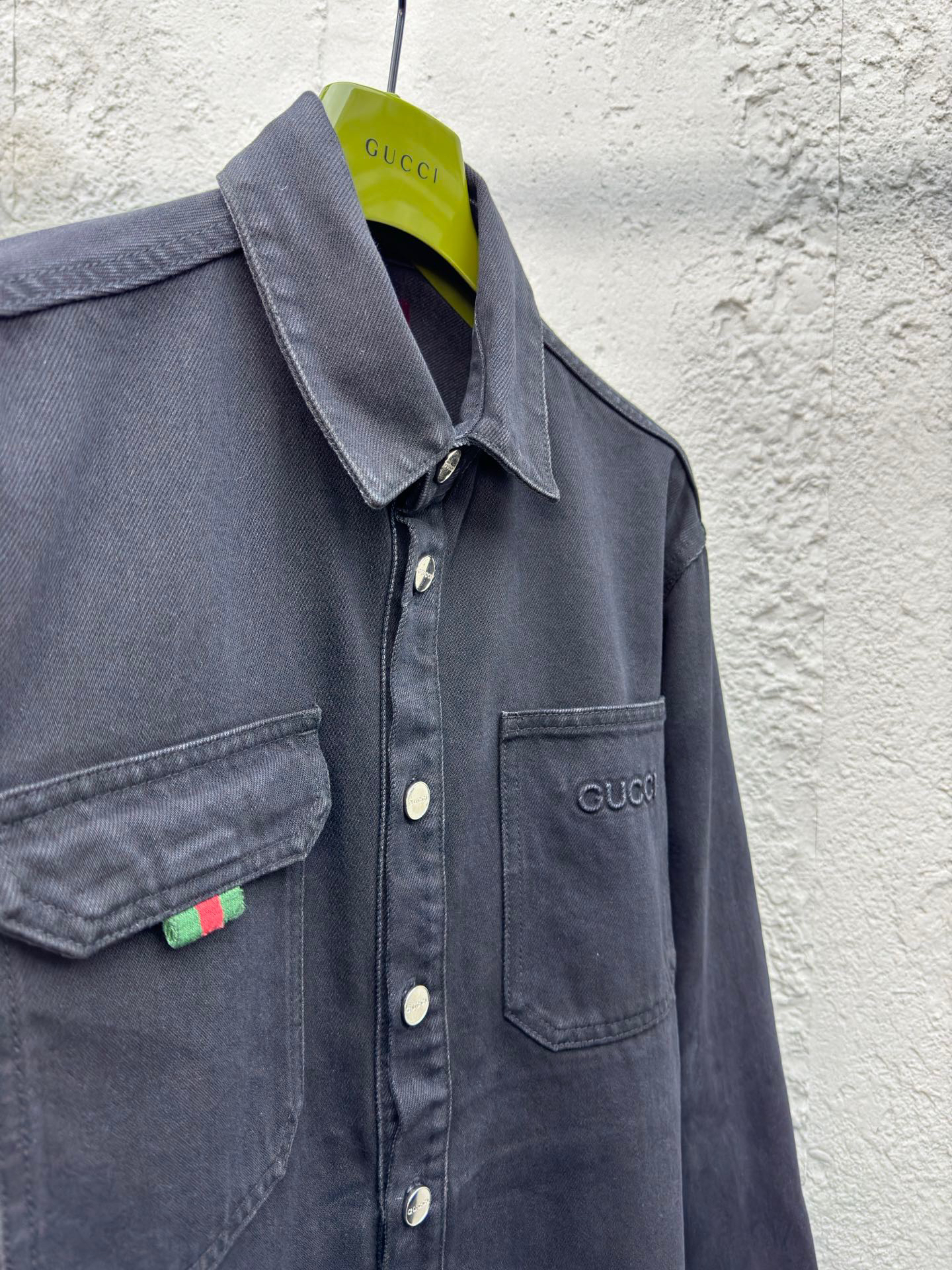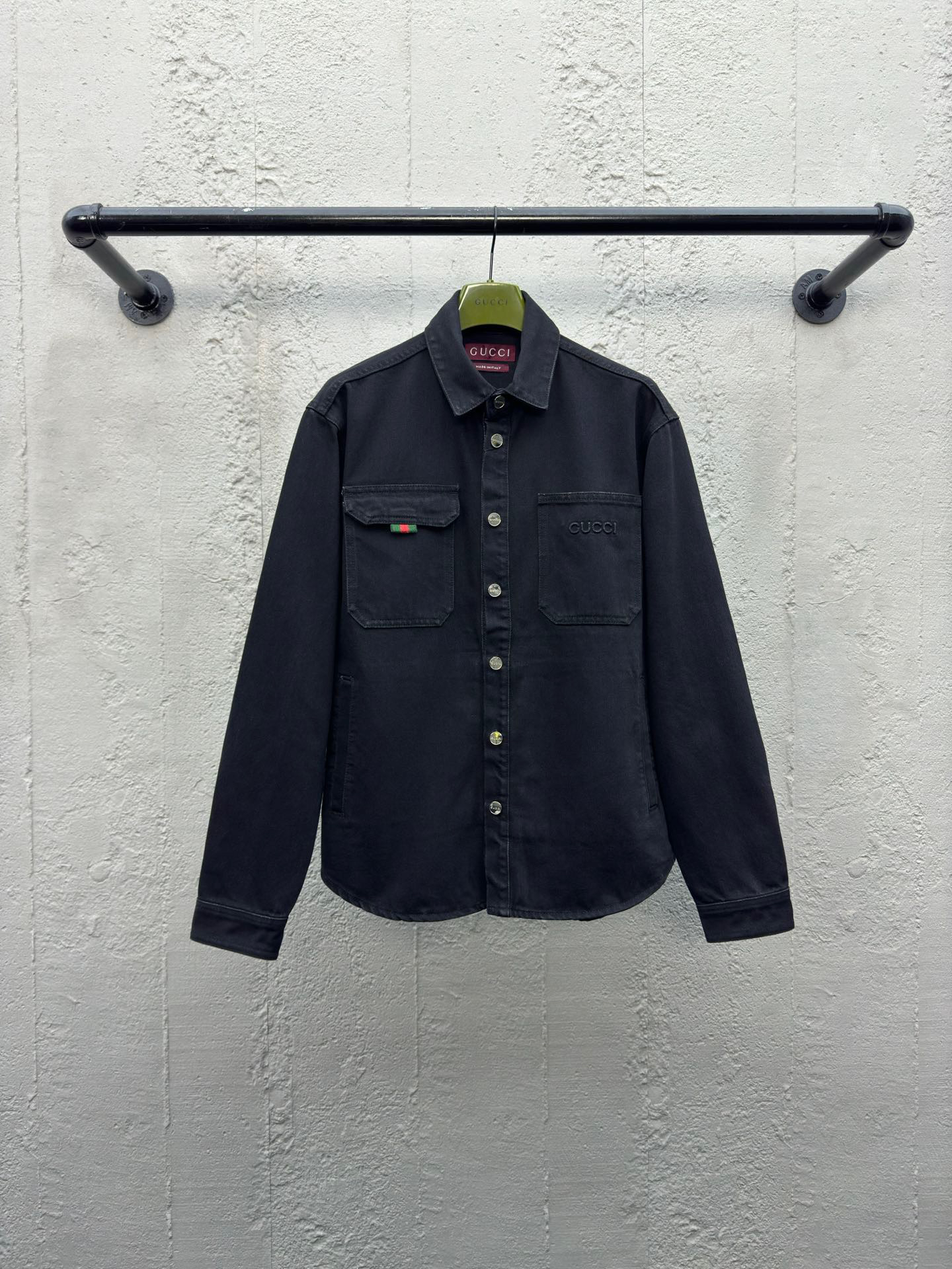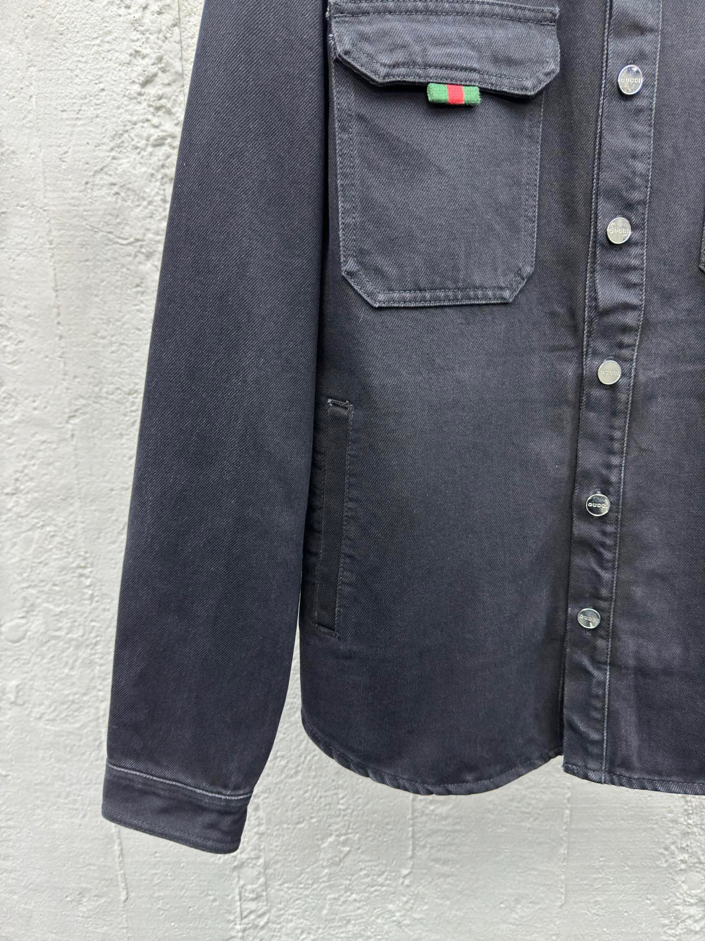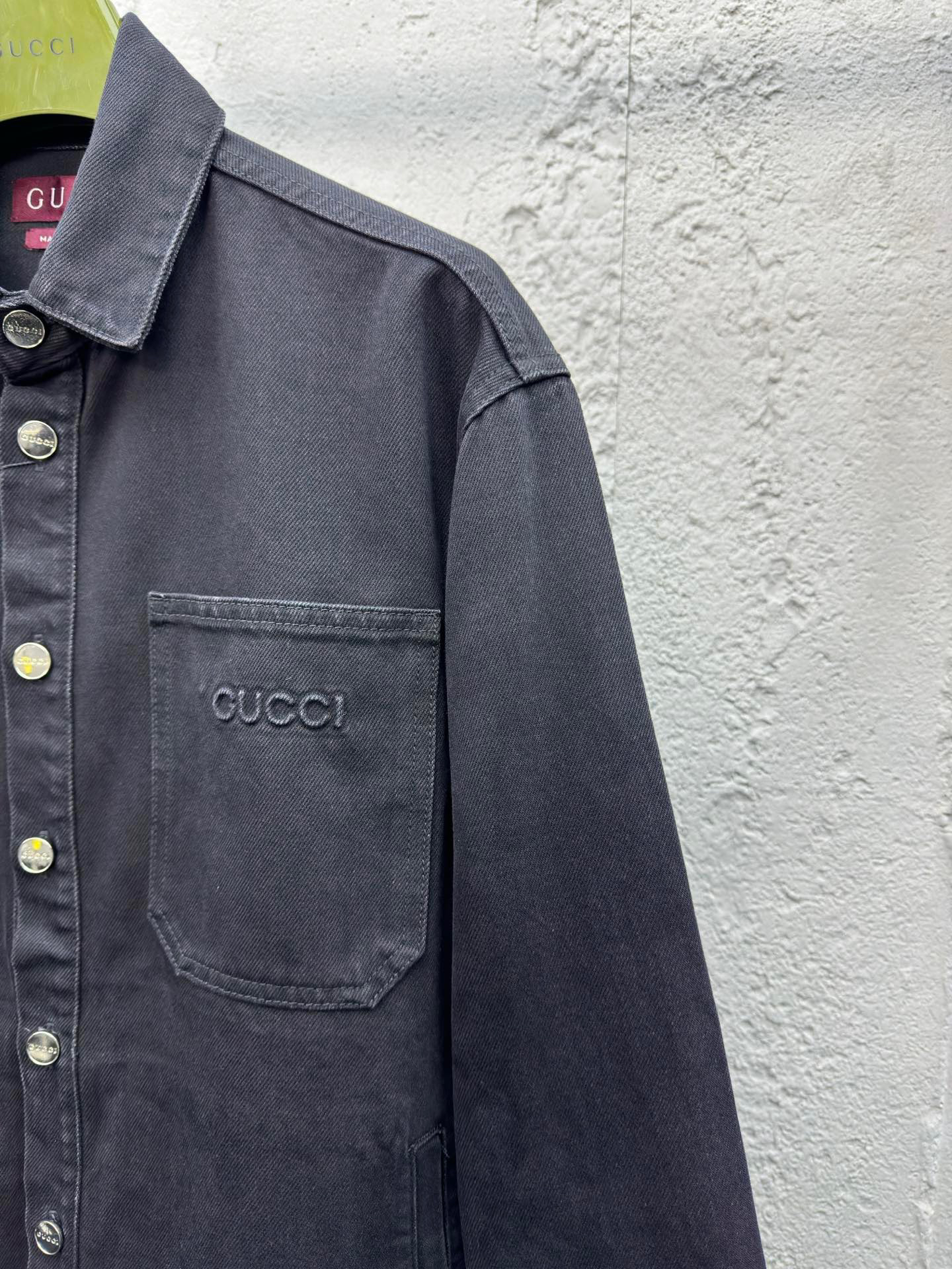 工艺说明:深色配色匠心演绎早秋氛围感满溢的精致套装,朴实无华的色彩背后潜藏着复杂的内部构造和低调内敛的细节,简约而不简单。这款常规版型衬衫以石磨水洗丹宁面料匠心打造,巧妙融入Gucci刺绣和红绿织带 提环细节,令整个设计魅力倍增。能与同款搭配营造时尚造型,驾驭各种场合,定制辅料,三标齐全,男女同款!