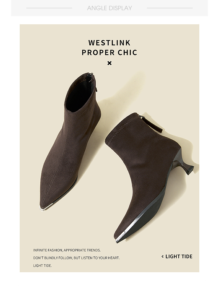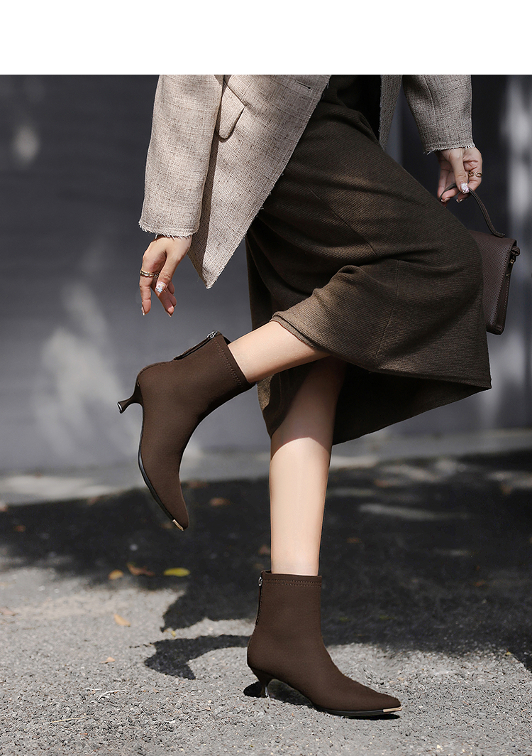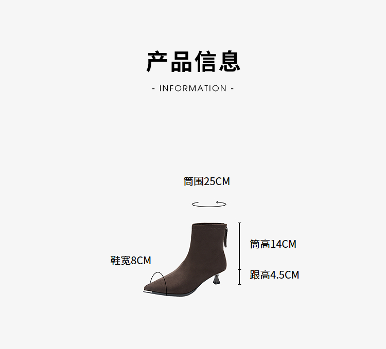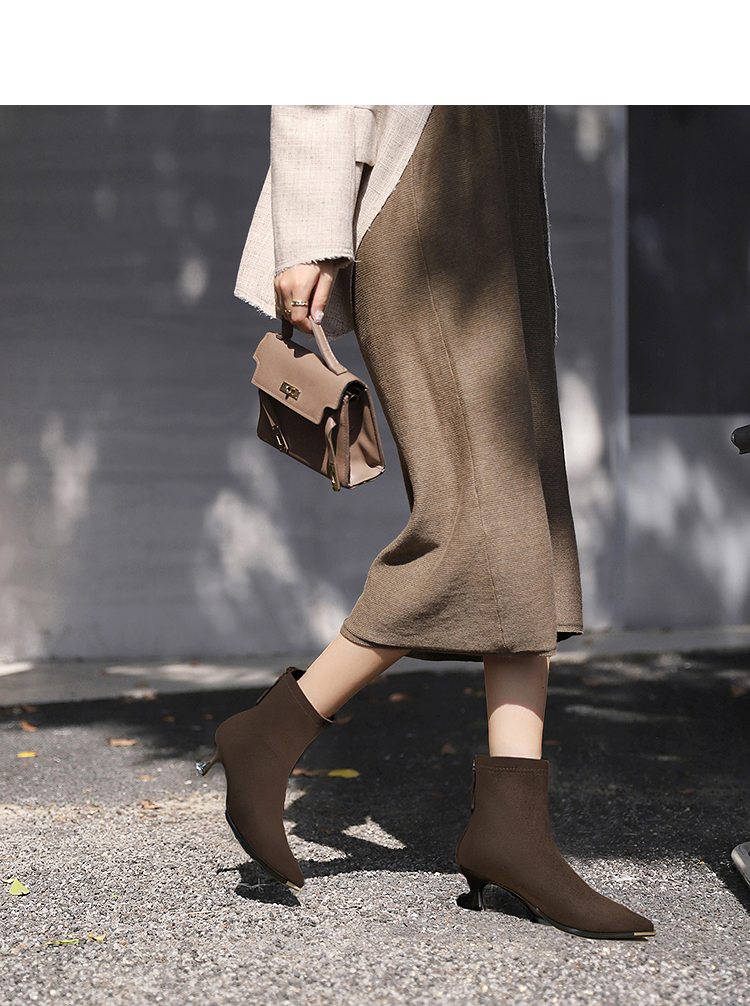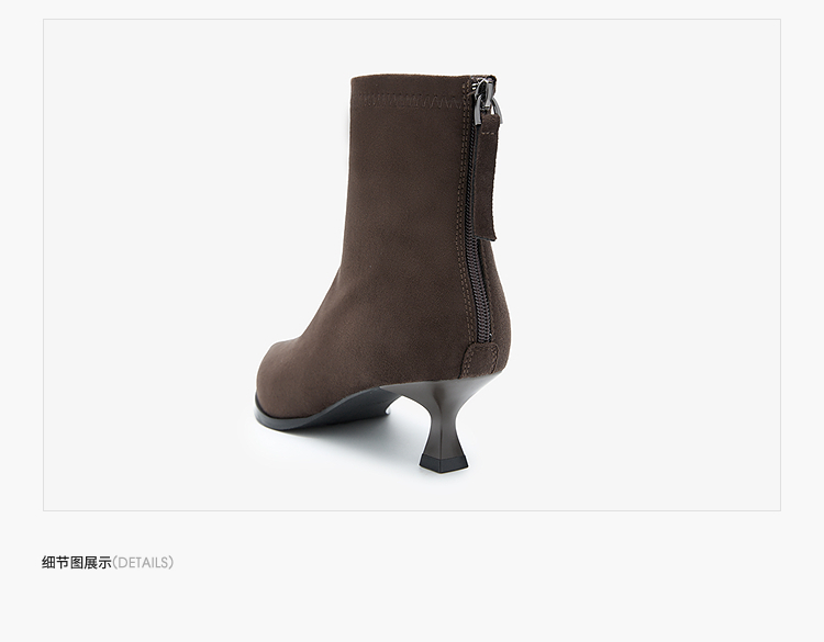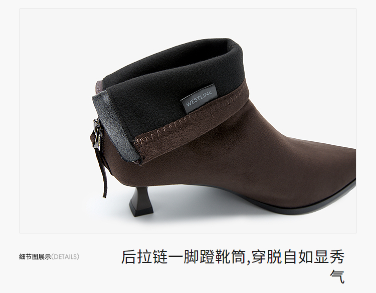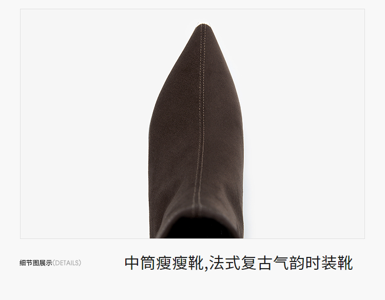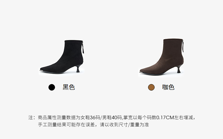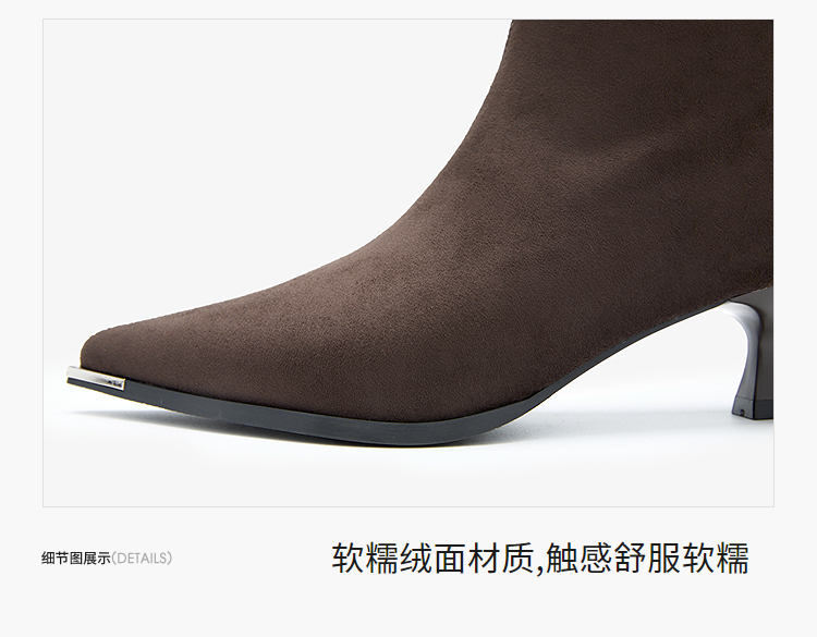 西遇尖头短靴女新款秋冬细跟高跟鞋绒面洋气法式黑色瘦瘦靴V2257149