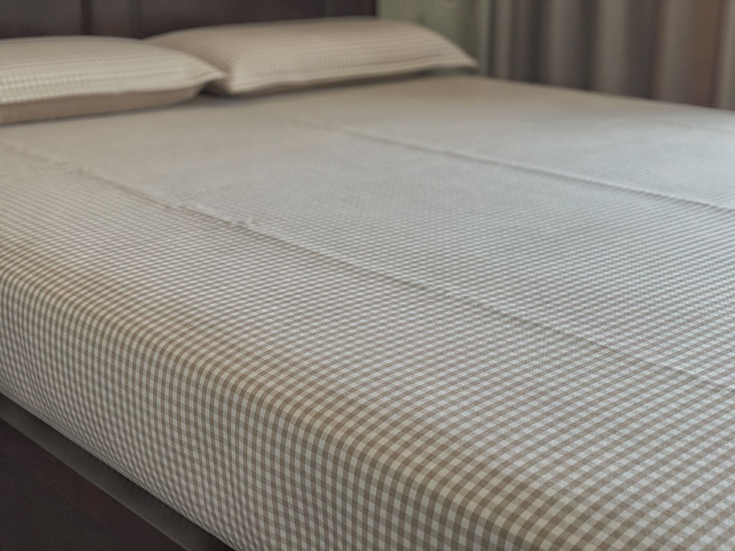 凉席表层天然竹纤维纱布,反面是三明治透气网布,网布的使用增加了透气性,柔软性,但是整体手感是有点轻的不是像亚麻一样沉沉的有点轻飘,但是凉席四角有绑带可以固定。