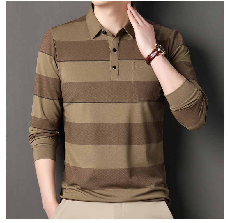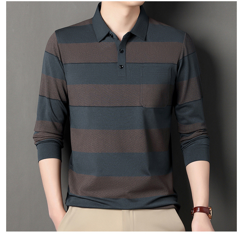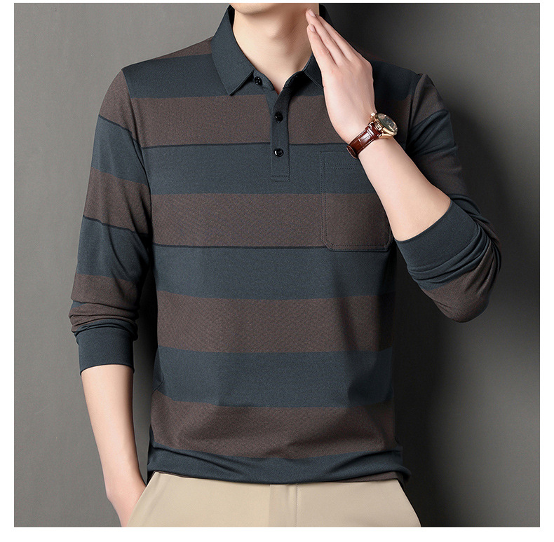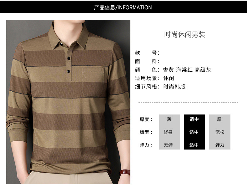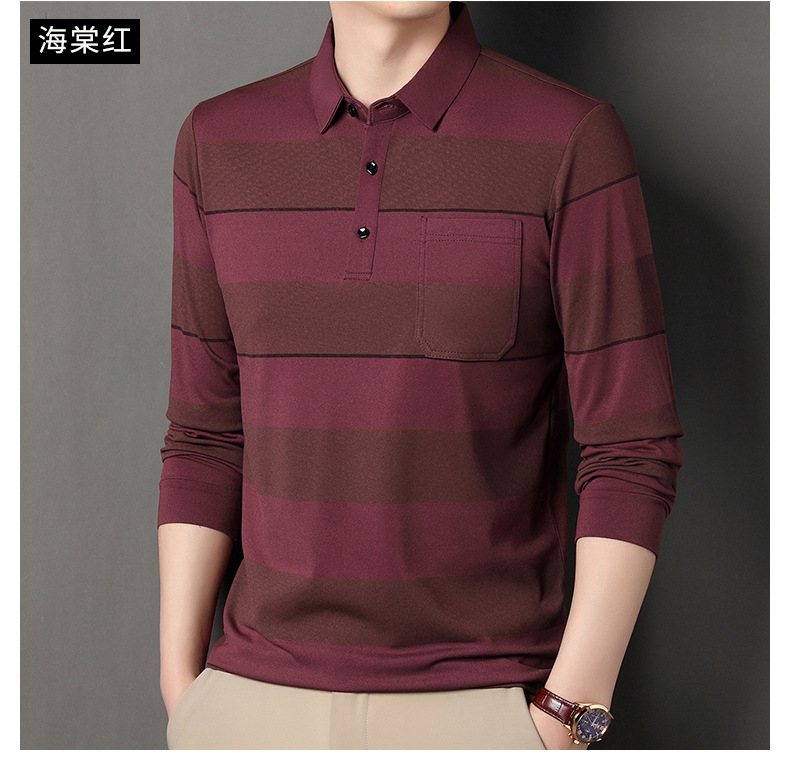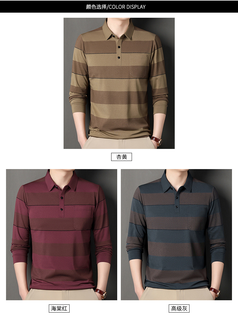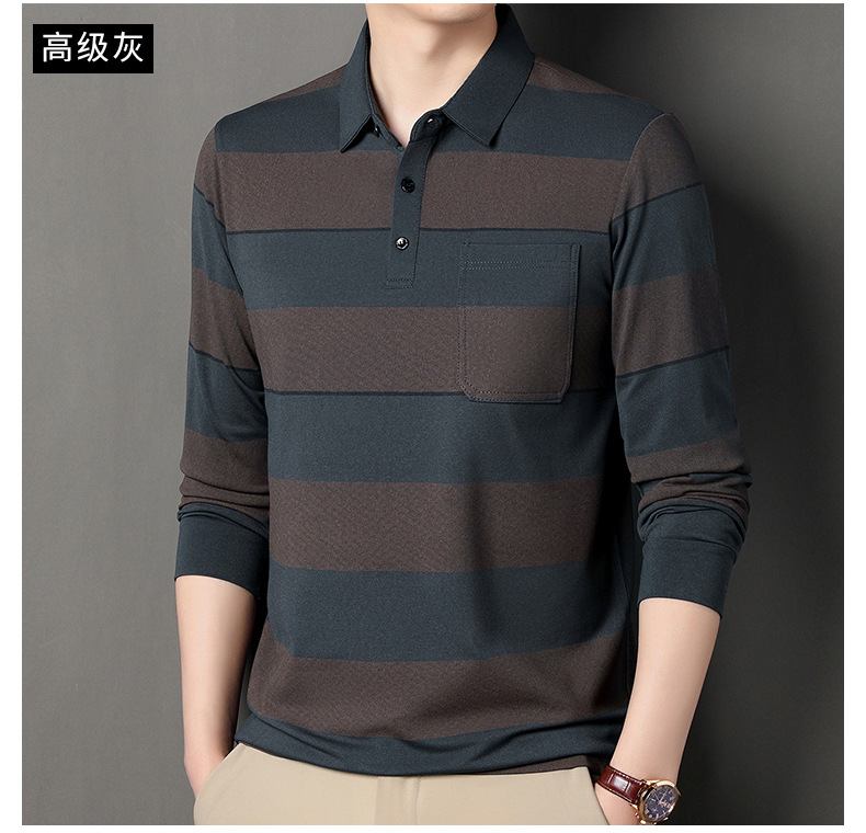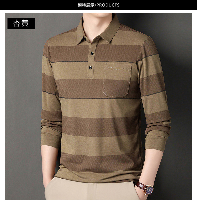 2024年春秋季新款男士t恤衫休闲翻领条纹长袖中年套头打底上衣男商务正装长袖上衣