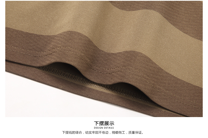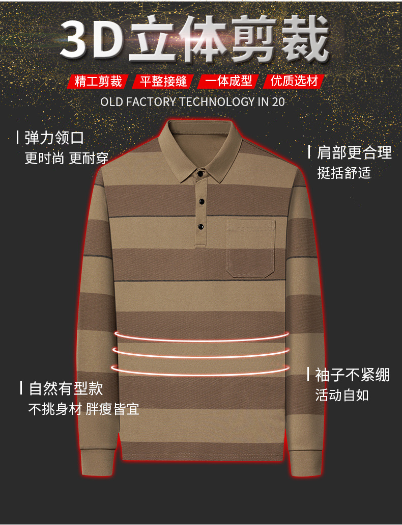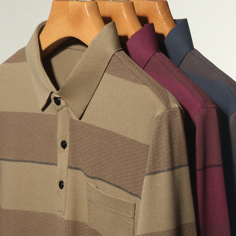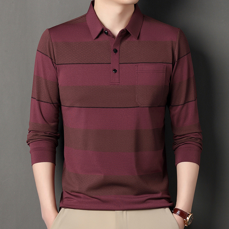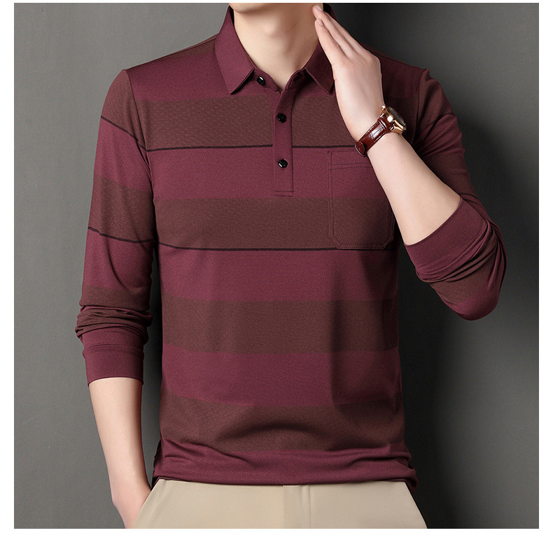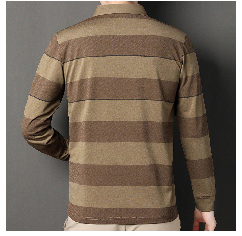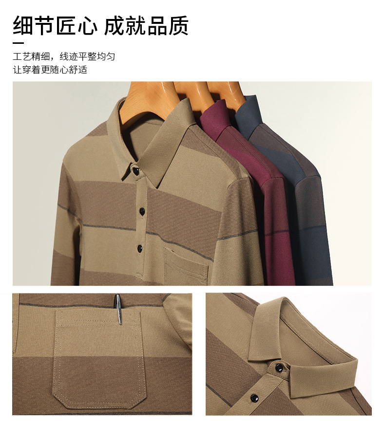 2024年春秋季新款男士t恤衫休闲翻领条纹长袖中年套头打底上衣男商务正装长袖上衣