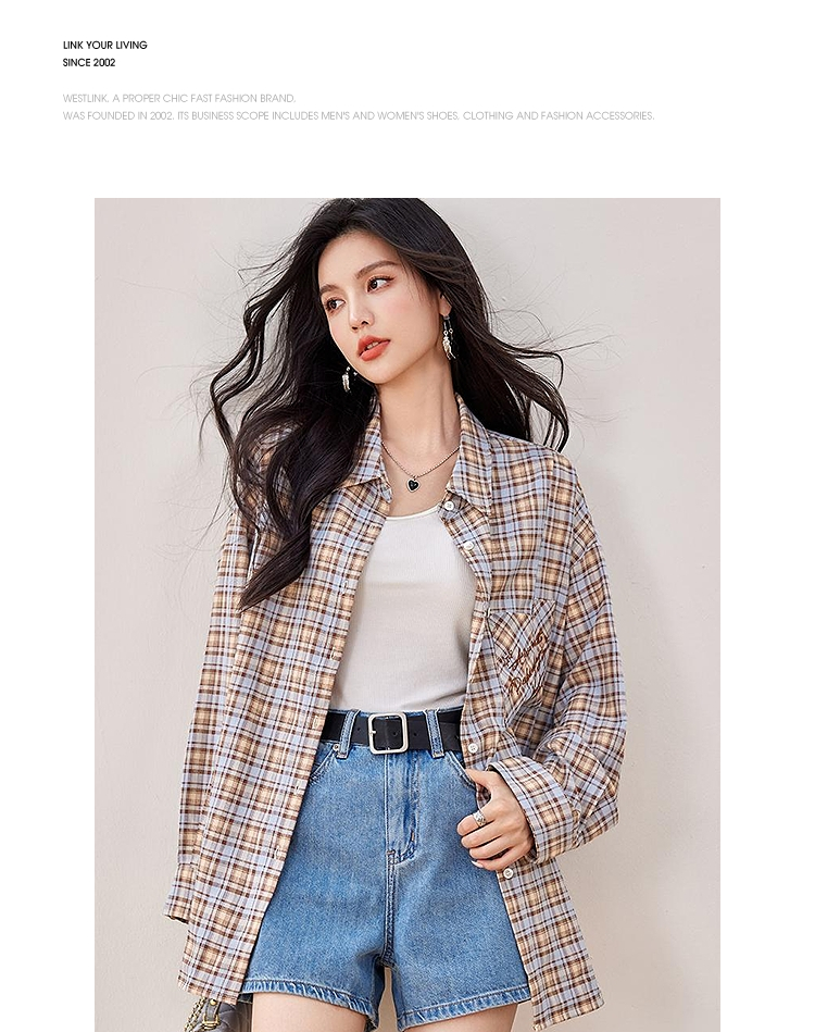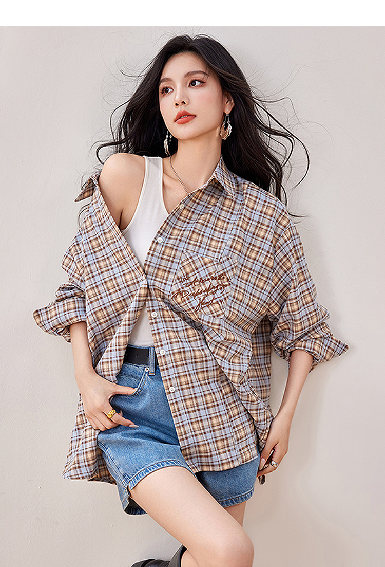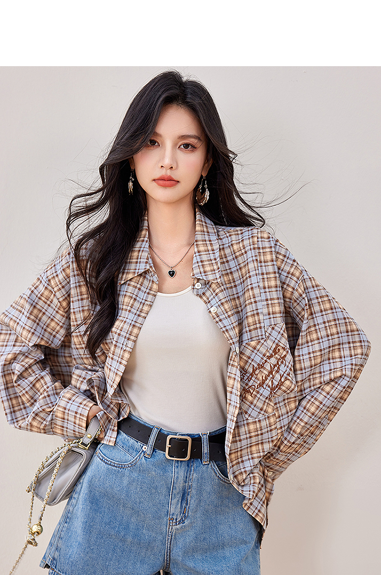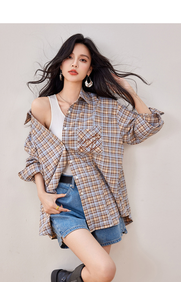 西遇复古翻领格子衬衫女2026年春季新款慵懒风宽松休闲刺绣衬衣SS060155