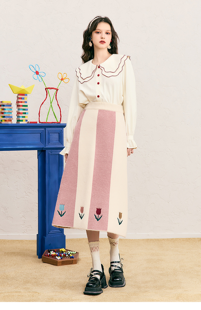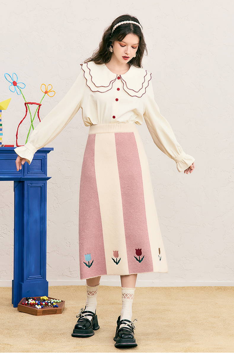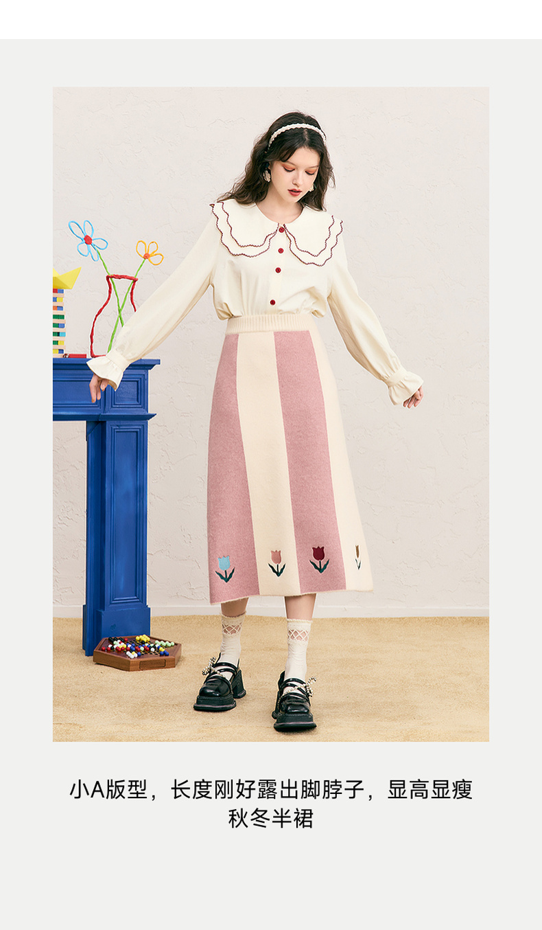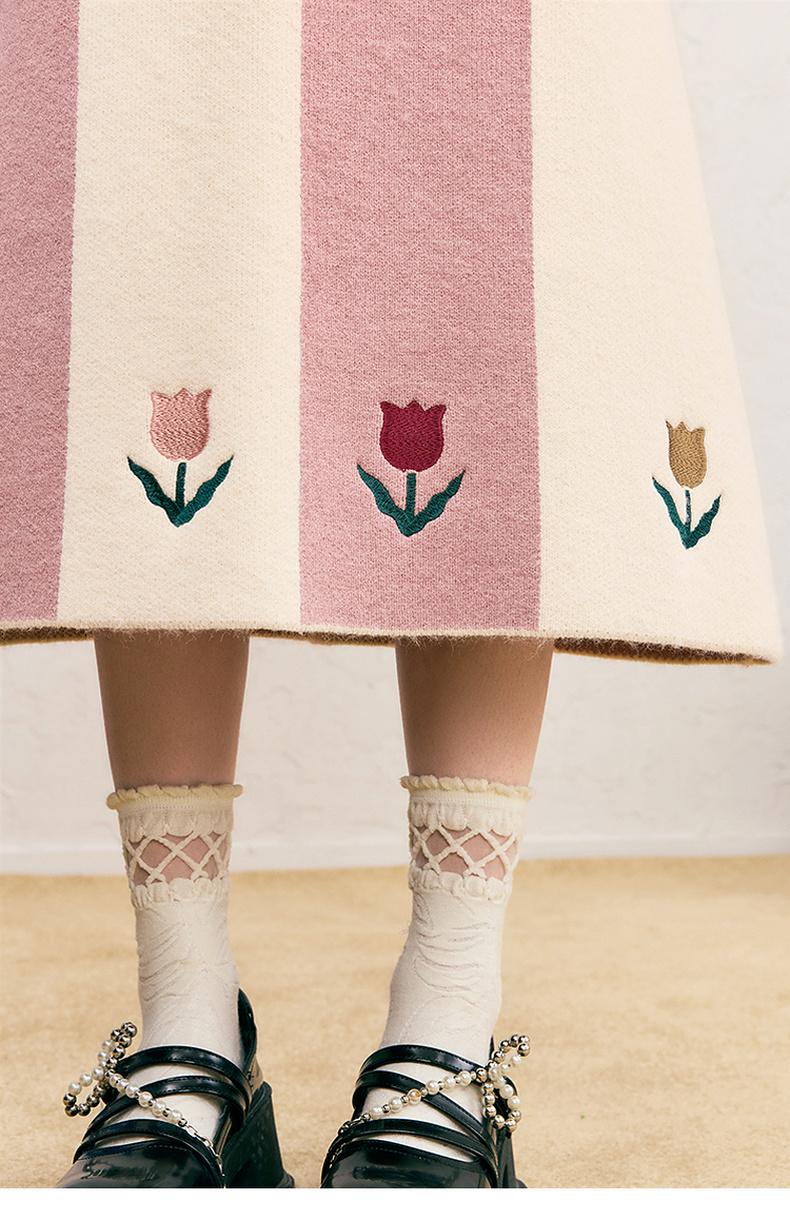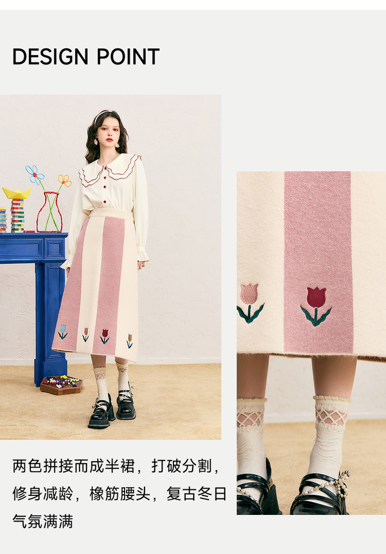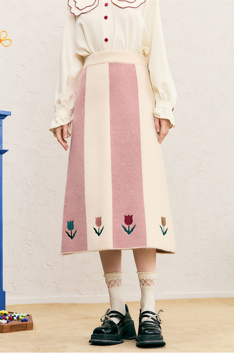 两三事 恋恋郁香 2024冬季新款甜美郁金香绣花拼色针织半身裙长裙