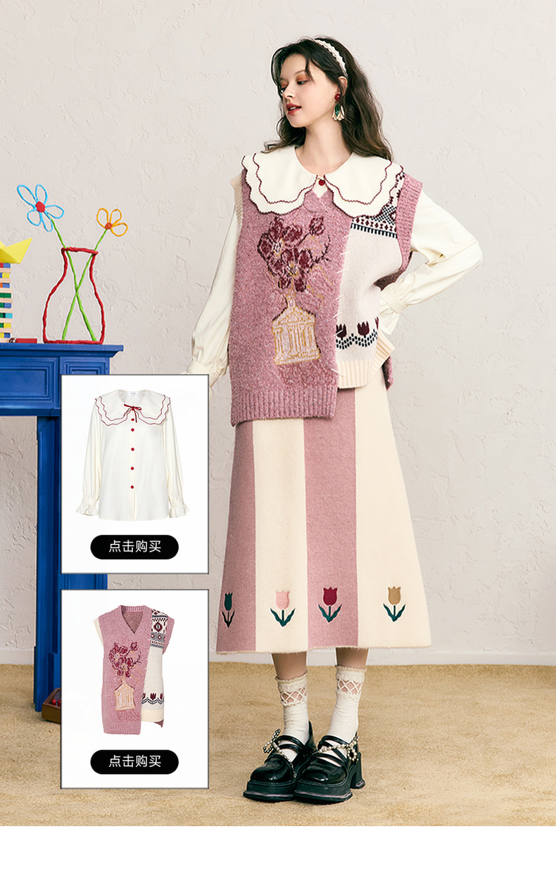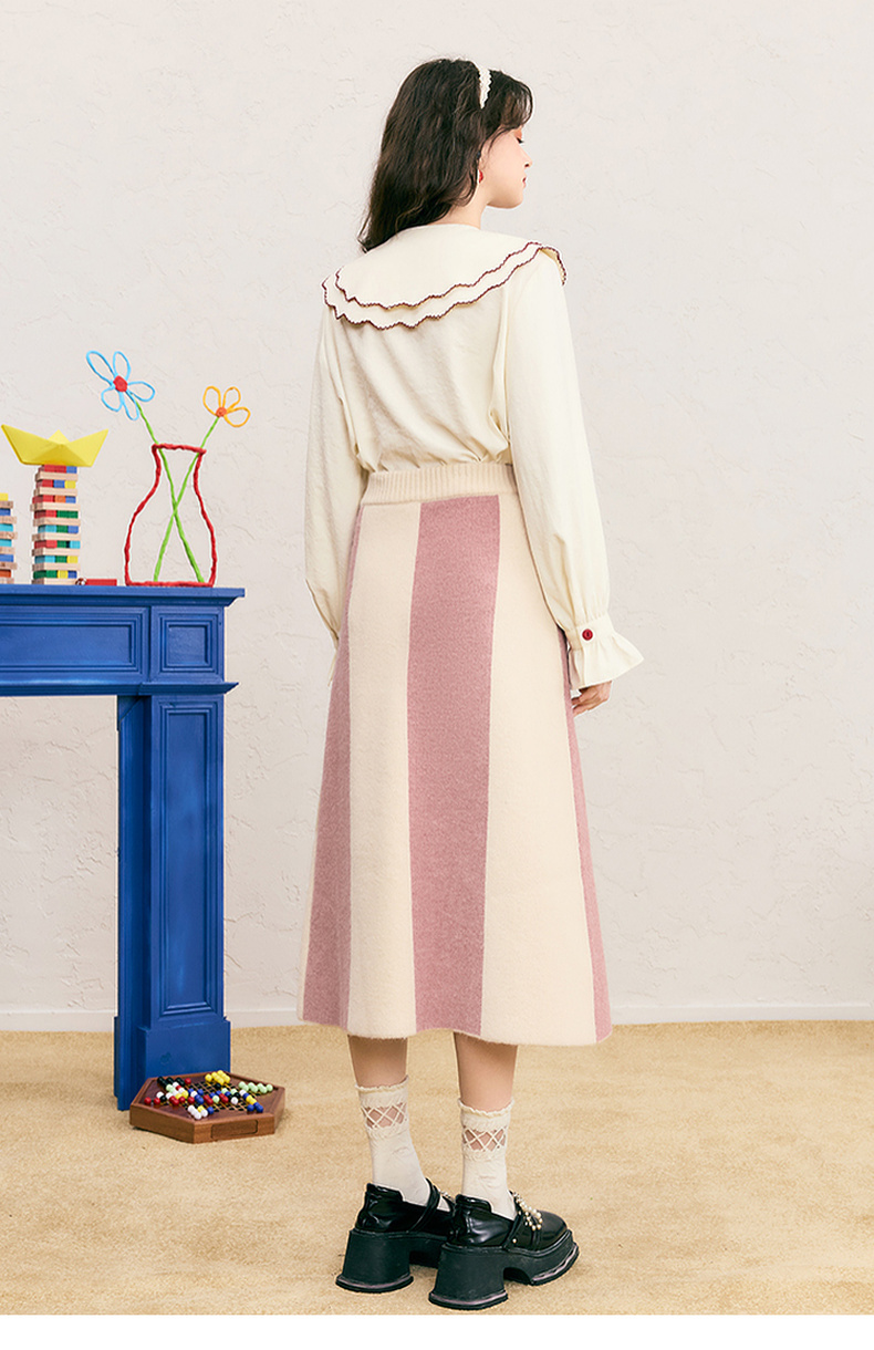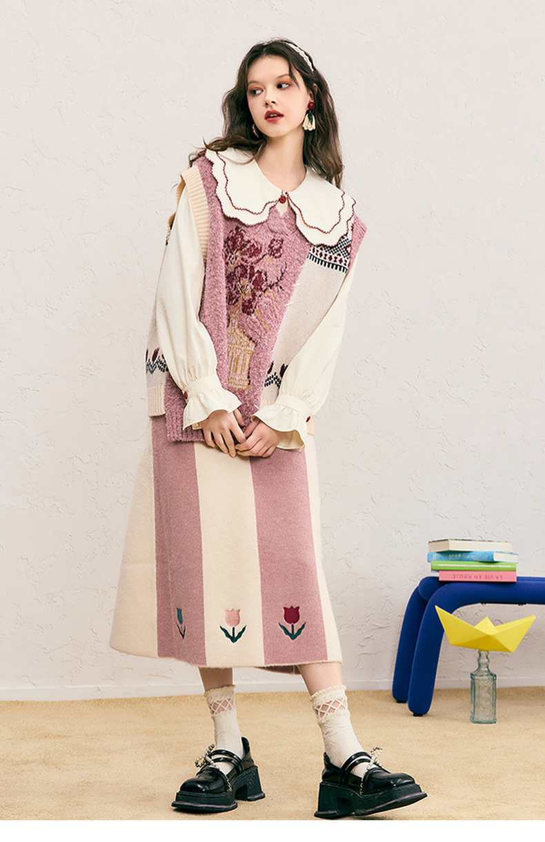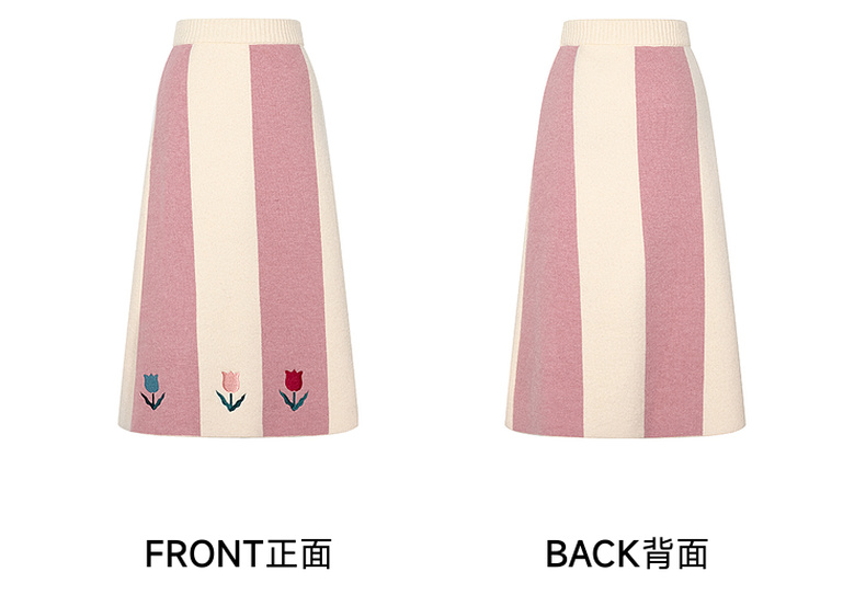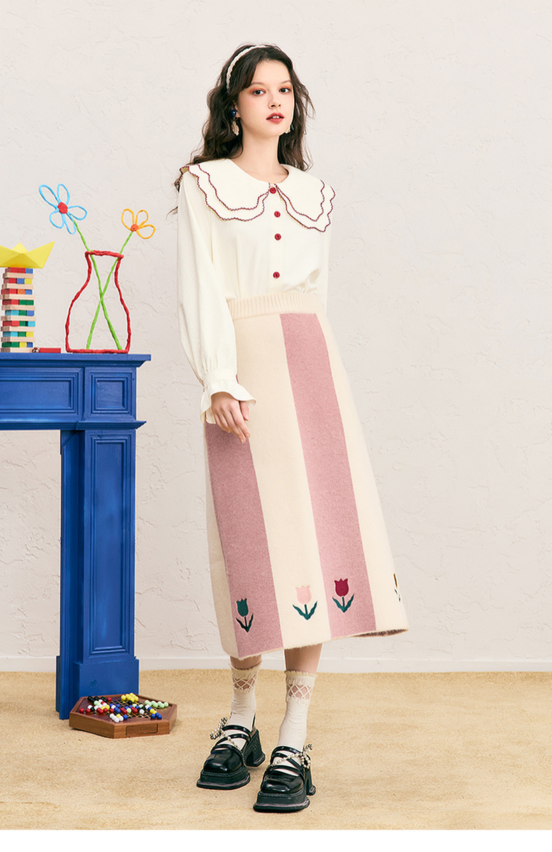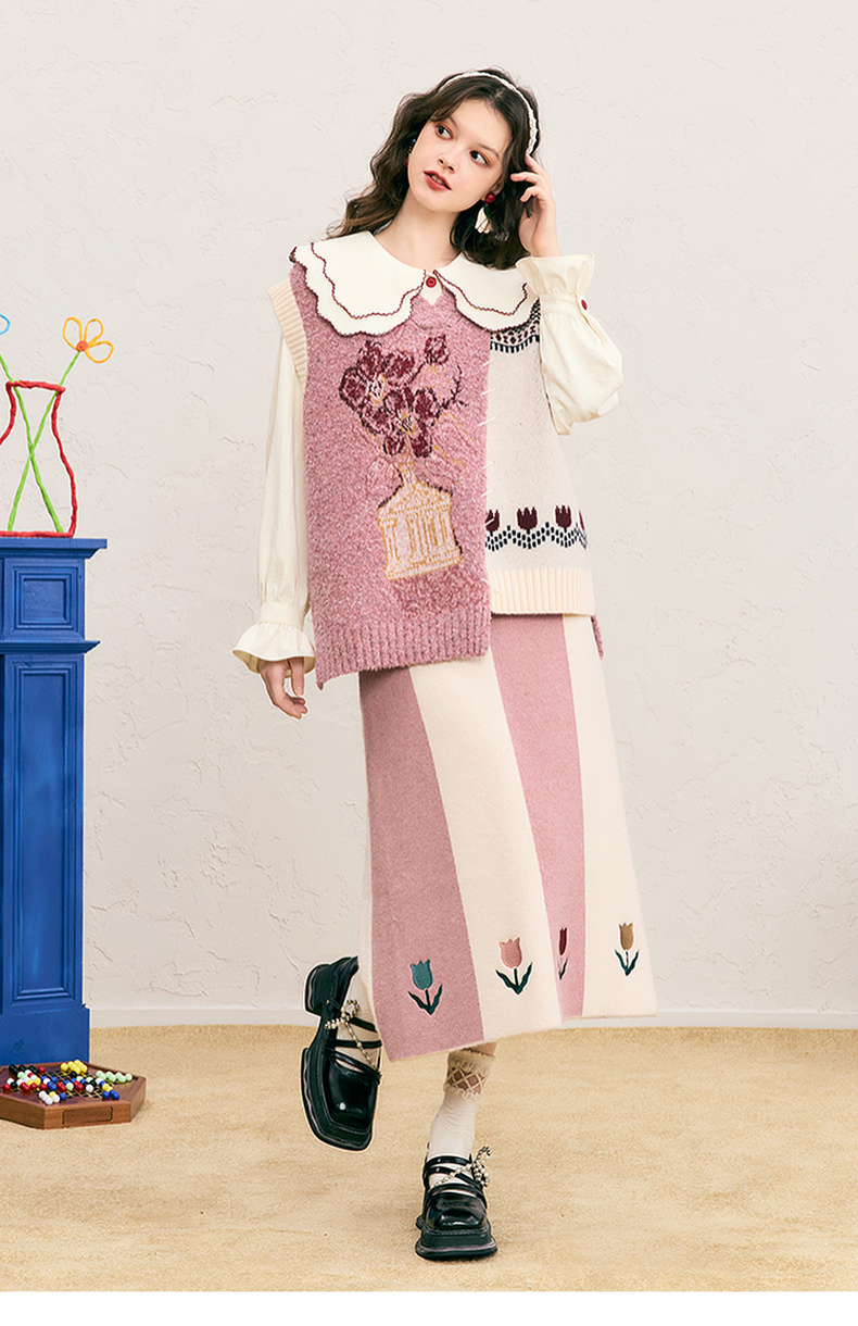 两三事 恋恋郁香 2024冬季新款甜美郁金香绣花拼色针织半身裙长裙