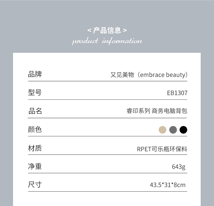 【自营】又见美物 轻商务时尚潮流环保RPET大容量休闲电脑背包旅行潮流
