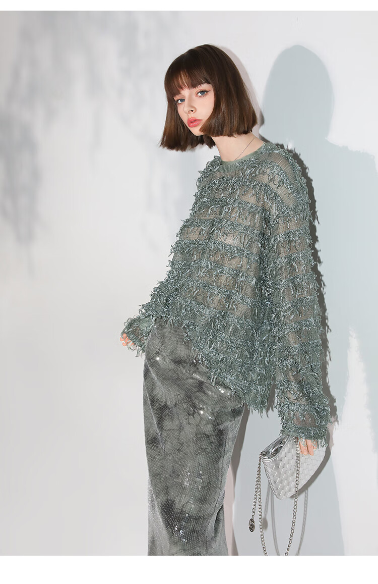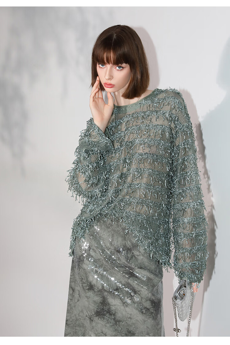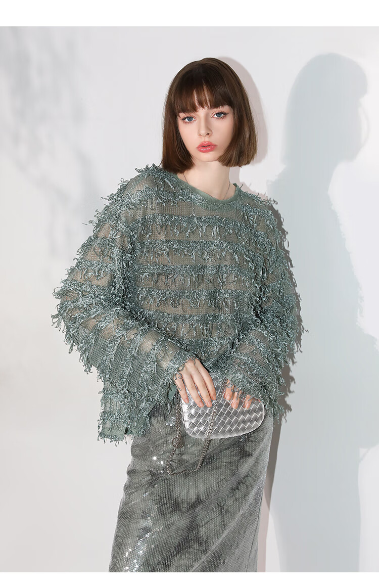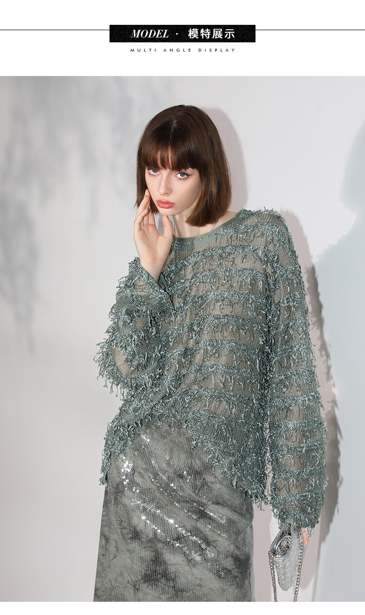COCOBELLA设计感微透视流苏罩衫早秋名媛风毛边针织衫SE7006
