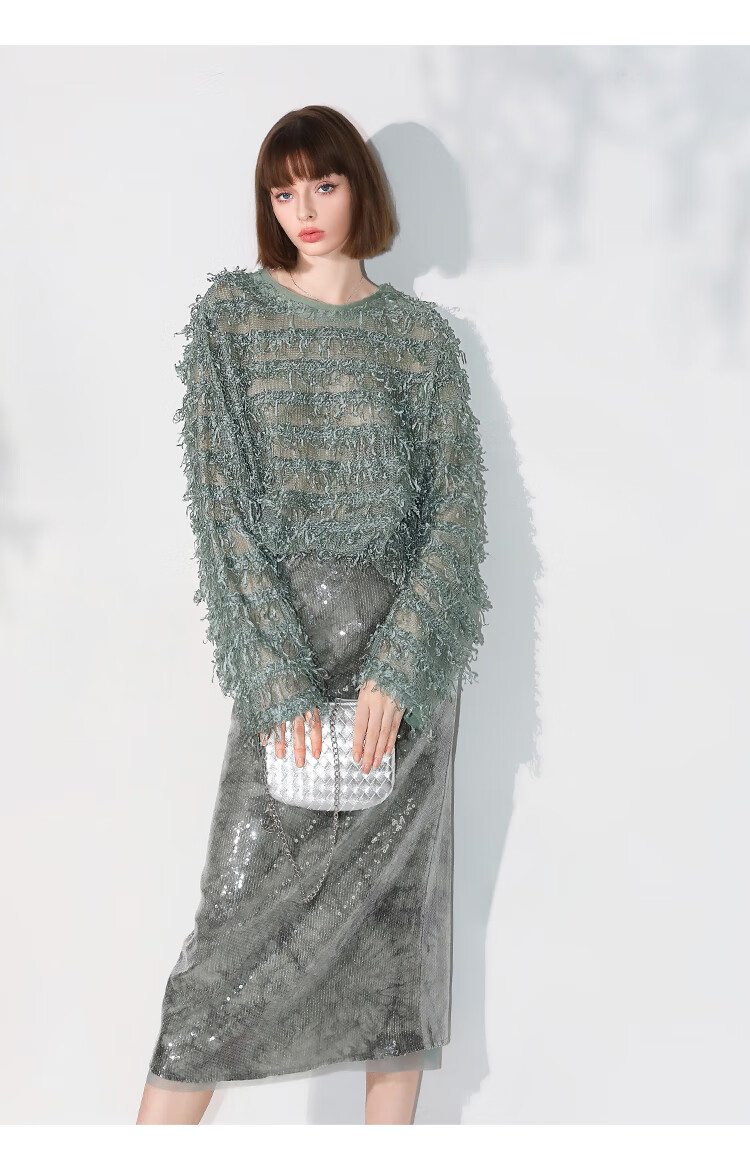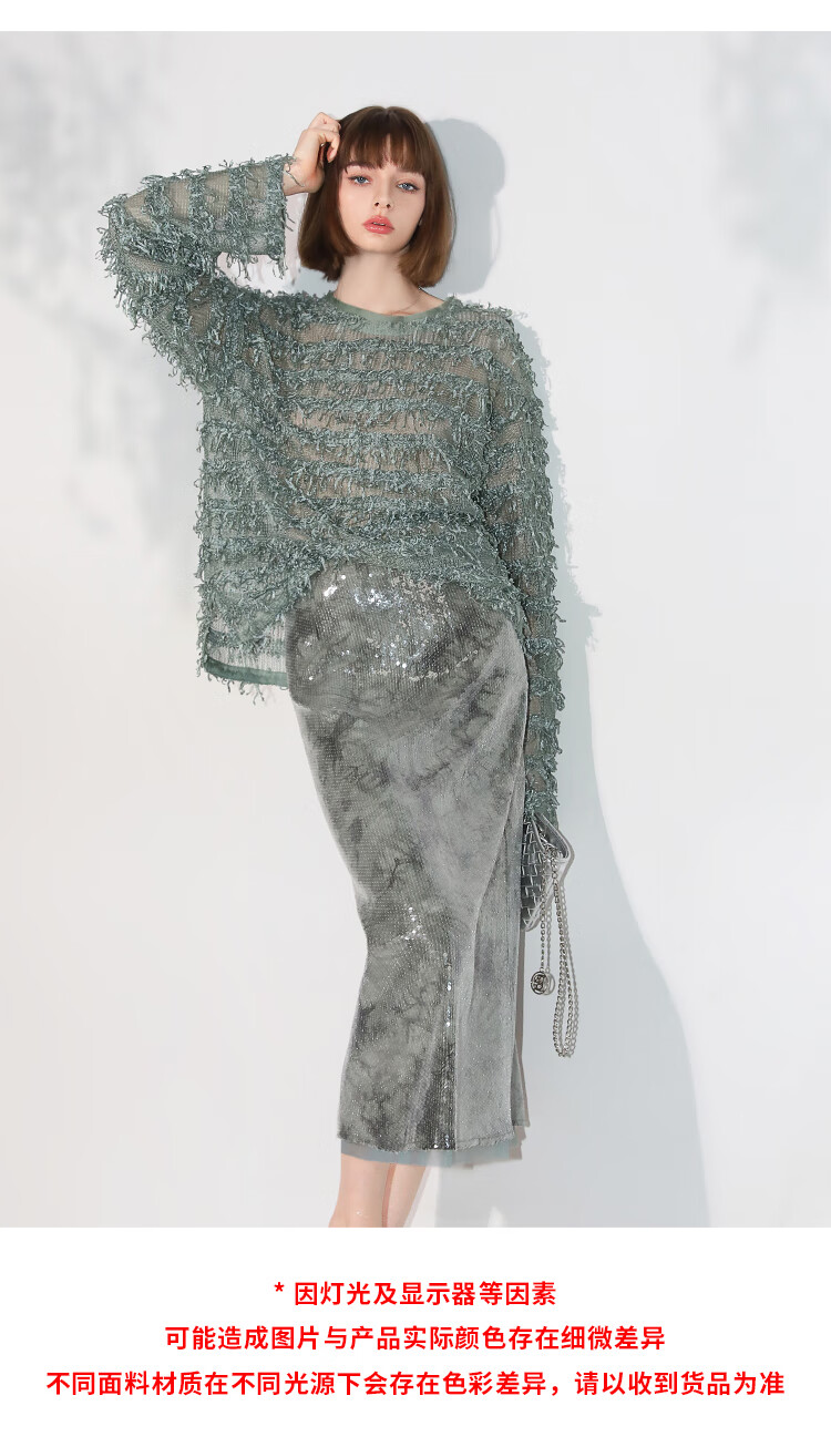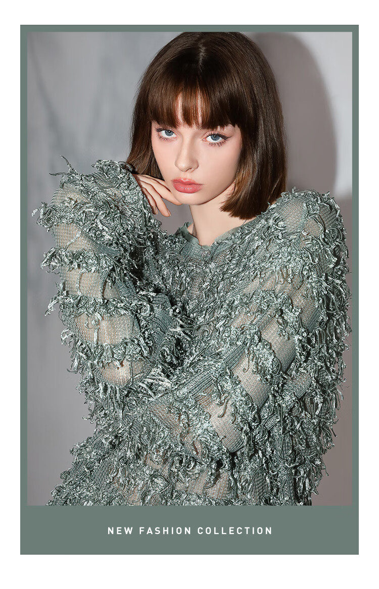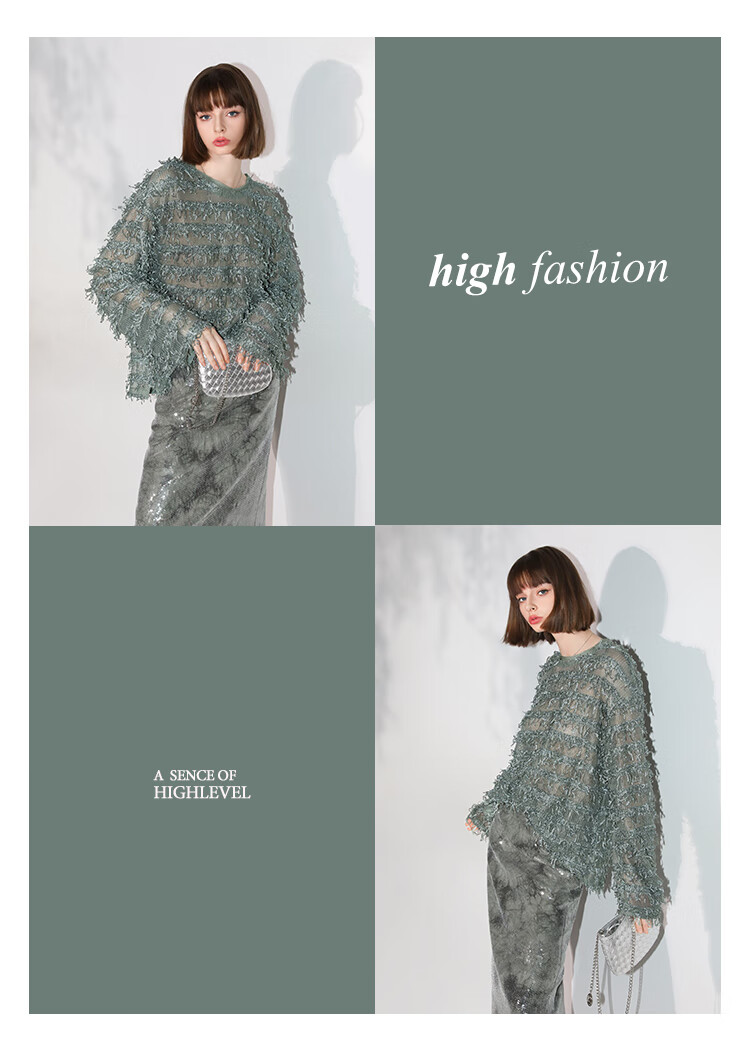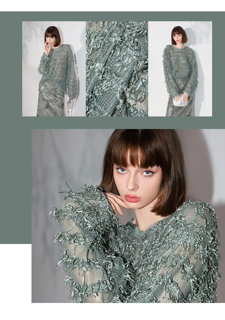 COCOBELLA设计感微透视流苏罩衫早秋名媛风毛边针织衫SE7006