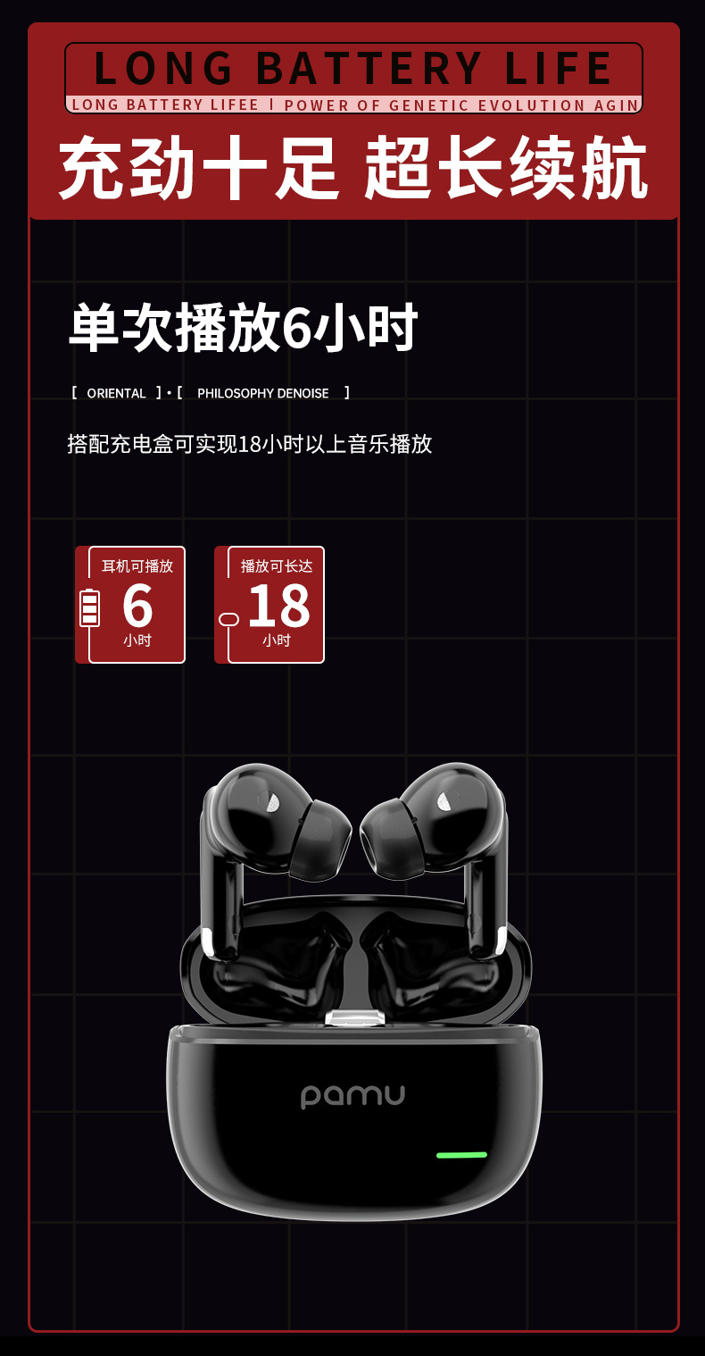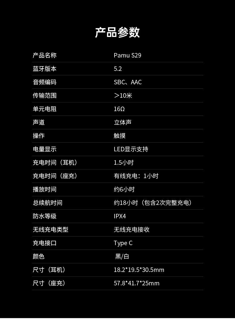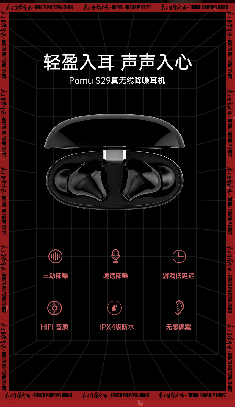 Pamu S29真无线降噪耳机 | 主动宽频降噪技术,通话降噪;开盖即连双主机,单耳模式,双耳模式使用,极轻人耳工学设计,舒适佩戴