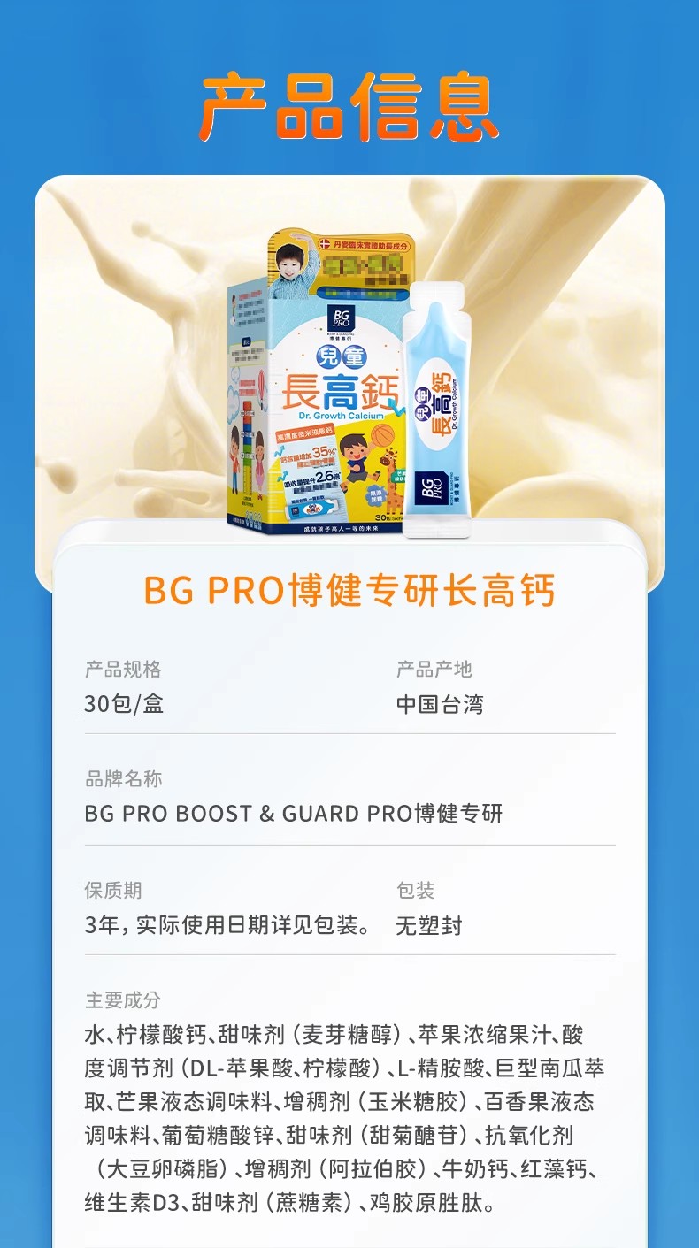博健专研BG Pro长高钙即饮液30条液体钙 儿童长高钙