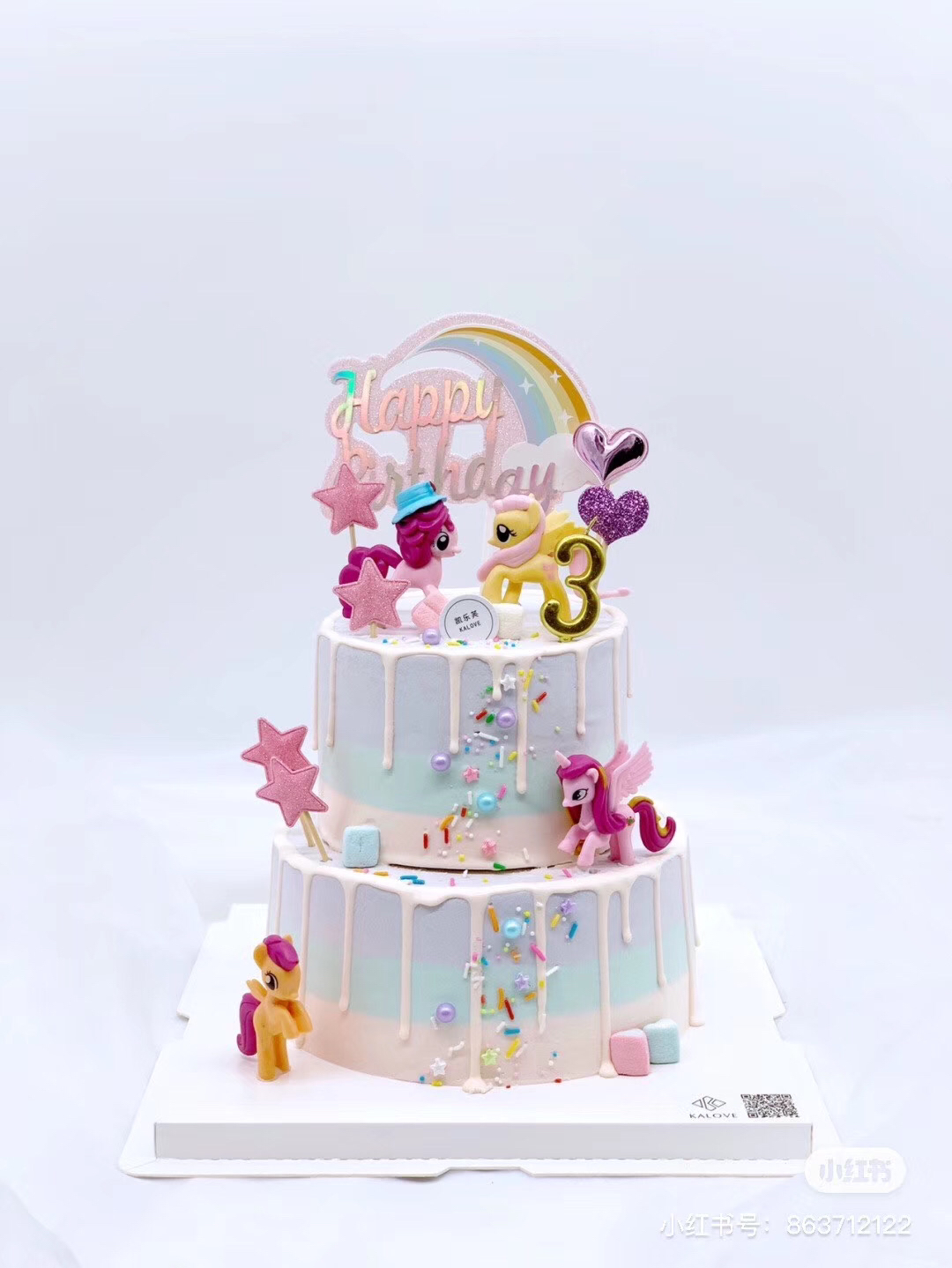 可爱女宝宝小马宝莉主题双层蛋糕,粉蓝色系颜值爆表