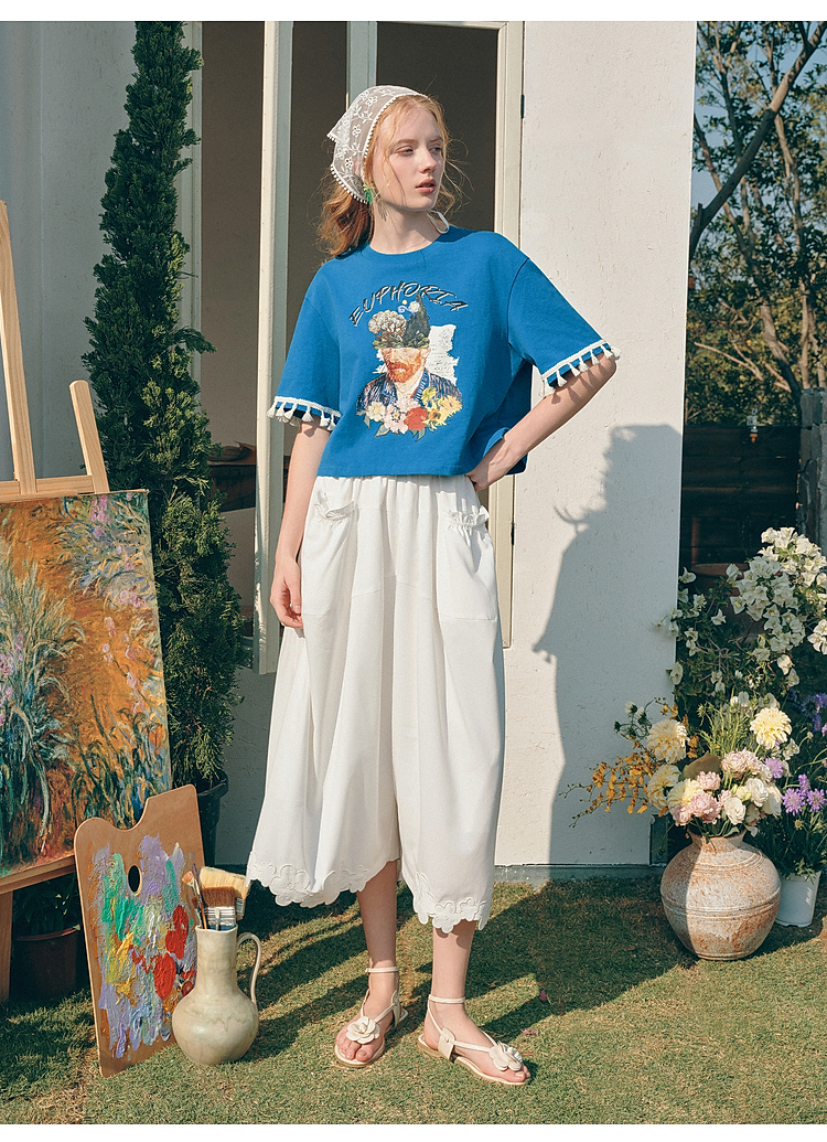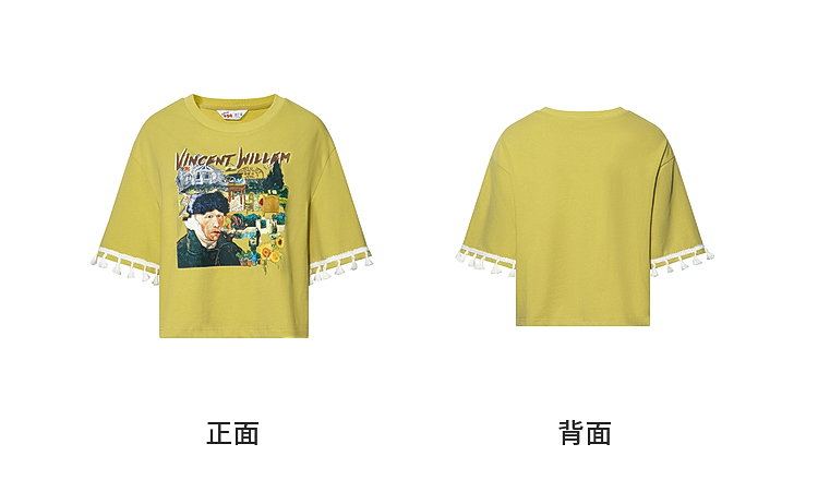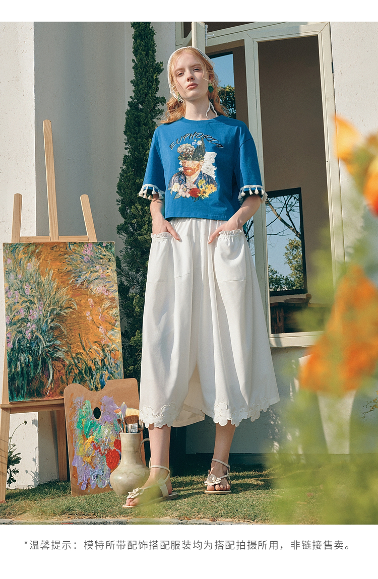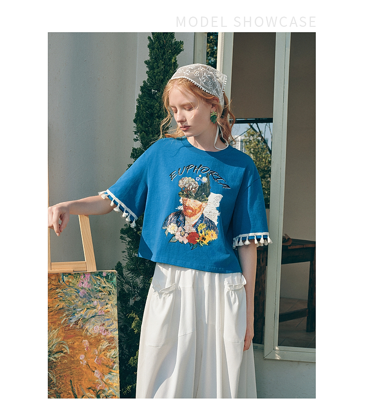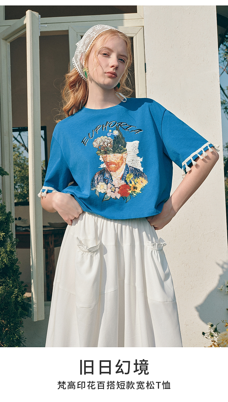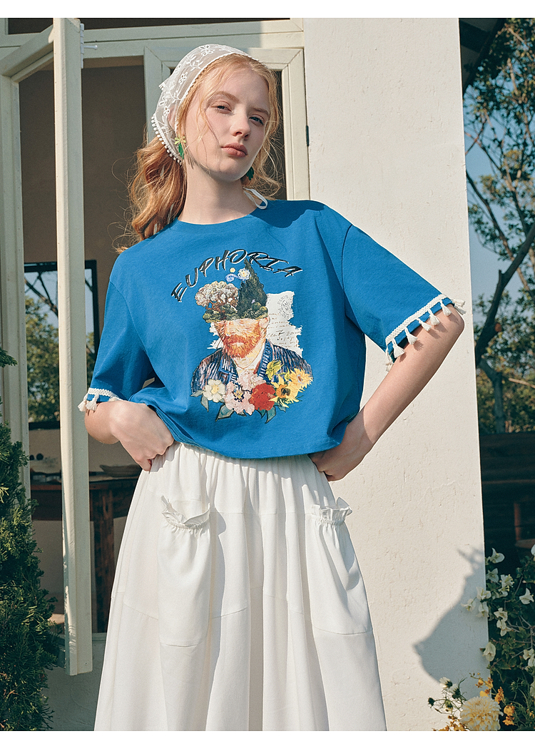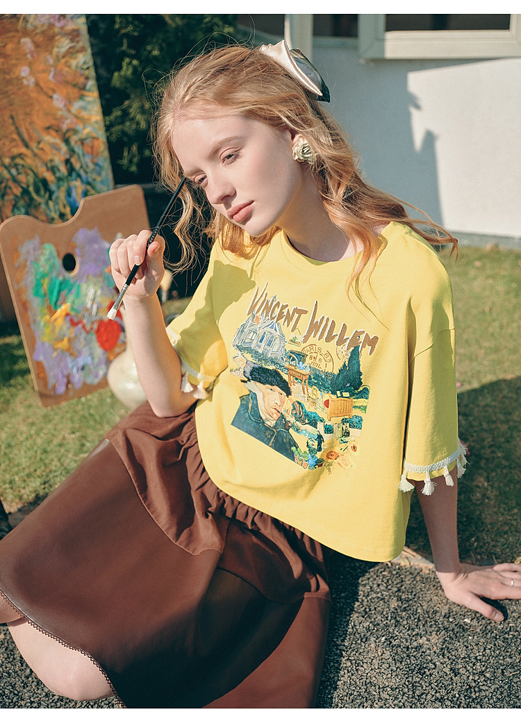 两三事梵高文艺旧日幻境2026春季新款人物印花流苏袖口t恤女短款