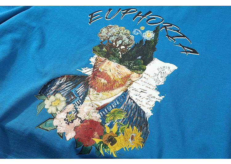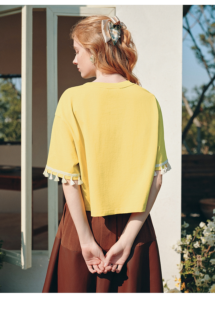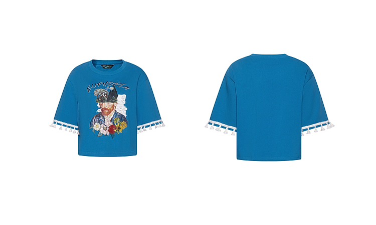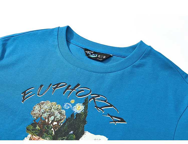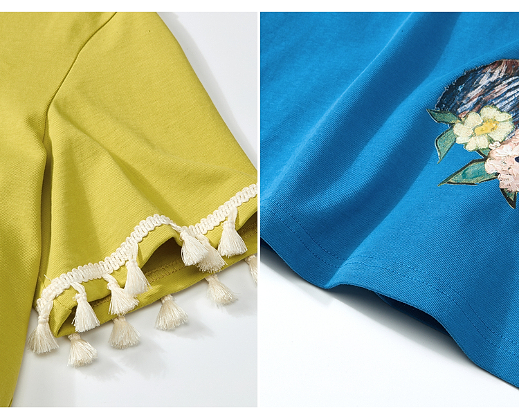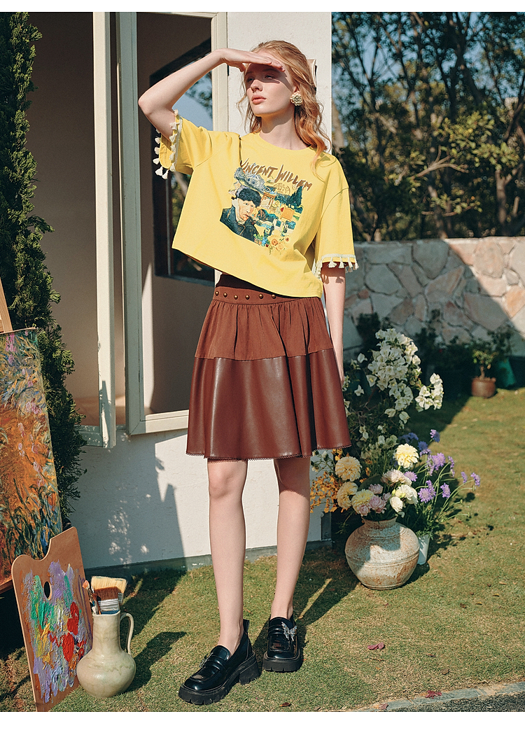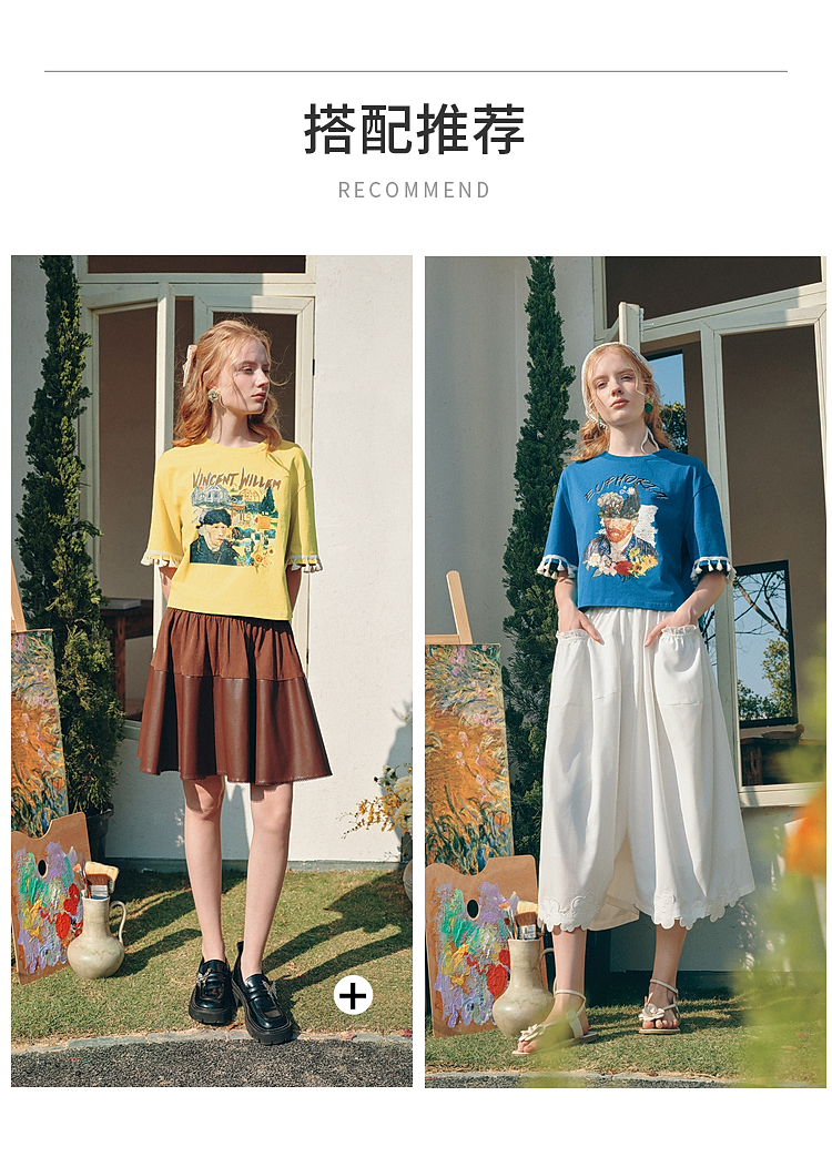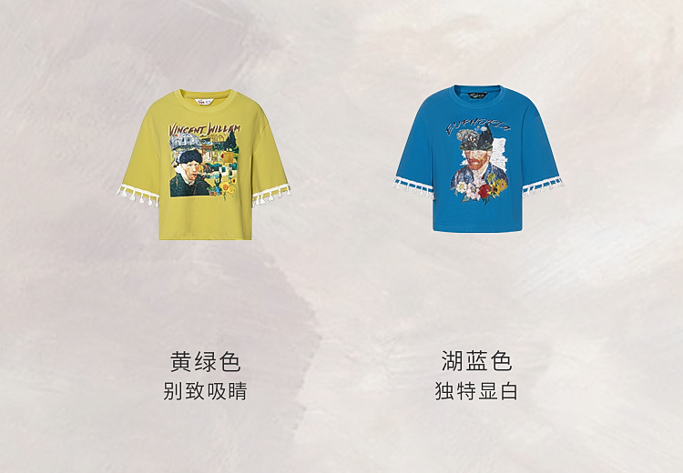 两三事梵高文艺旧日幻境2026春季新款人物印花流苏袖口t恤女短款