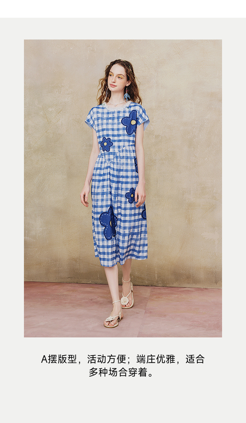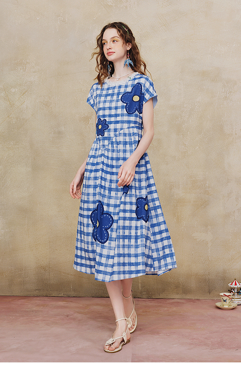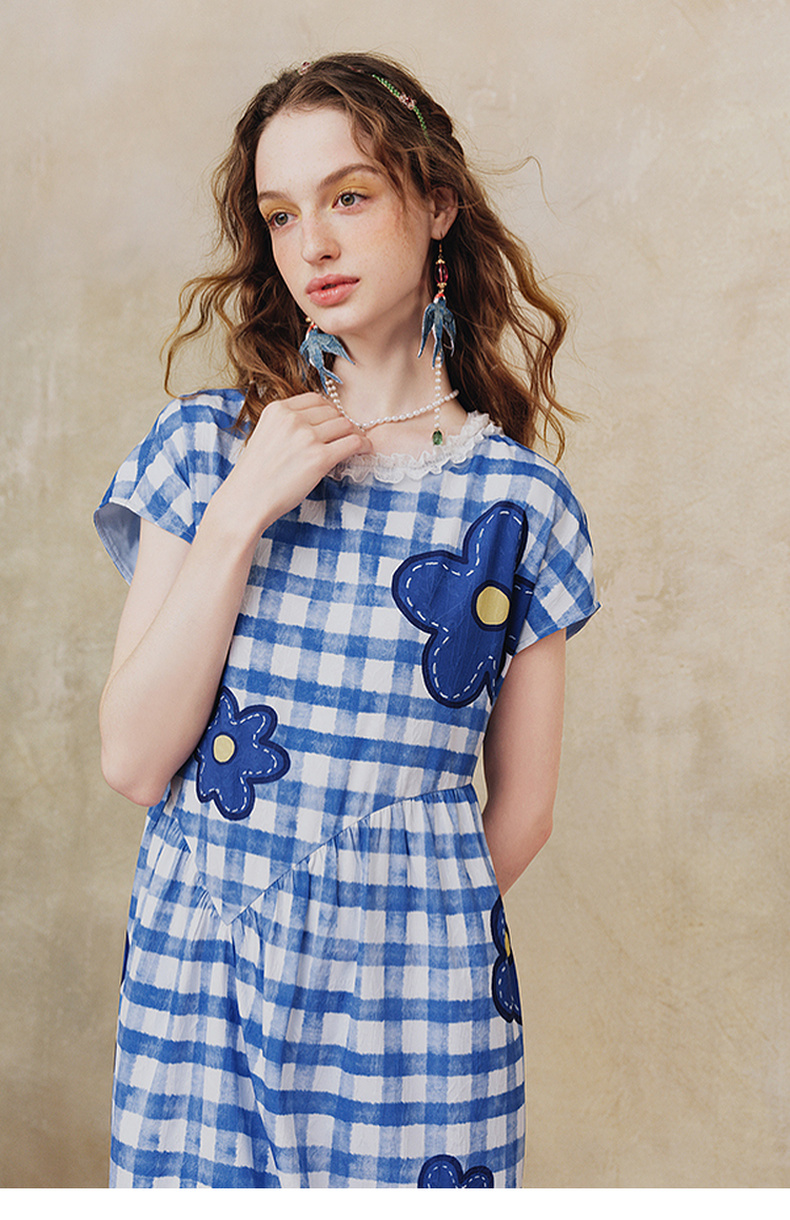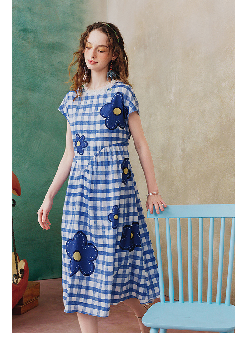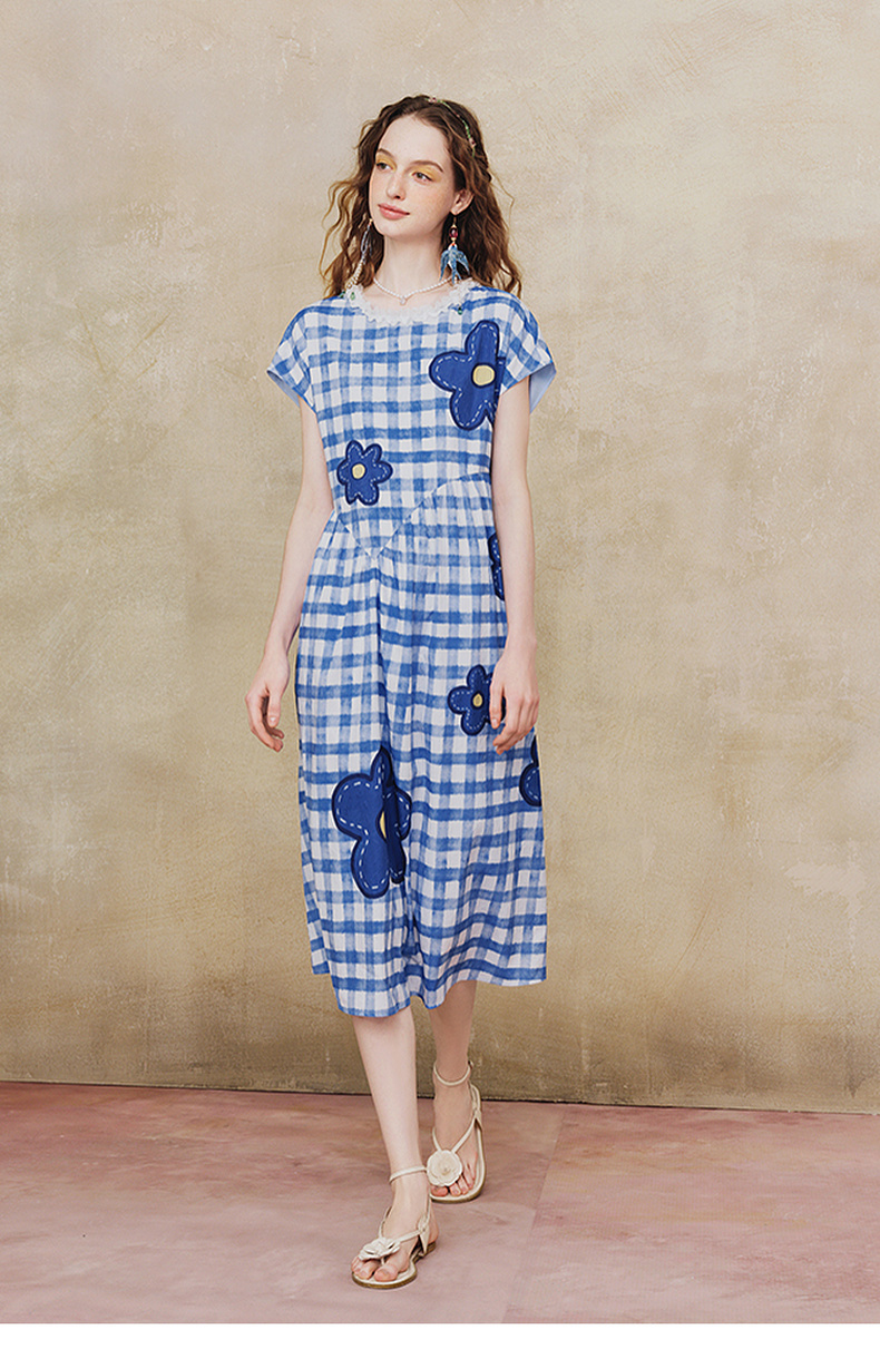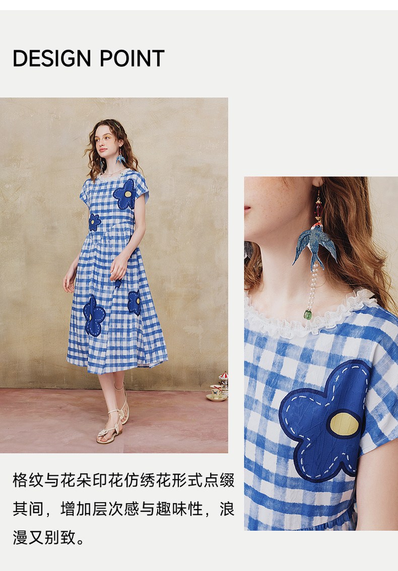 两三事 花月筑海 2025夏季新款花朵贴布绣蕾丝拼接格子连袖连衣裙