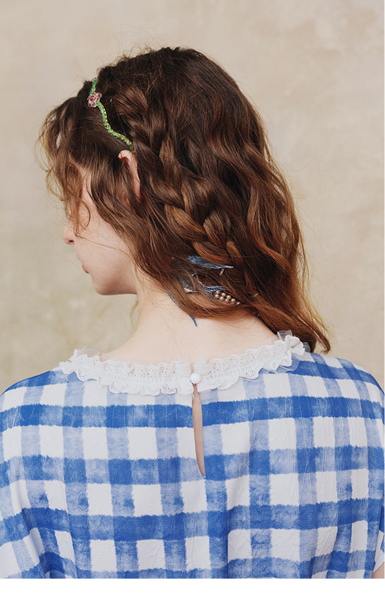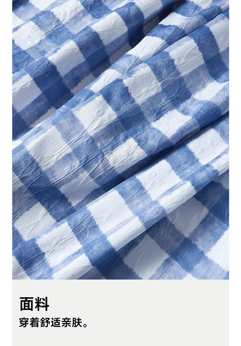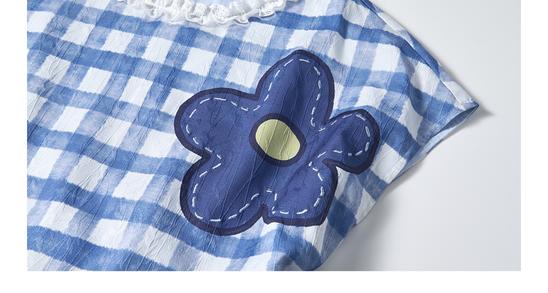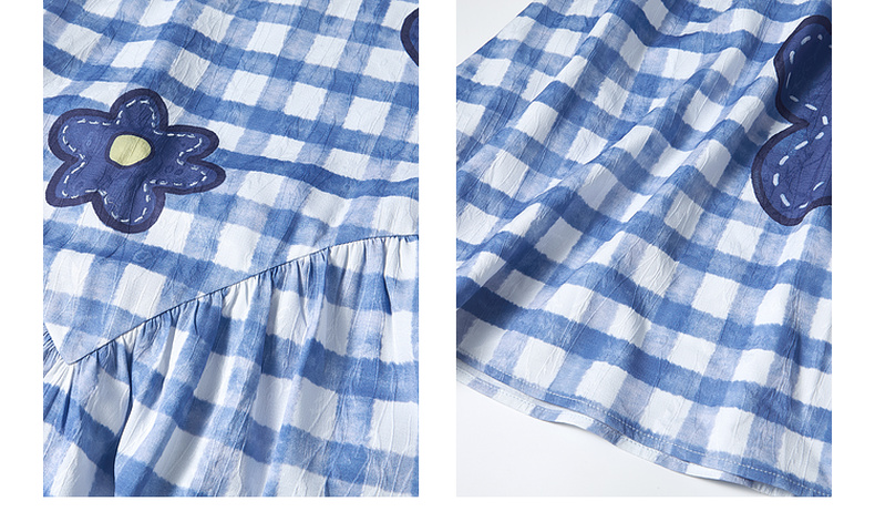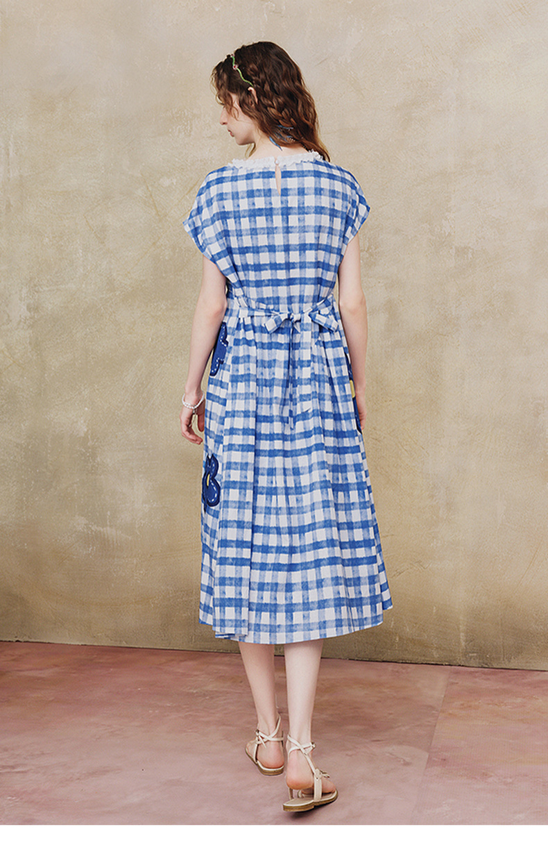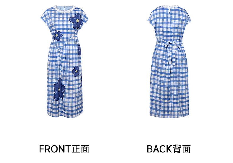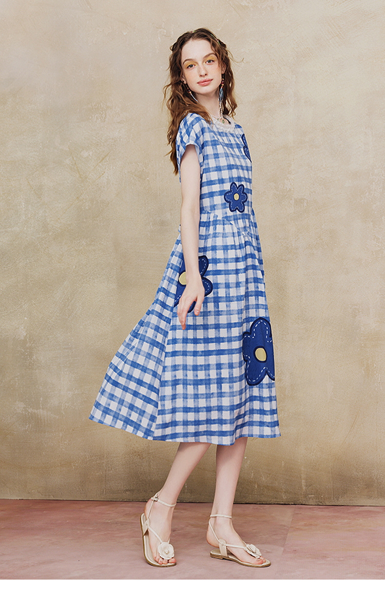 两三事 花月筑海 2025夏季新款花朵贴布绣蕾丝拼接格子连袖连衣裙