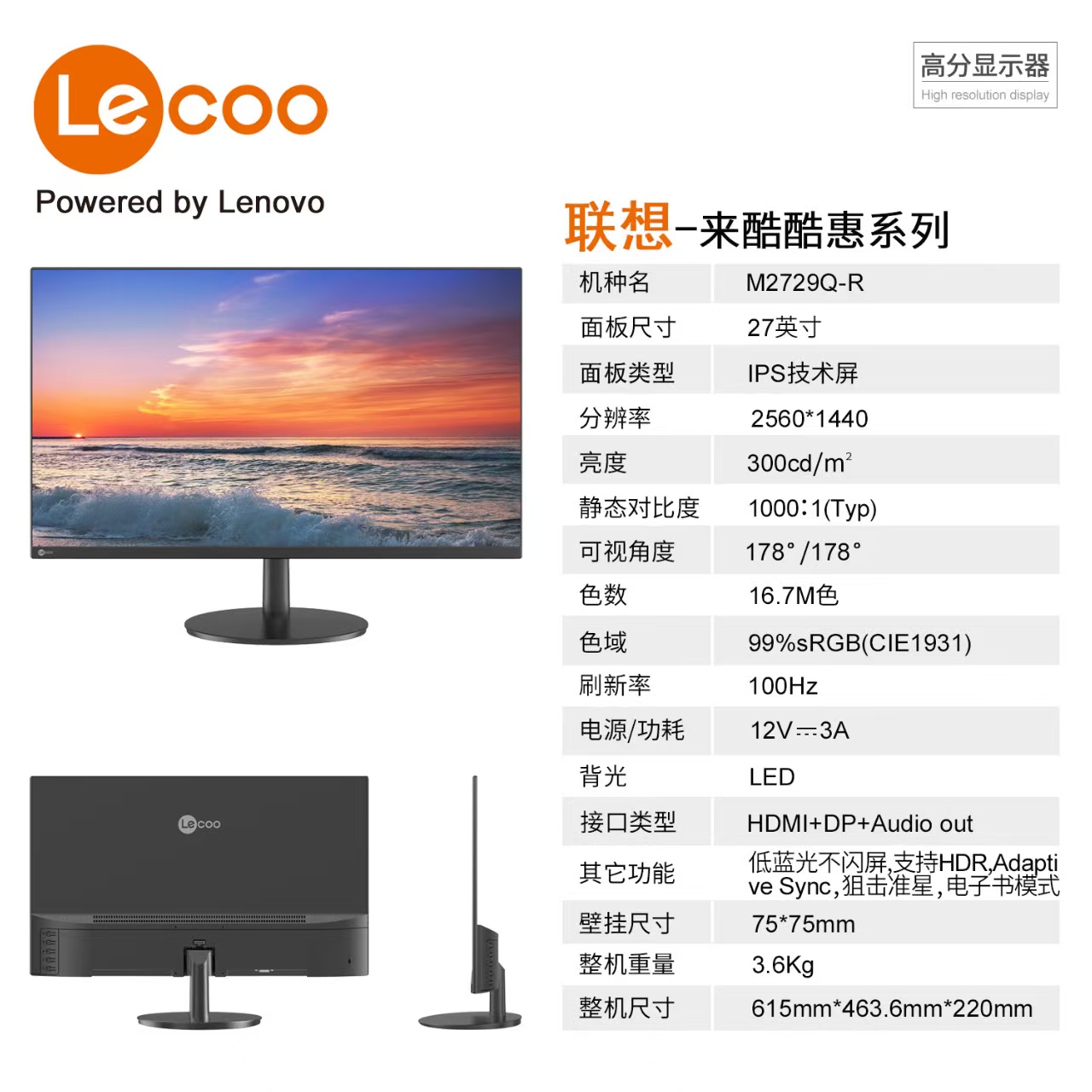 | Lecoo来酷27寸显示器M2729Q-R;HDMI+DP+Audio out;2K 2560*1440;HDMI线 3年 |
