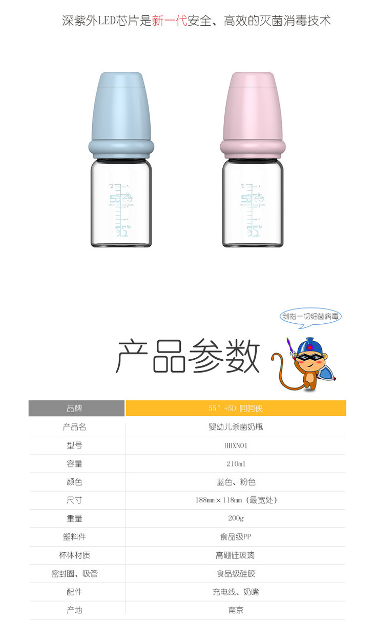【亏本清仓】55度 儿童杀菌消毒奶瓶 高档健康杀菌高硼硅玻璃210ML (不支持退换)[福利品]