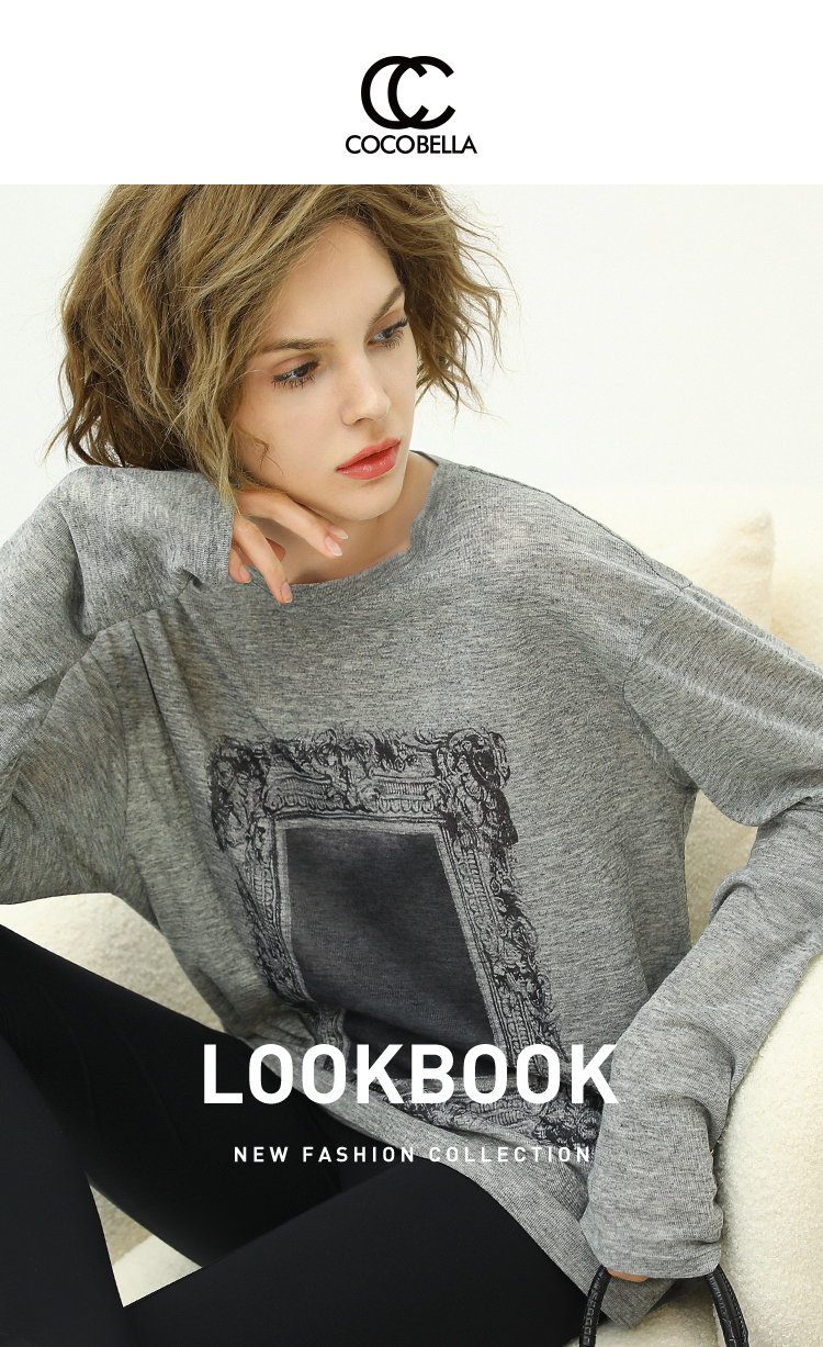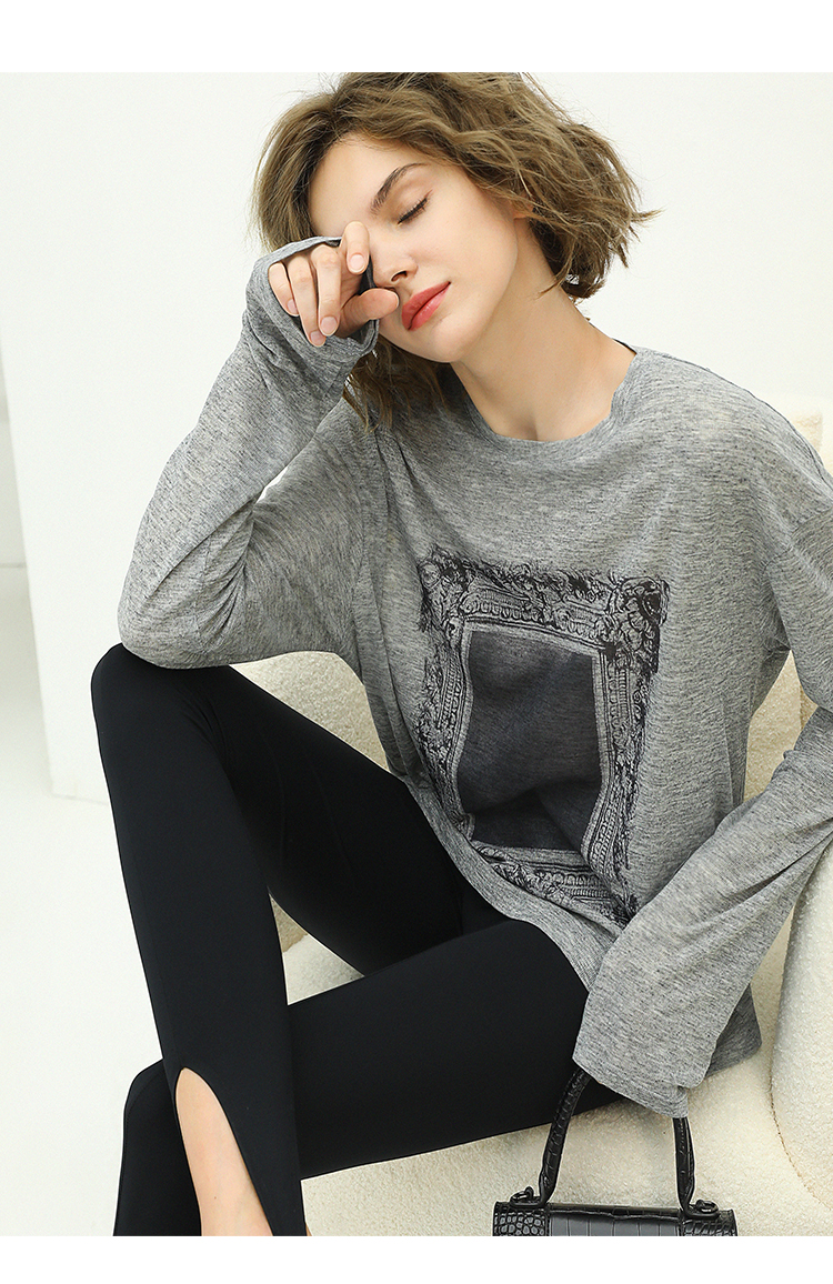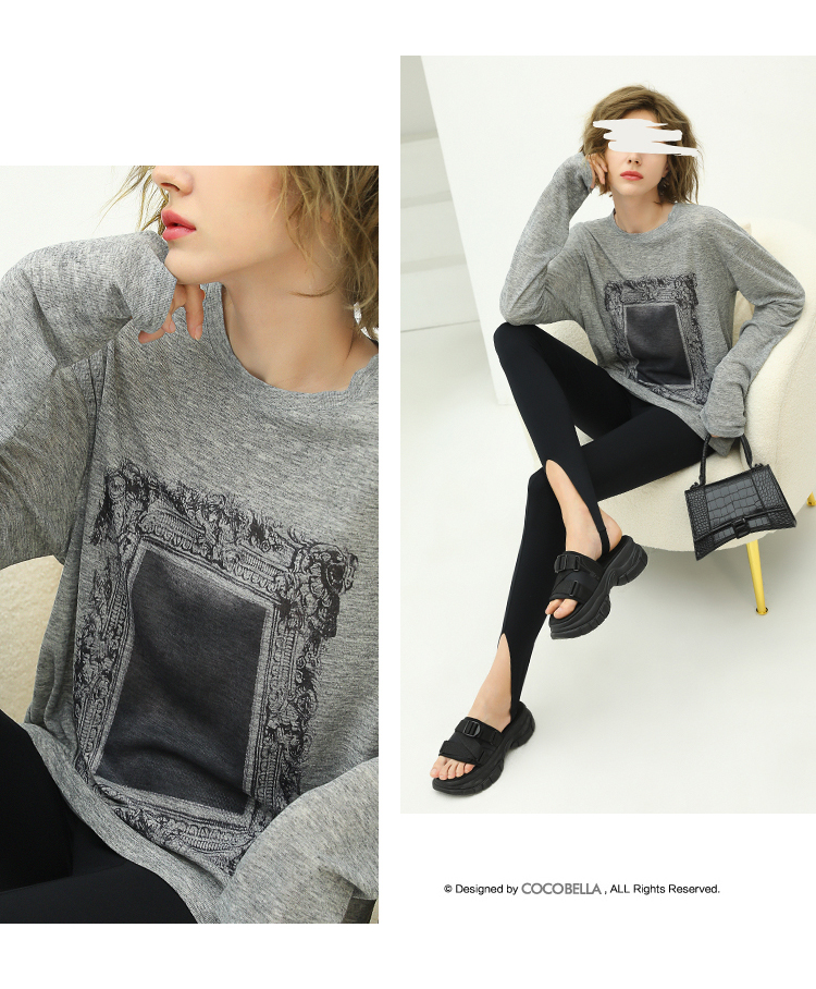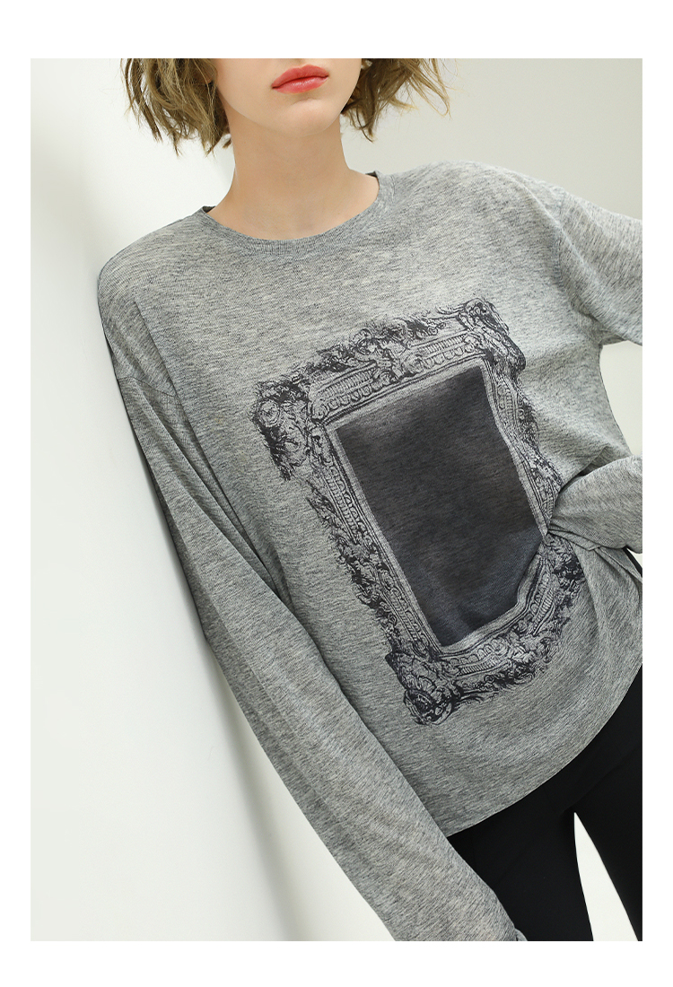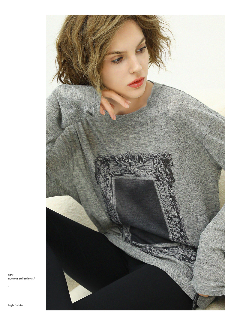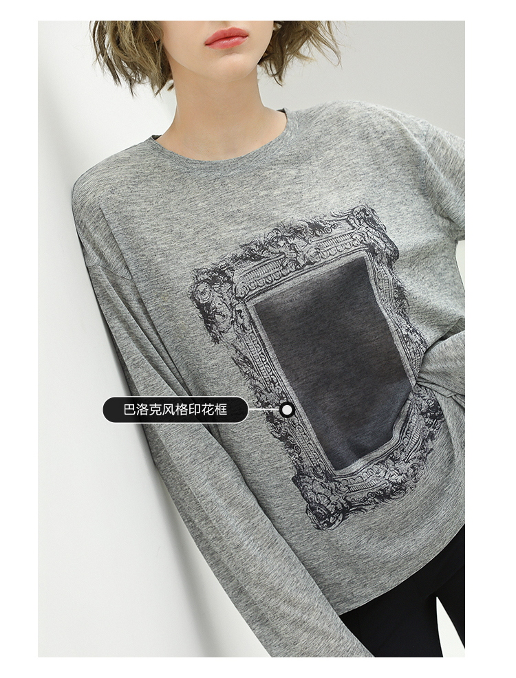 COCOBELLA时尚巴洛克印花长袖T恤女花纱灰色宽松针织上衣TS44