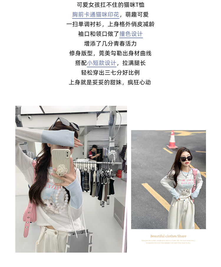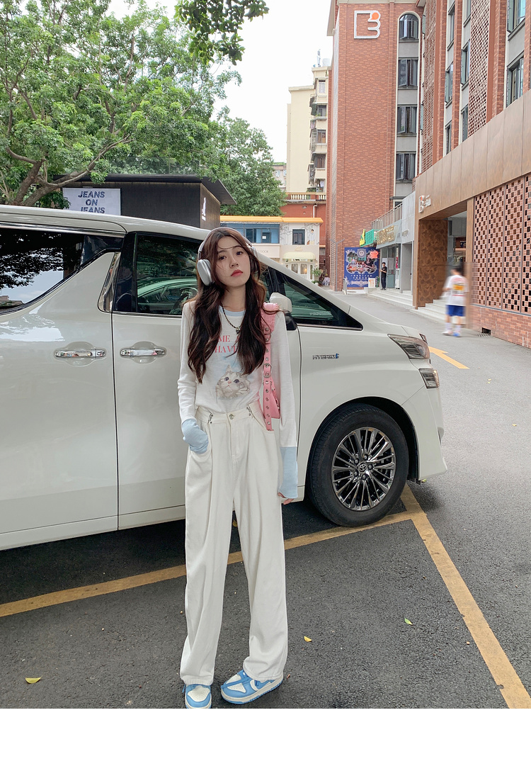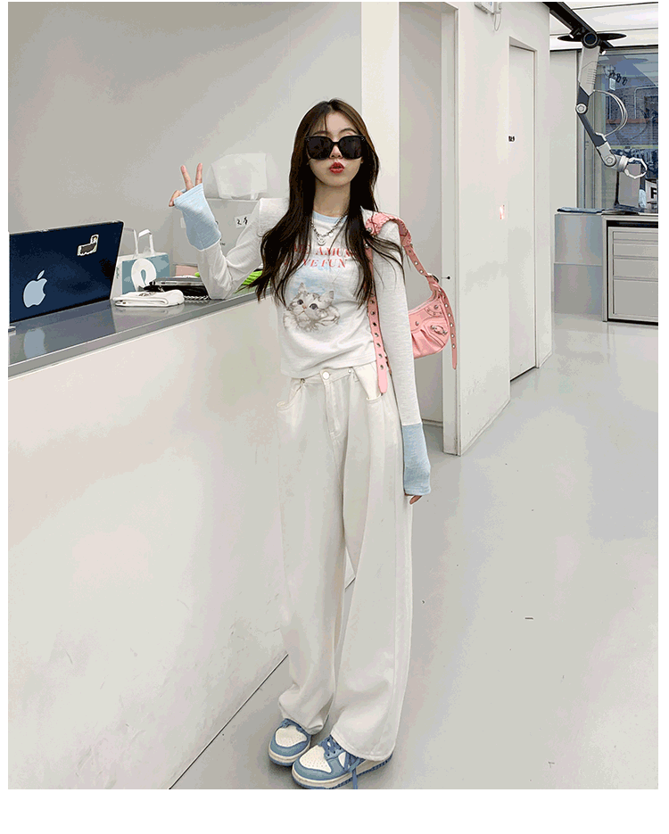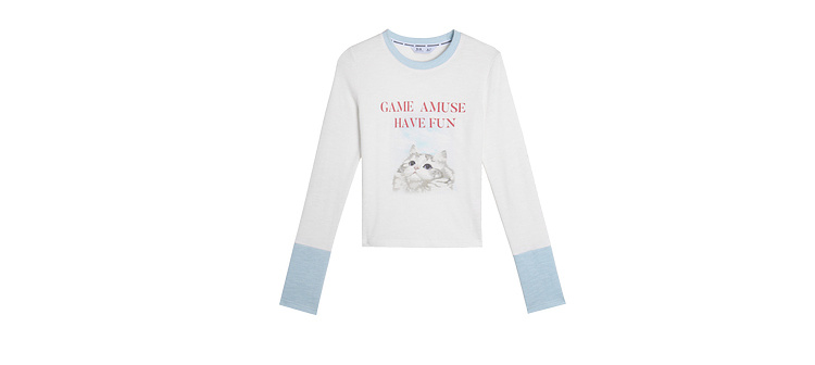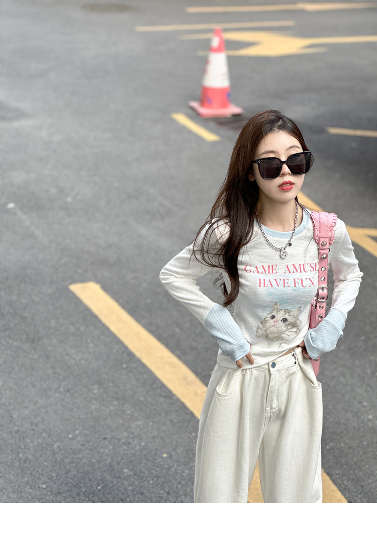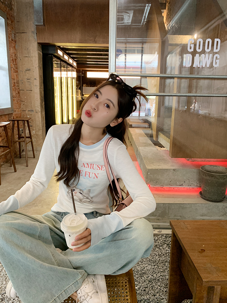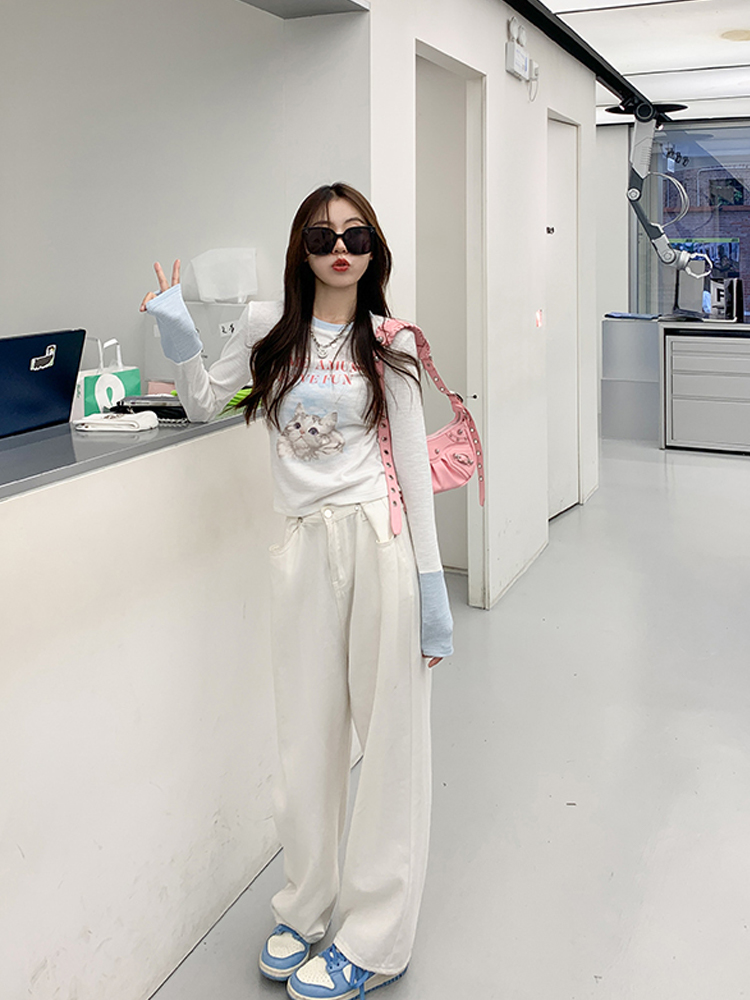 <曾小咸推荐>【梦幻萌宠】猫咪印花长袖T恤/收扣白色牛仔裤