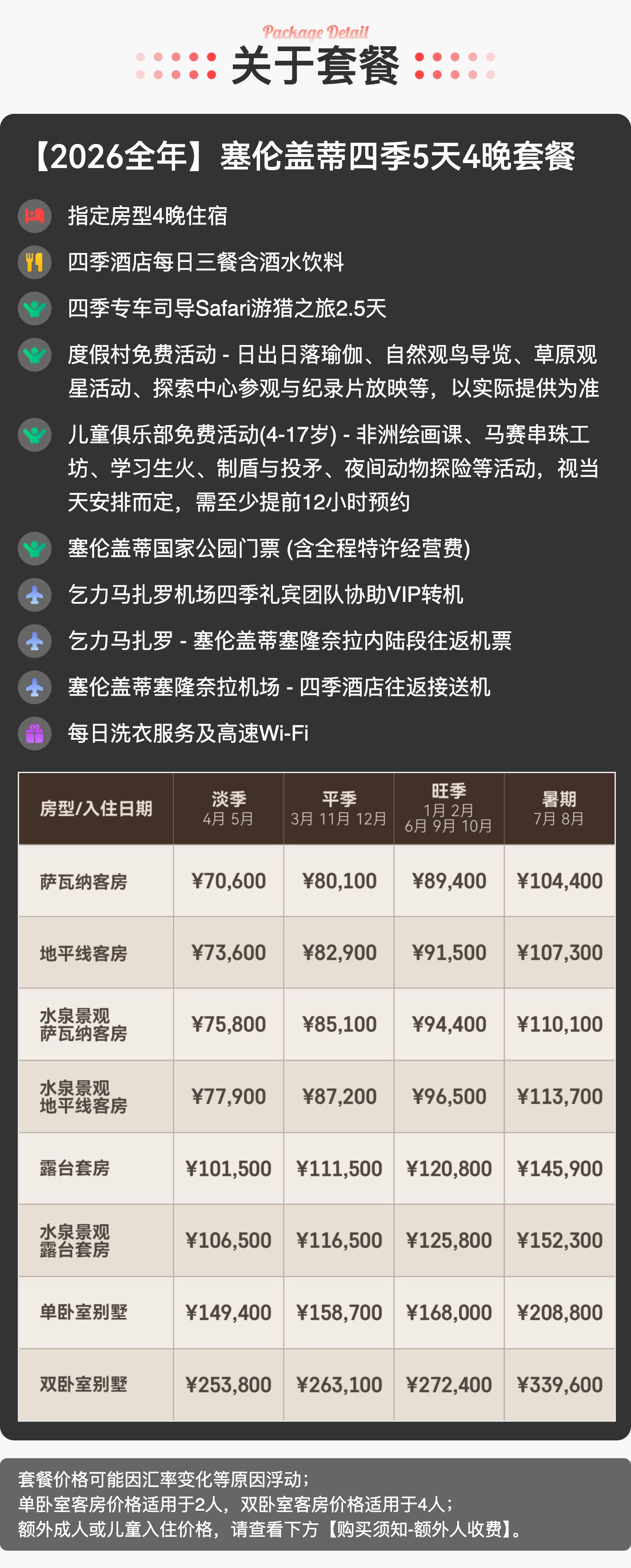 5天4晚【坦桑尼亚塞伦盖蒂四季 | Four Seasons Serengeti】2026全年可用!四季司导专车游猎、每日三餐酒水、丰富儿童活动、内陆段往返机票及VIP接送机,安心深度领略东非草原心脏