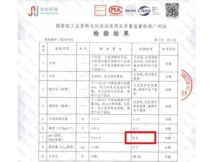 检测结果显示pH值9.6,比国家要求的10.5要低,也是我用过这几款里更低的。