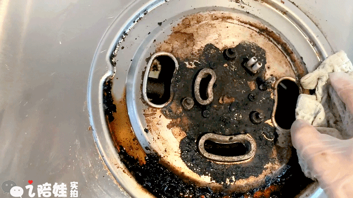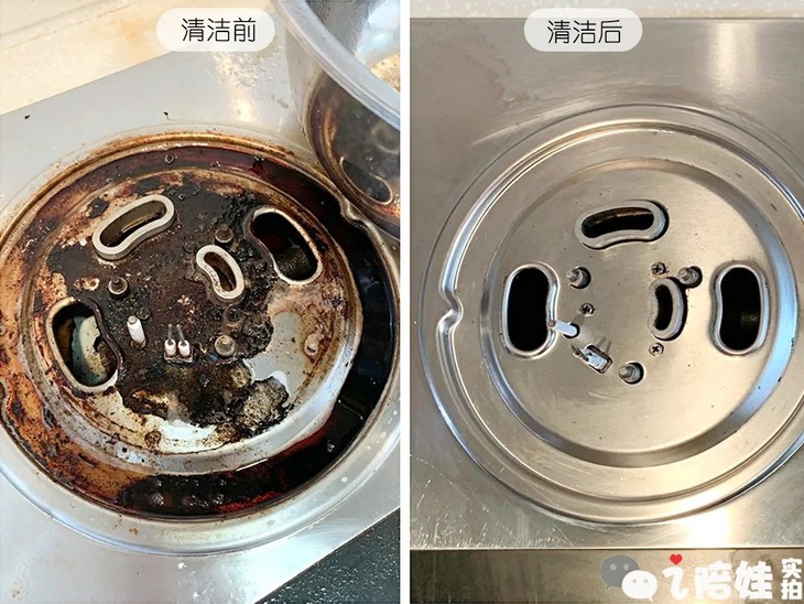像这种溢锅以后糊满了汤和油烧干的污渍特难弄,用开团款清洁后,燃气灶真见新。