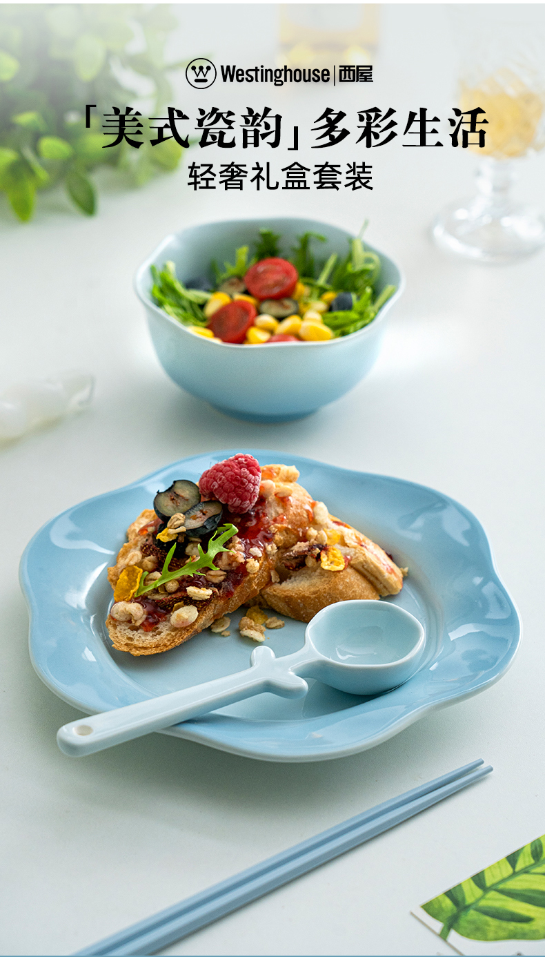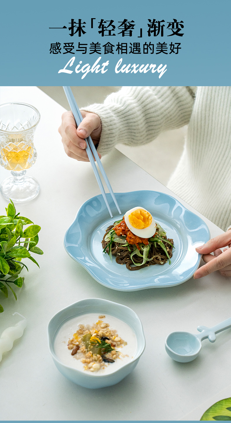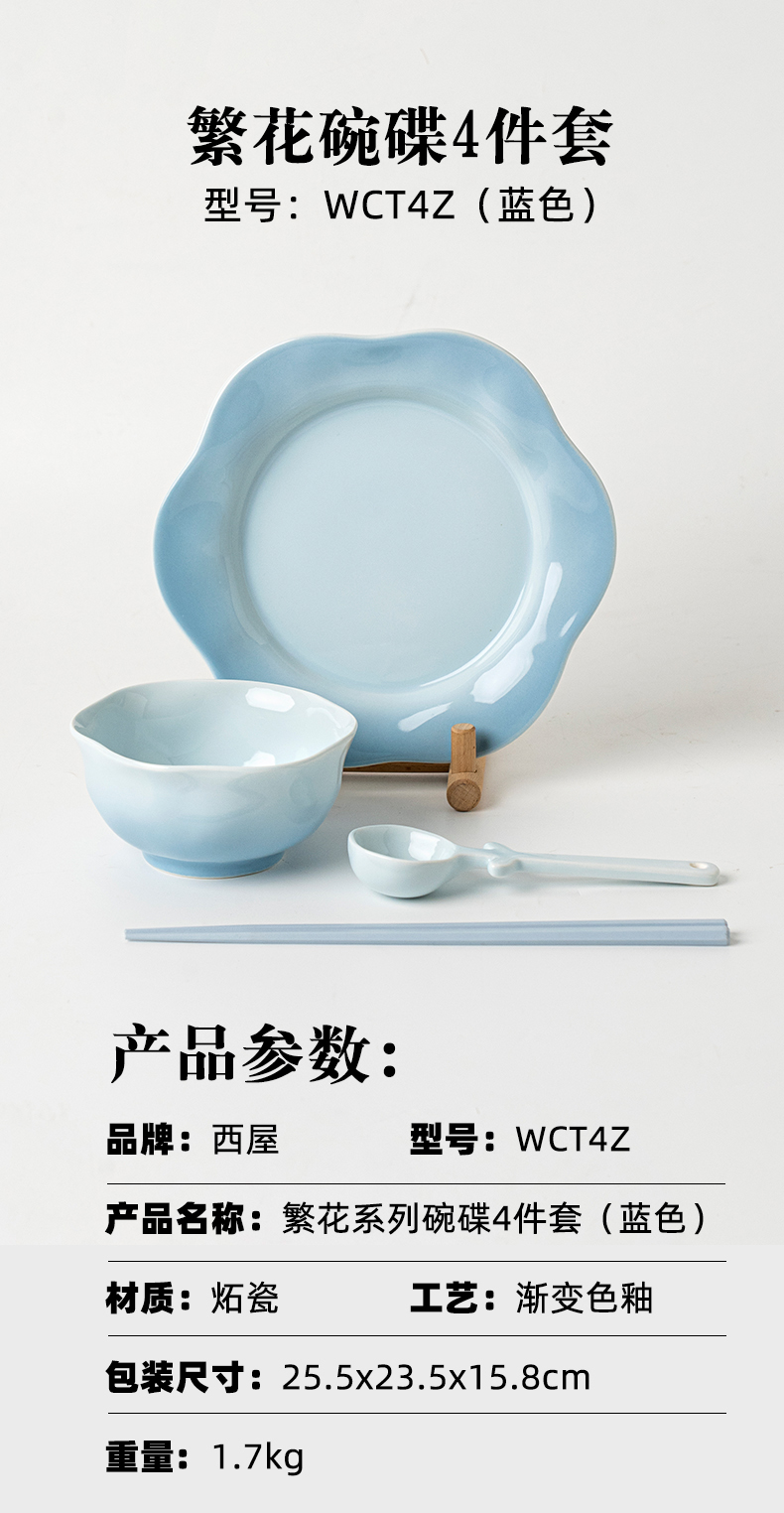 【西屋繁花碗碟4件套】餐具轻奢繁花系列碗碟4件套渐变天空蓝色家用餐具套装