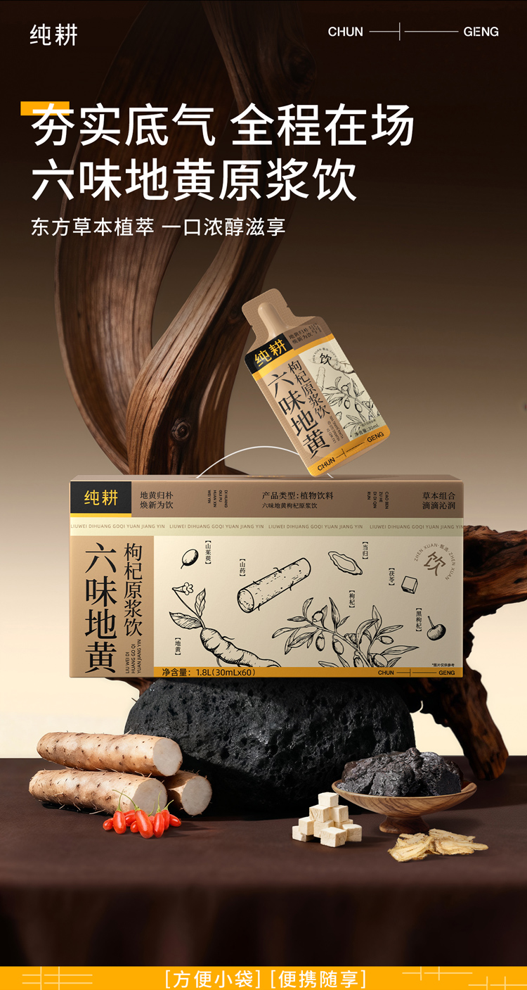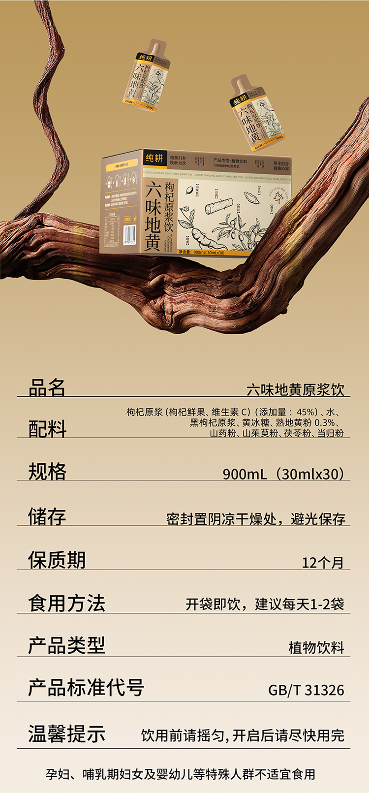 纯耕900ml(30袋)1.2L(40袋)、1.8L(60袋)2.7L(90袋)六味地黄枸杞原浆饮;含枸杞黑枸杞当归山药茯苓山茱萸焦作熟地黄黄冰糖等,草本滋补