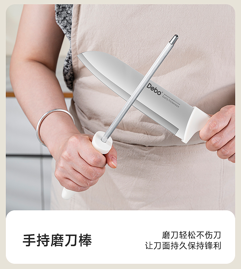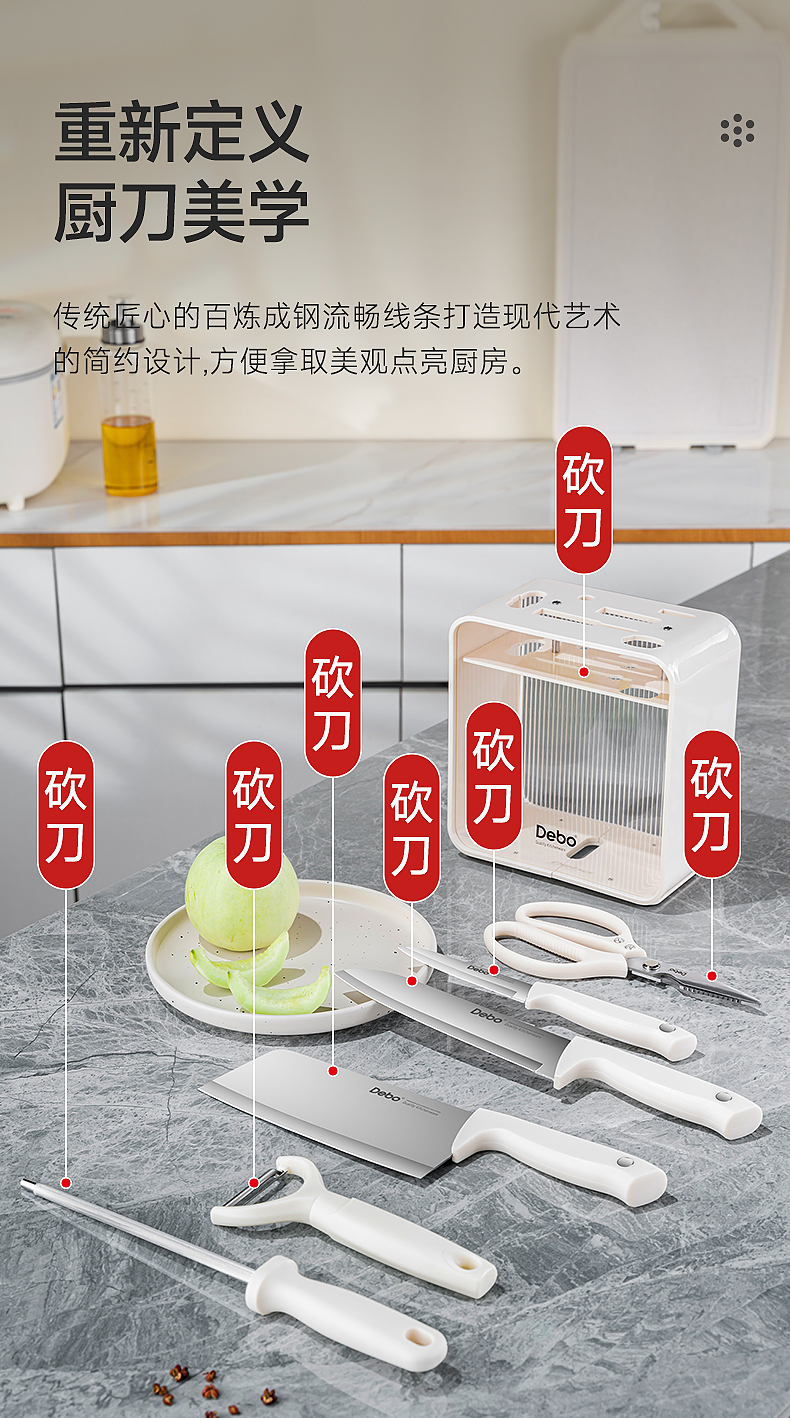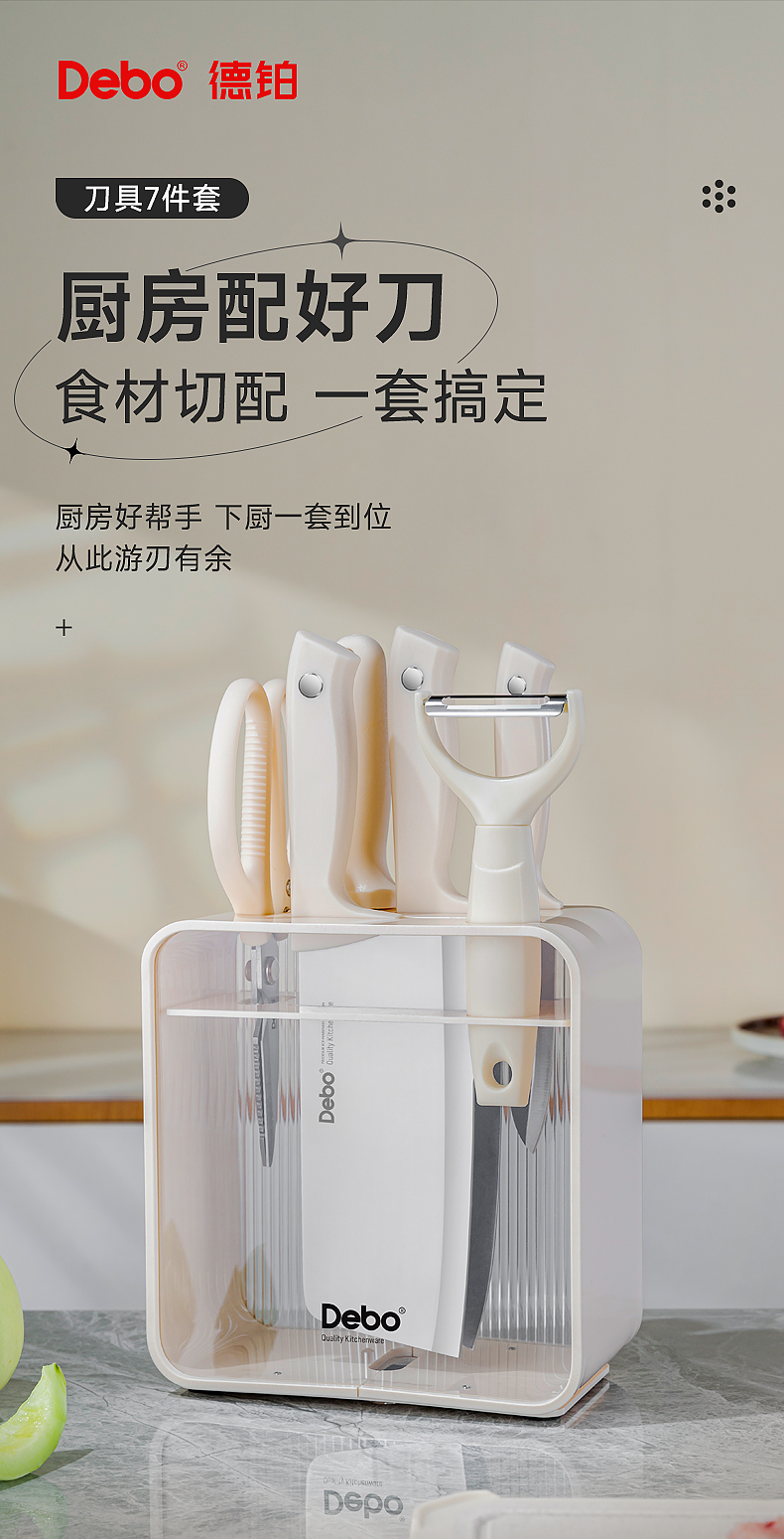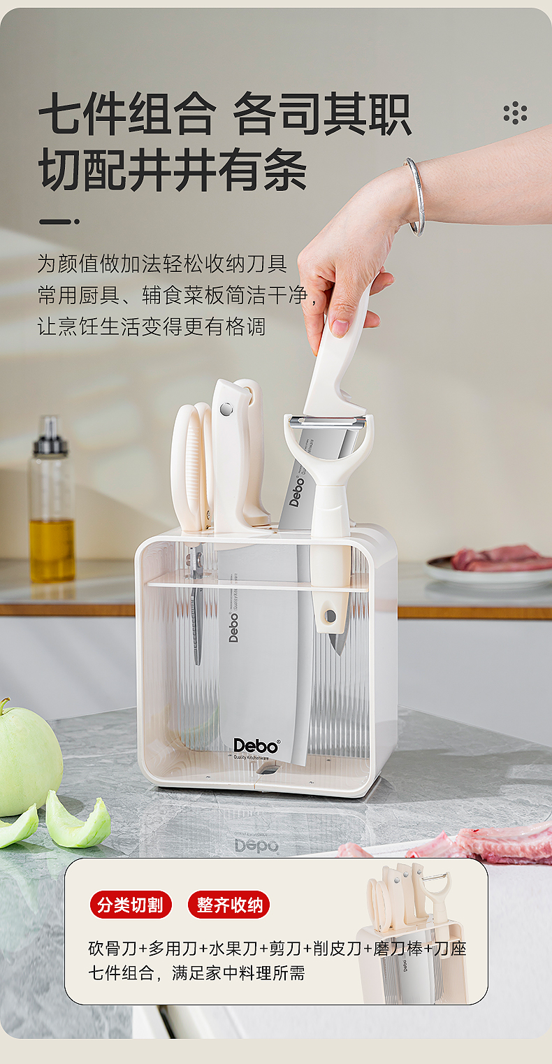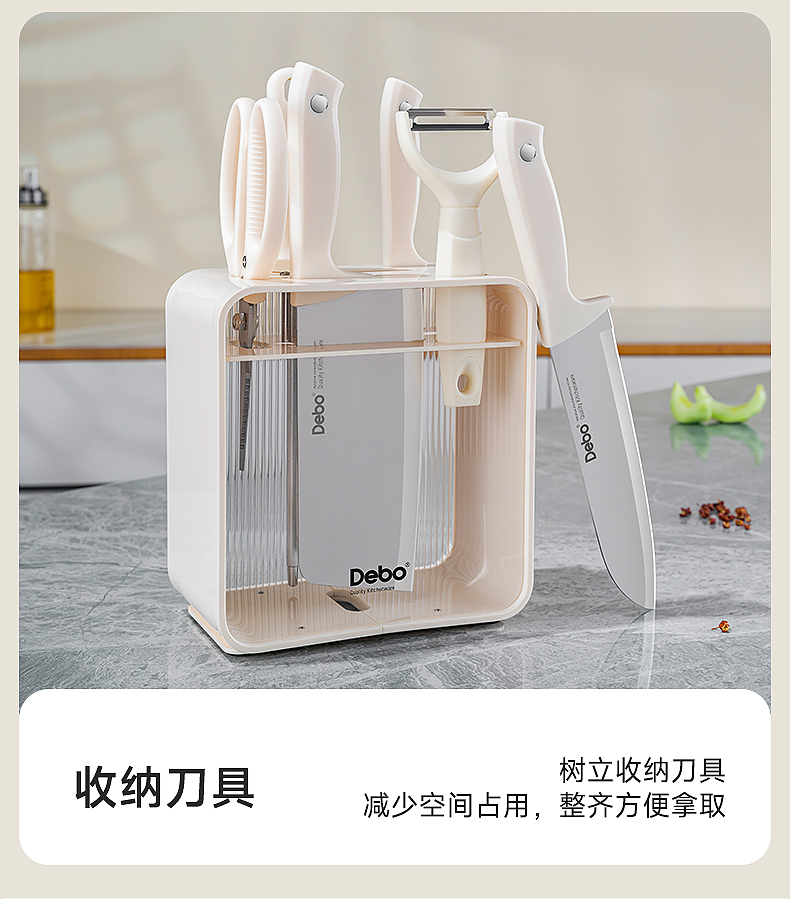 配置:收纳座*1、砍骨刀*1、多用刀*1、水果刀*1、厨房剪*1、磨刀棒*1、瓜刨*1