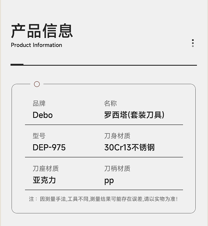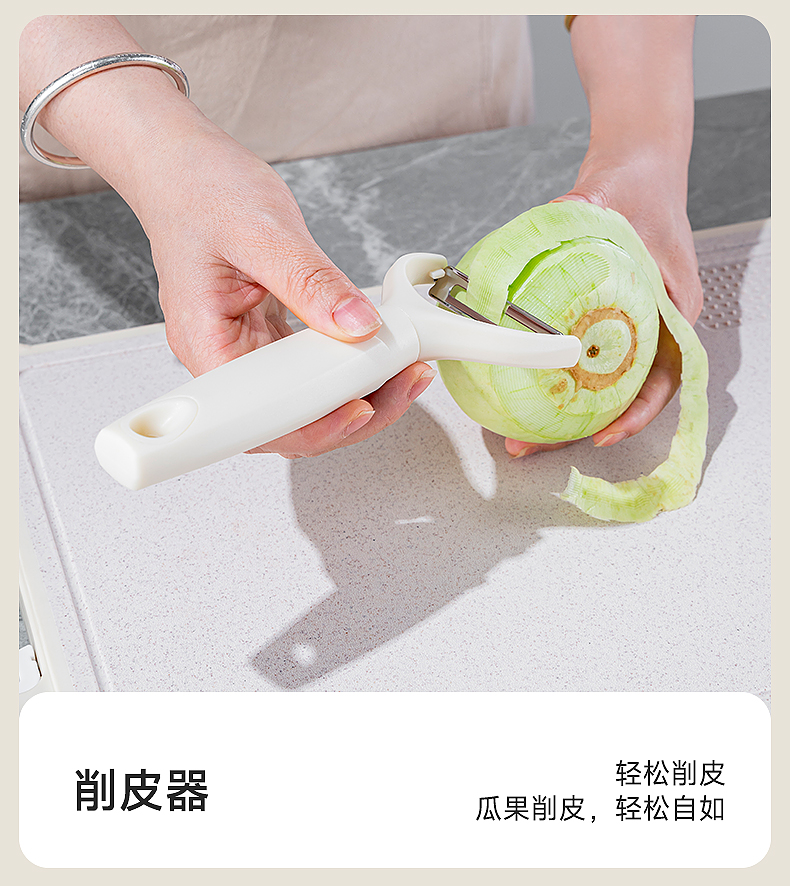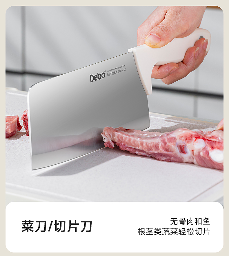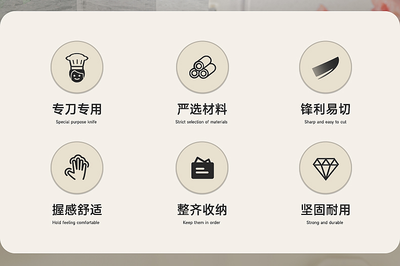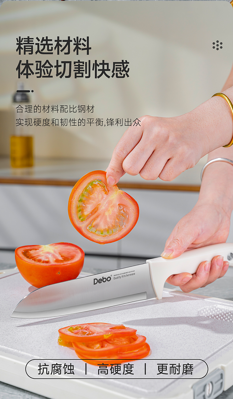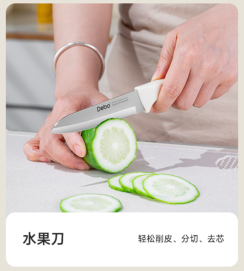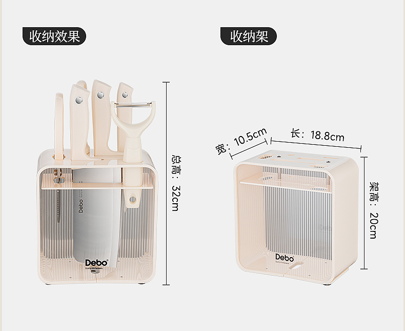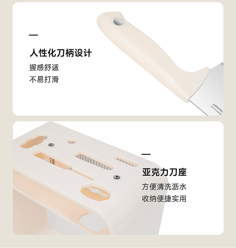 配置:收纳座*1、砍骨刀*1、多用刀*1、水果刀*1、厨房剪*1、磨刀棒*1、瓜刨*1