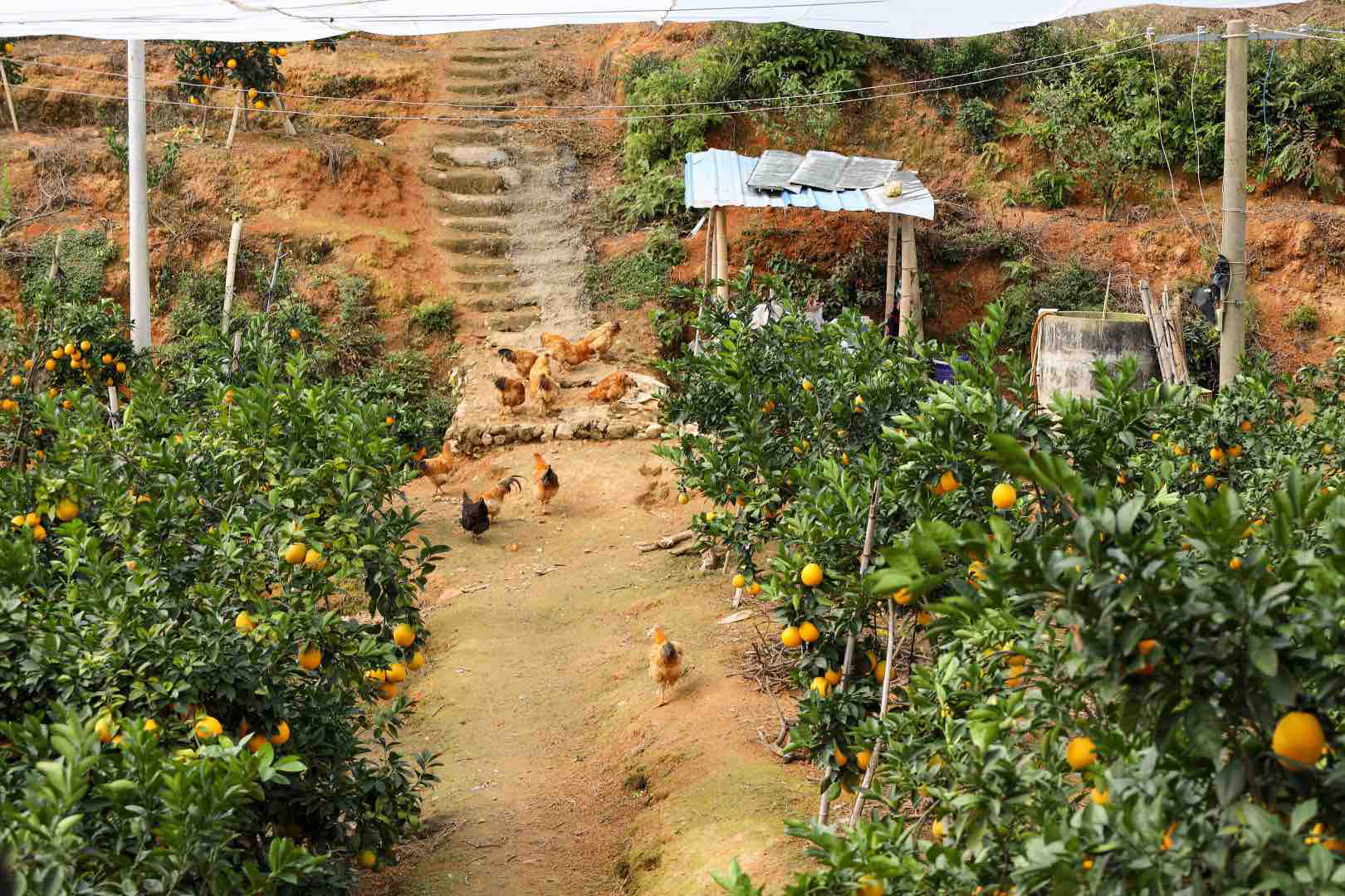 有机肥料施肥,当地人喜欢在园中养鸡