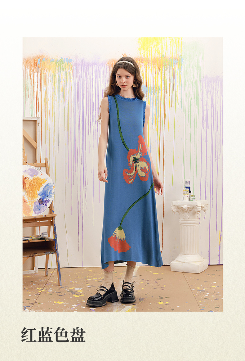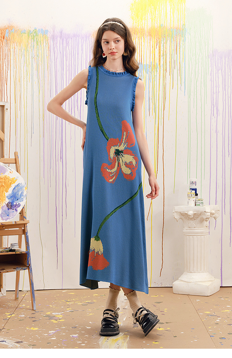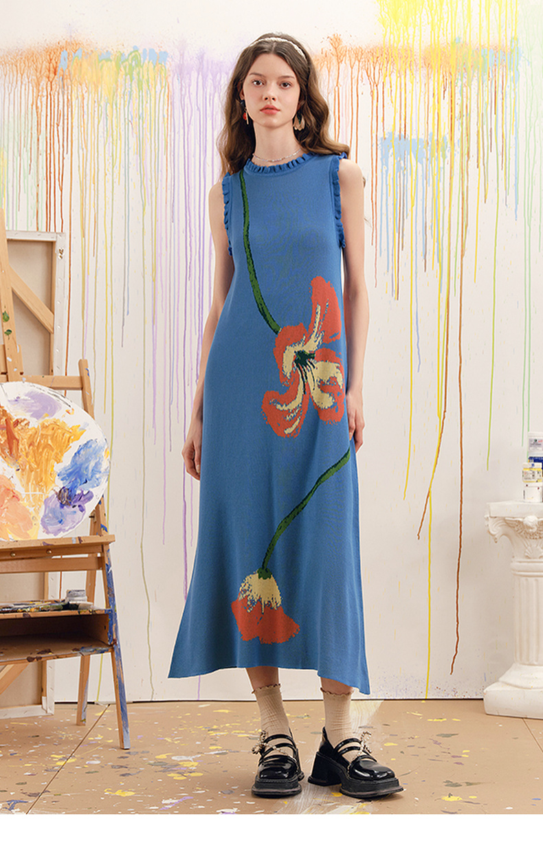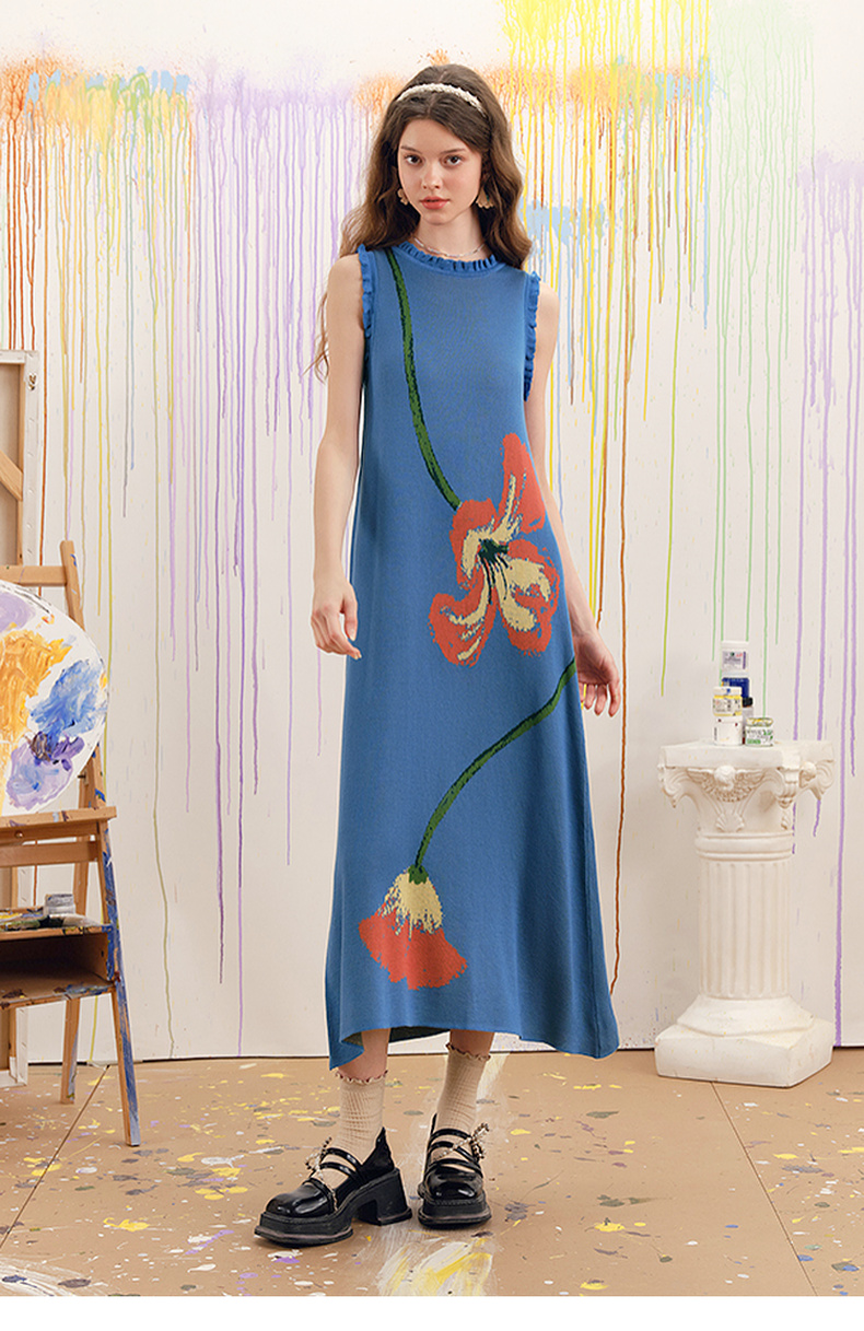 两三事梵高文艺红蓝色盘2025春季新款荷叶边花卉毛织背心裙连衣裙S25CLY314