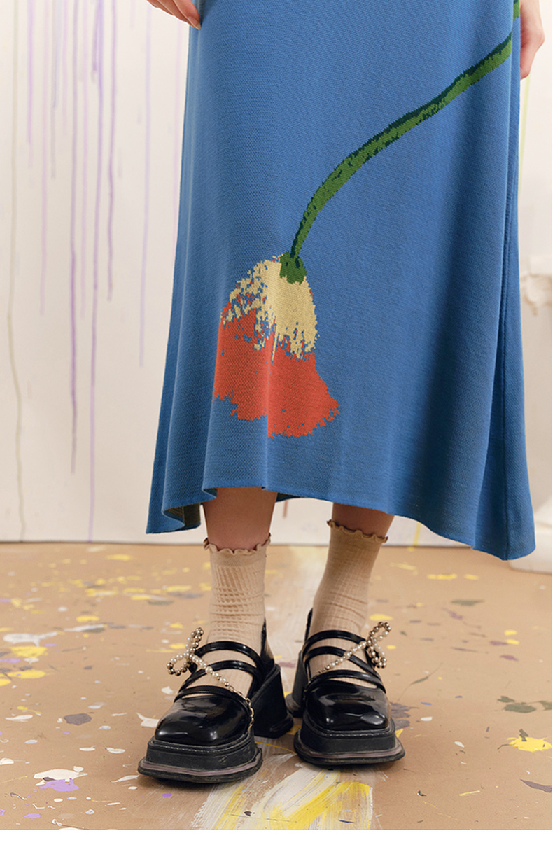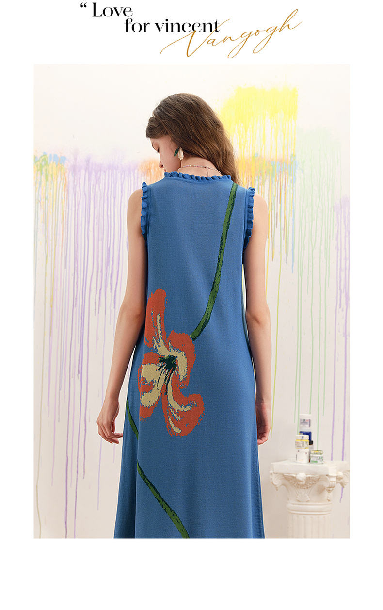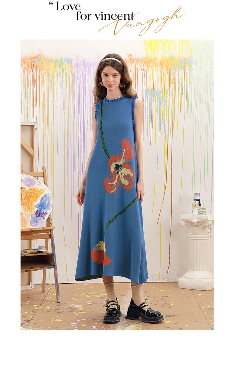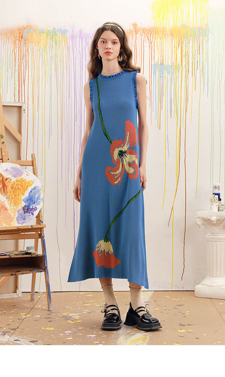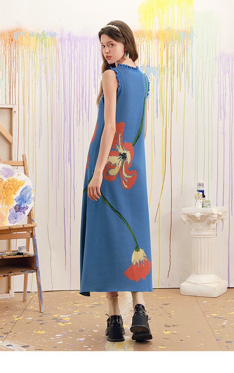 两三事梵高文艺红蓝色盘2025春季新款荷叶边花卉毛织背心裙连衣裙S25CLY314