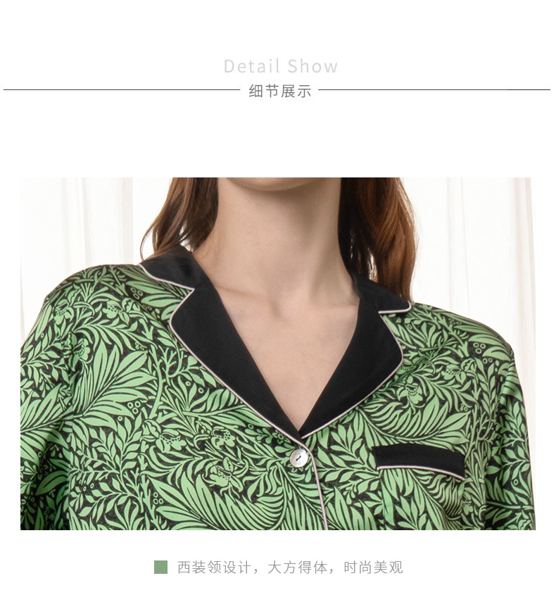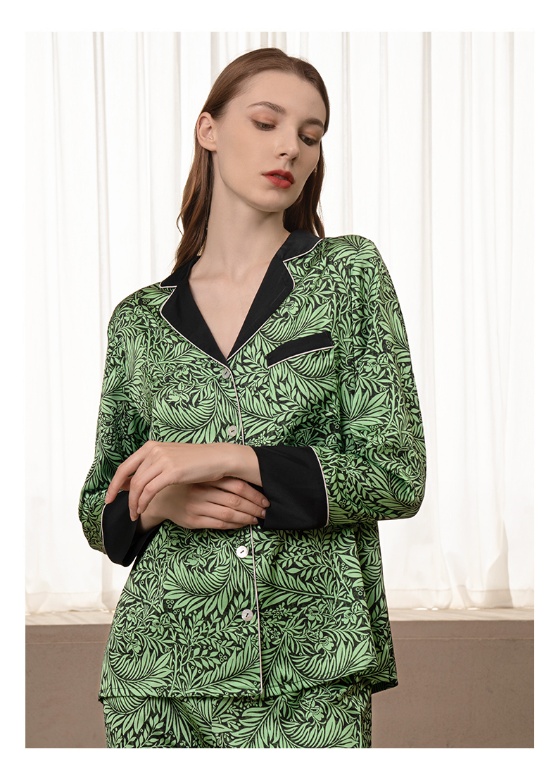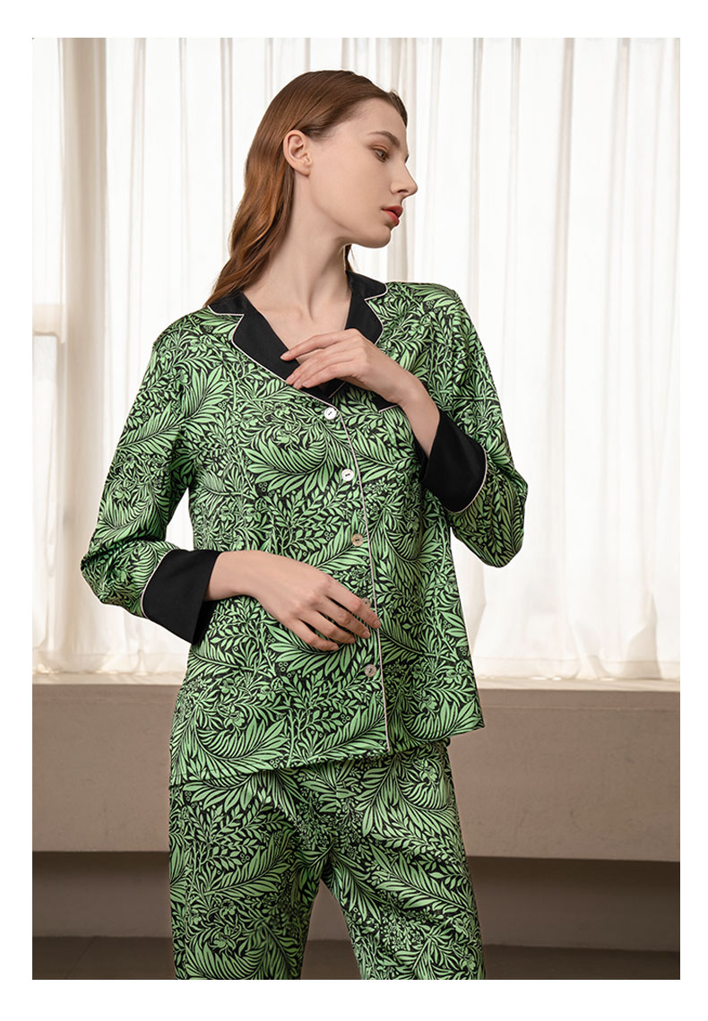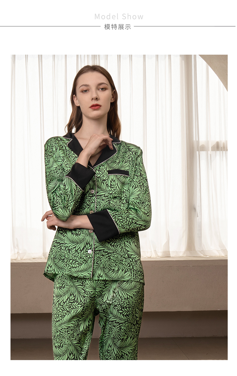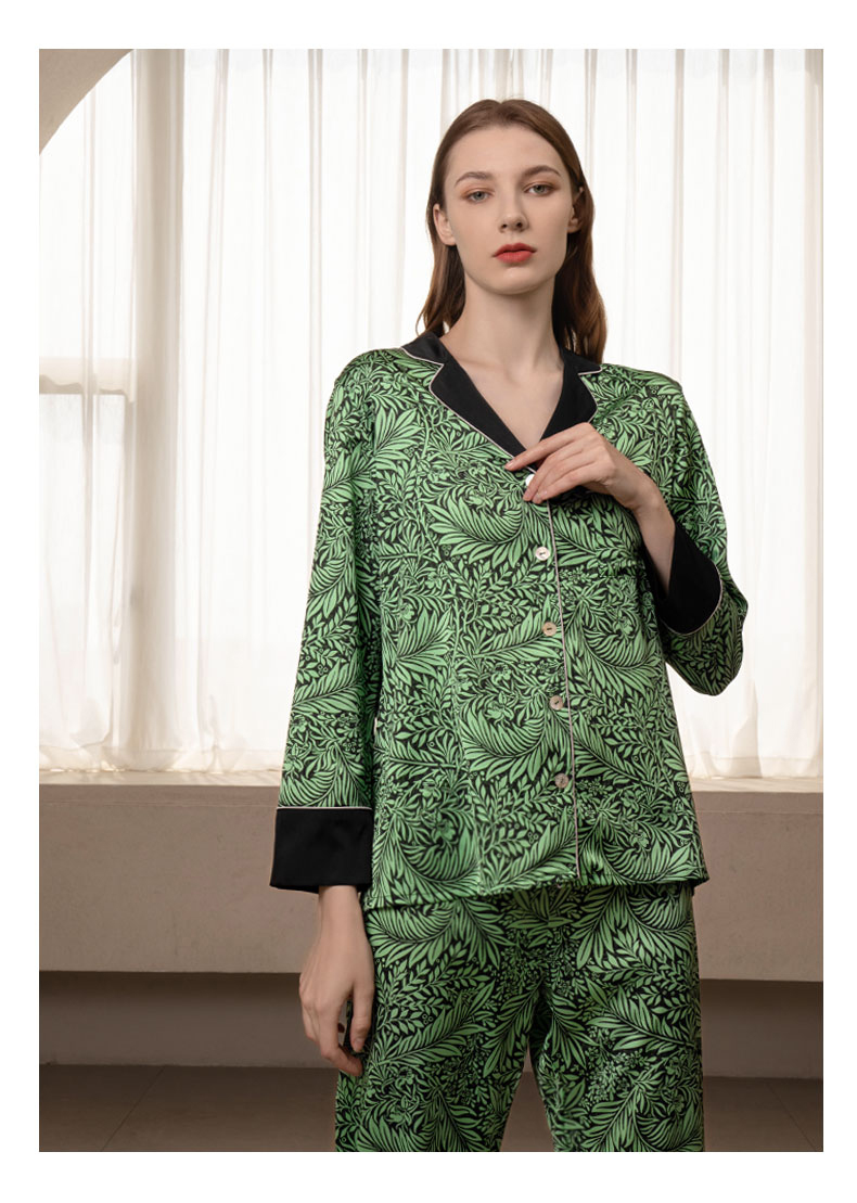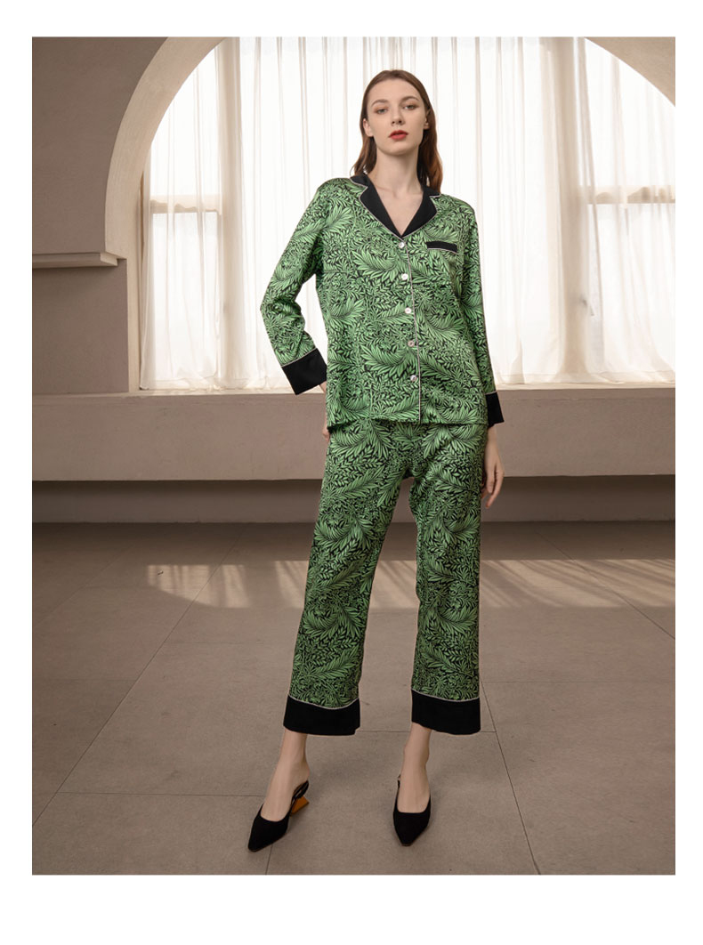 Solo seta22姆米真丝睡衣套装青叶印花长袖桑蚕丝家居服秋冬