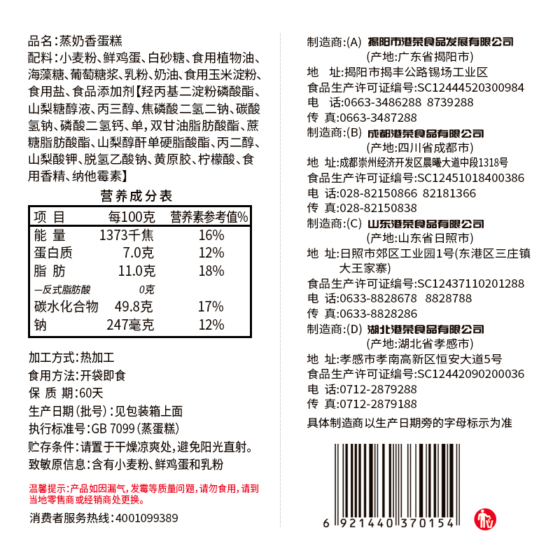 港荣蒸蛋糕 奶香味蒸蛋糕480g/箱面包蛋糕早餐休闲食品面包吐司糕点