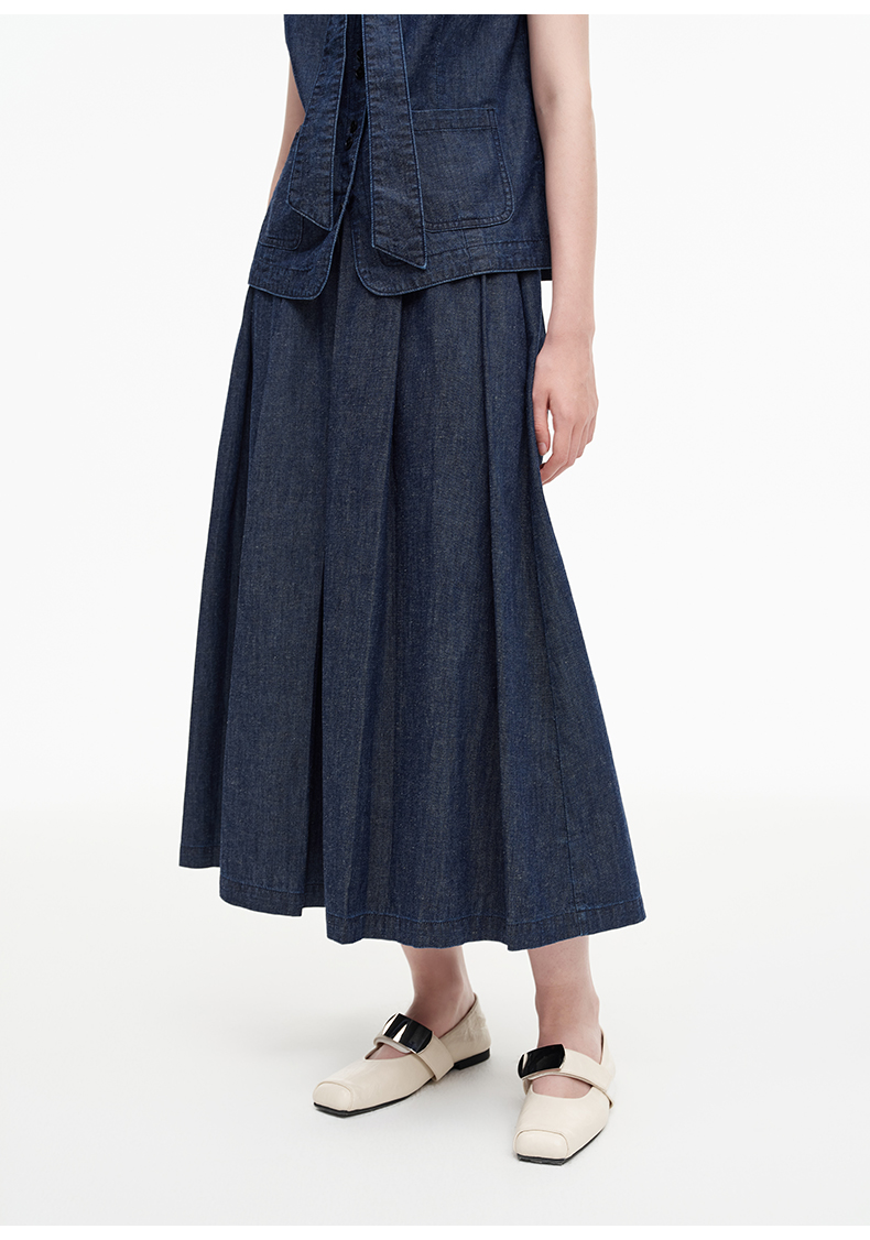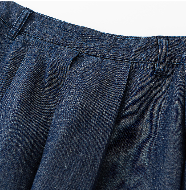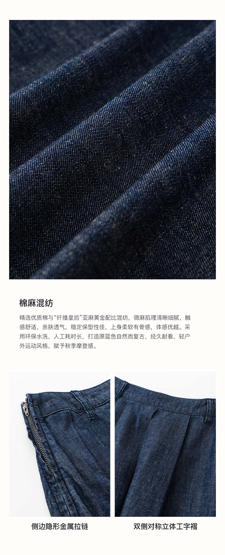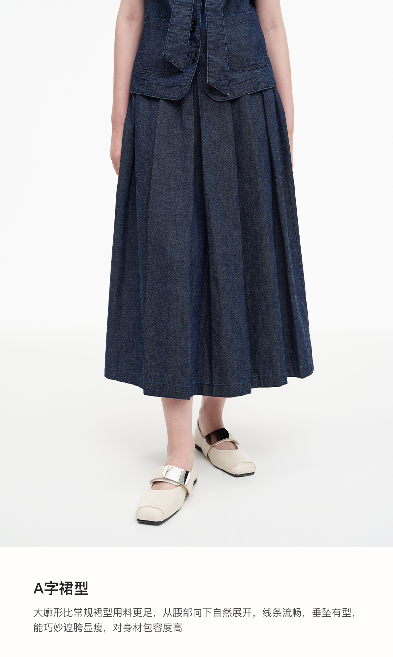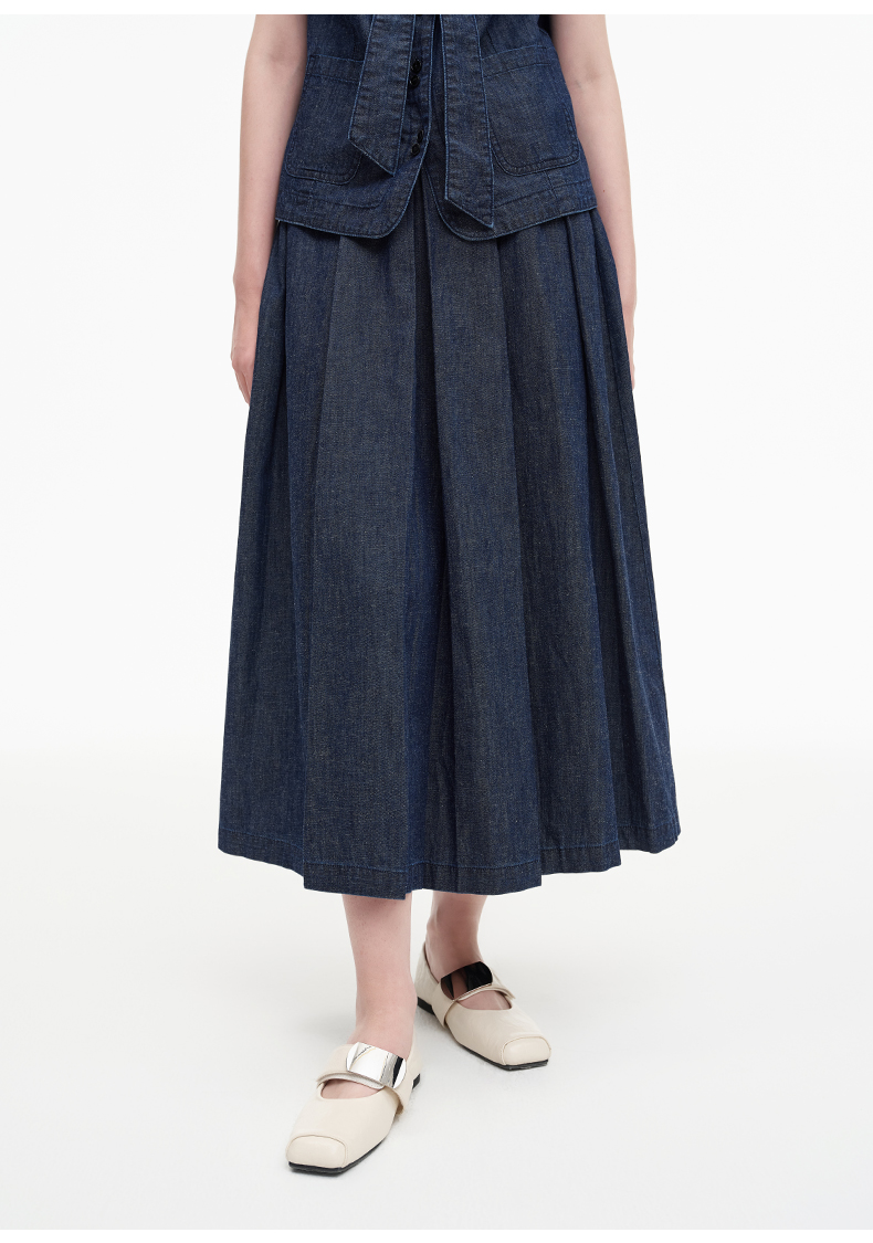 SELFWHO棉麻混纺原牛风牛仔半身裙女2025秋新款立体工字褶A字长裙