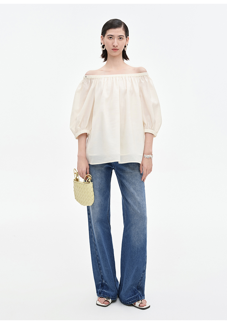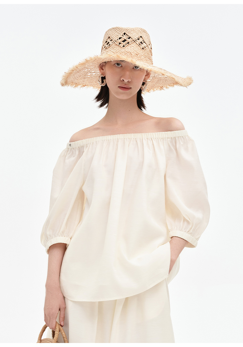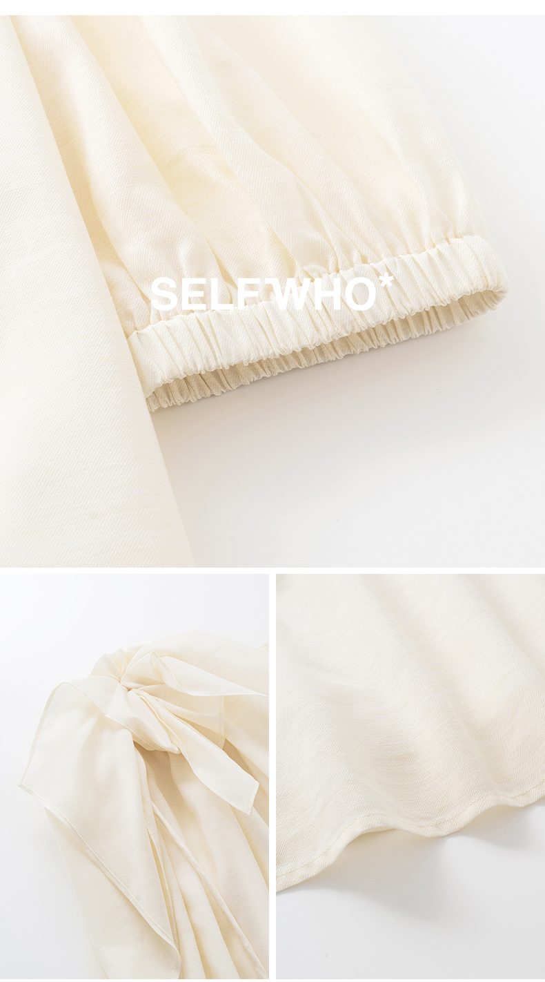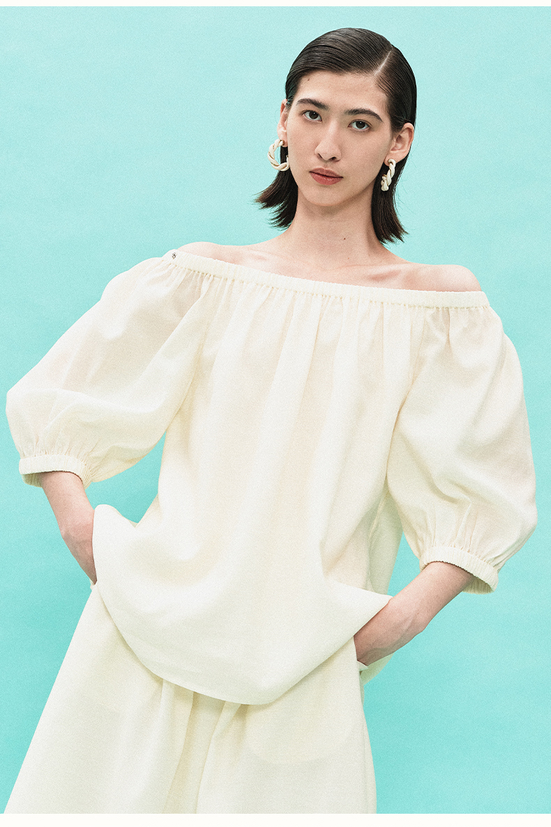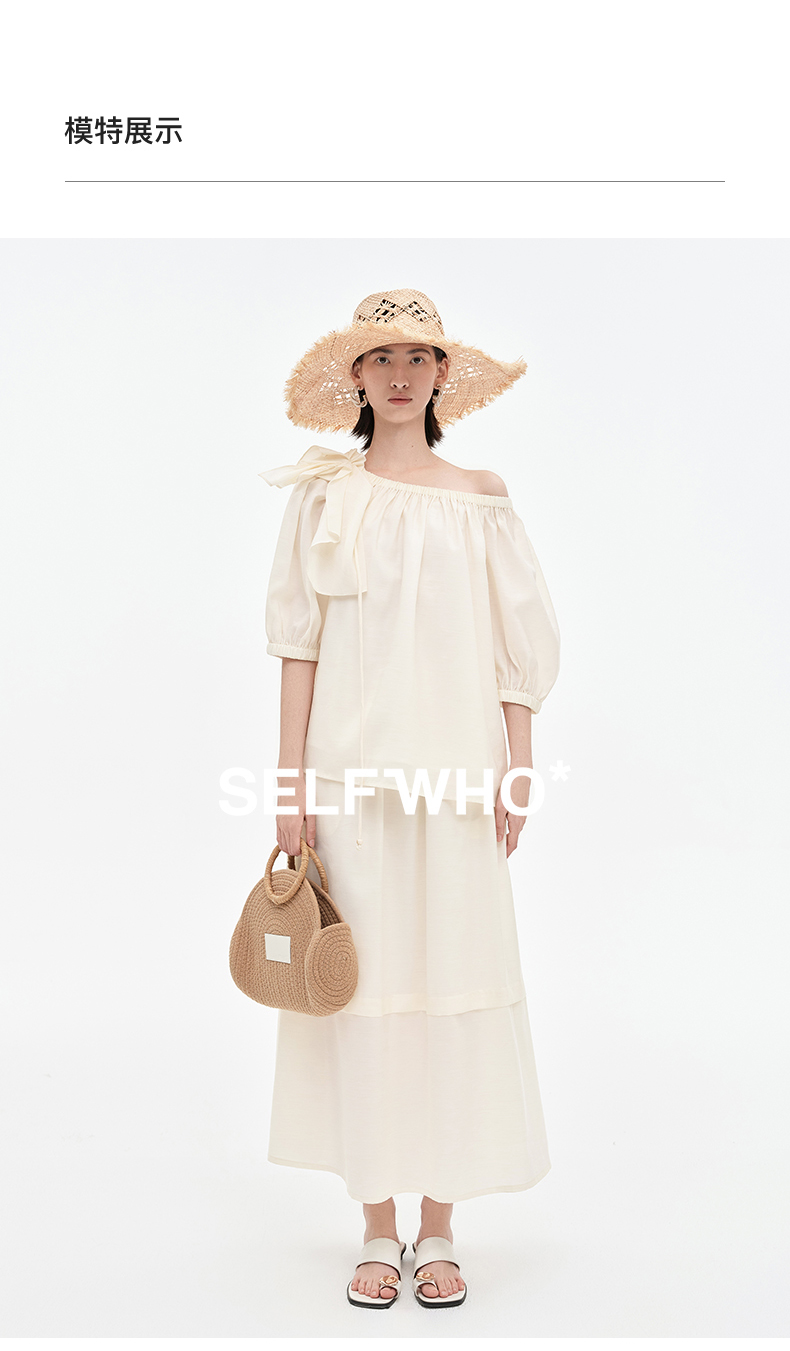 [姜妍同款]SELFWHO天丝羊毛混纺一字领套装衬衫女夏装泡泡袖上衣