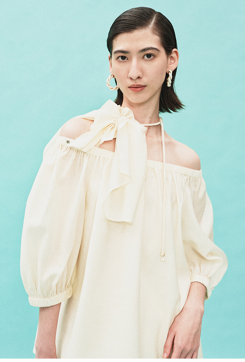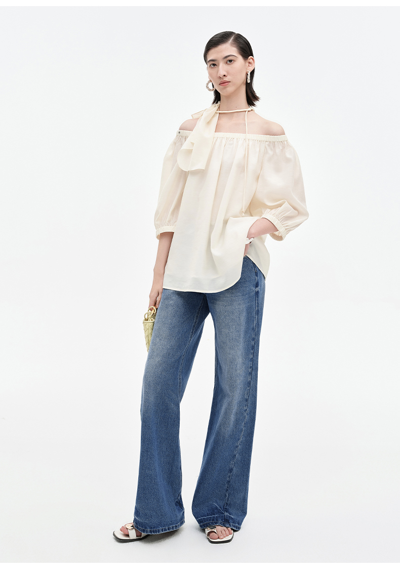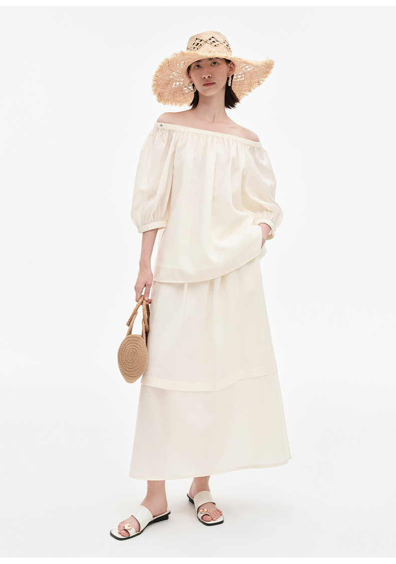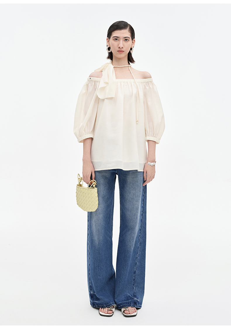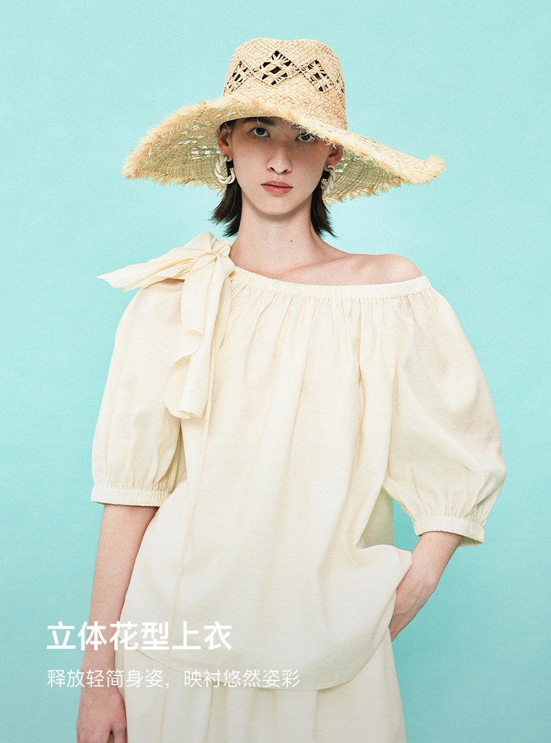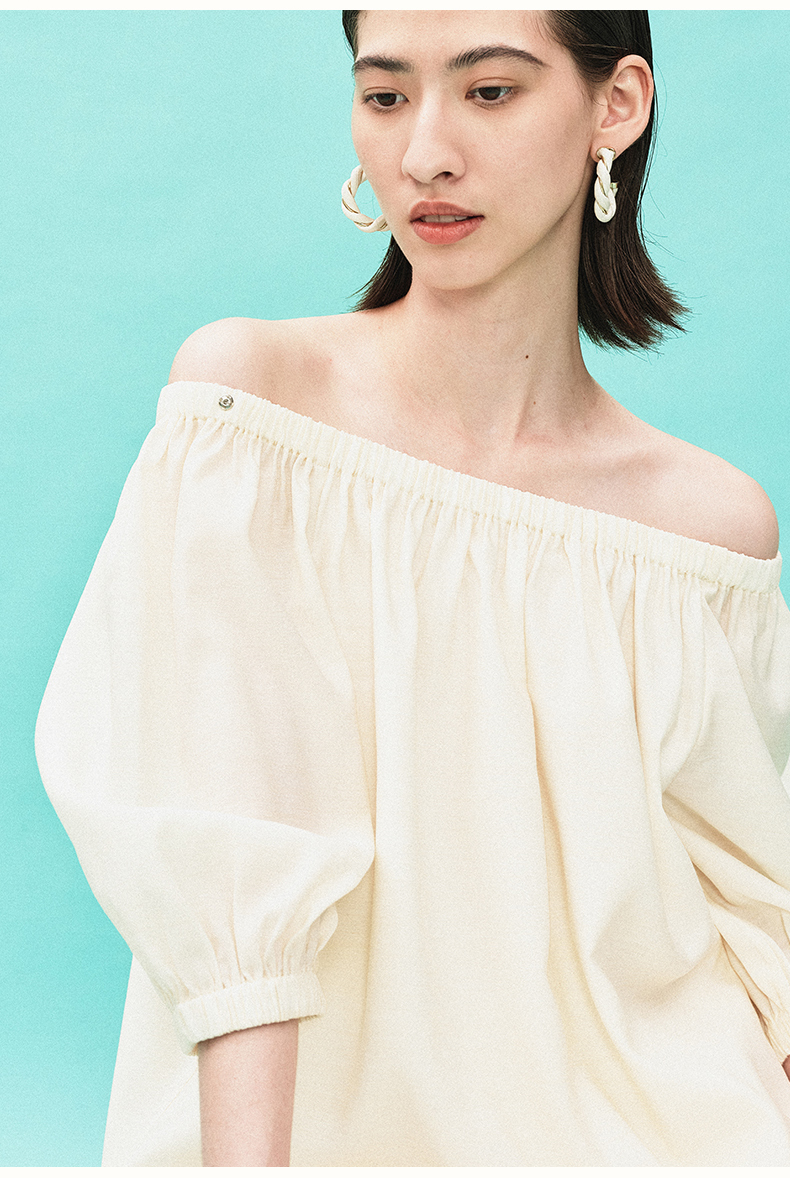 [姜妍同款]SELFWHO天丝羊毛混纺一字领套装衬衫女夏装泡泡袖上衣