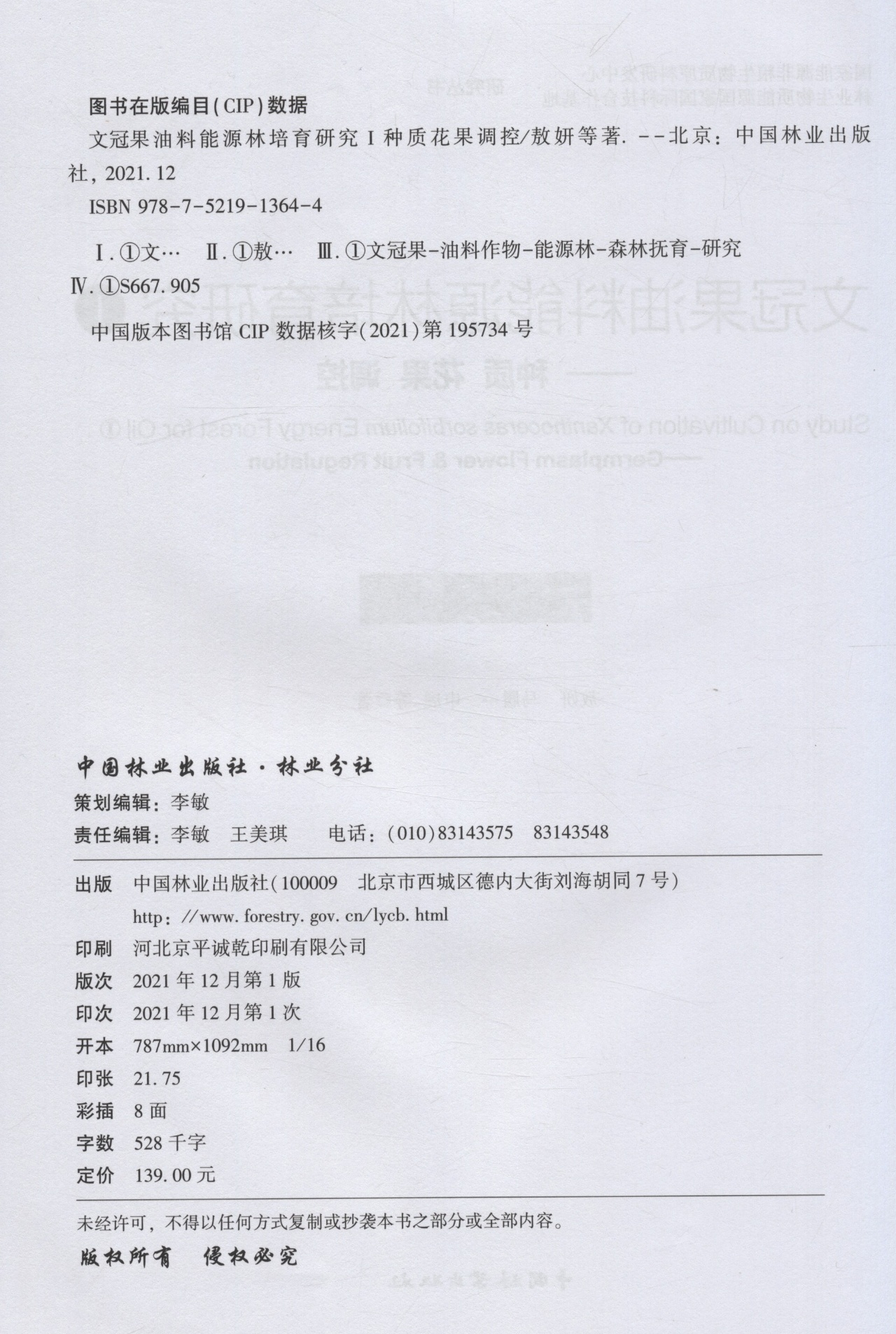 本书共分为五章,内容主要包括文冠果能源林种质资源评价筛选、开花生物学特性研究、结实生物学特性研究、开花结实调控技术研究。全书论述了目前文冠果种质选择与花果相关研究的现状;基于形态学特证和分子标记对文冠果能源林种质资源进行评价筛选;探讨了文冠果不同花朵类型的形成机制、性别分化过程,以及该过程相关生理和分子机制;揭示了果实种子发育过程,以及果壳皂苷、种子贮藏物积累的本质特征;研究了气象因子、叶幕微气候与花果发育的相互关系;在此基础上,初步构建了合理的树体管理方法,深入挖掘了授粉树配置、植物生长调节剂等对文冠果能源林产量和品质的影响以及在高效栽培技术上的应用。本书是一部理论与实践结合较好的专著,在科研、教学和生产实践上具有重要的参考价值。