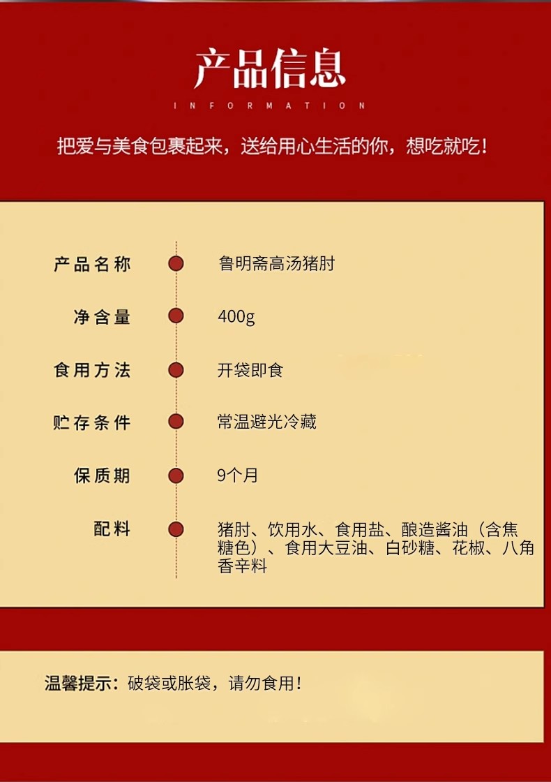 【两只装】鲁明斋高汤猪肘子 香卤味 400g*2袋 肉质厚实 肥而不腻