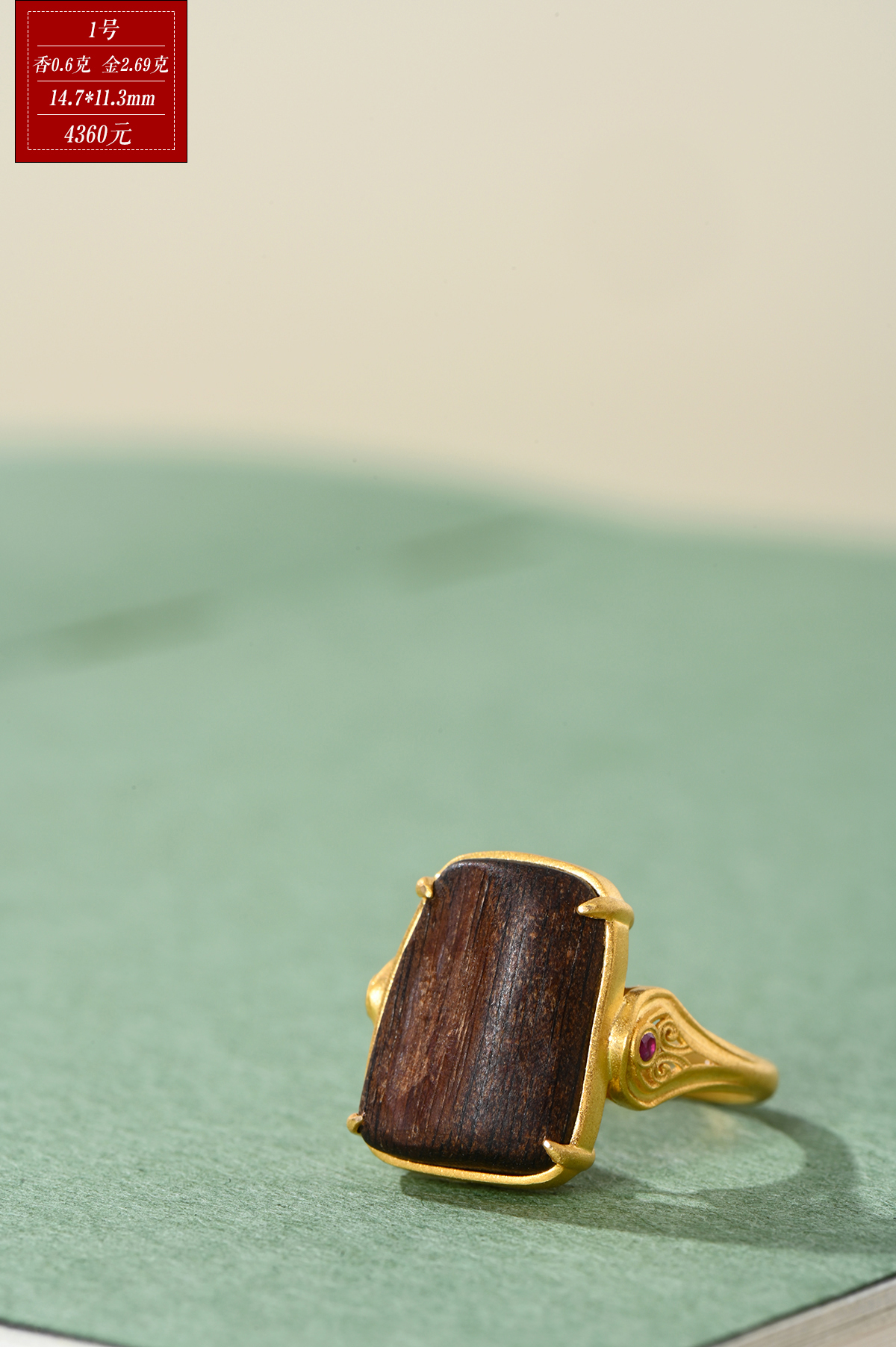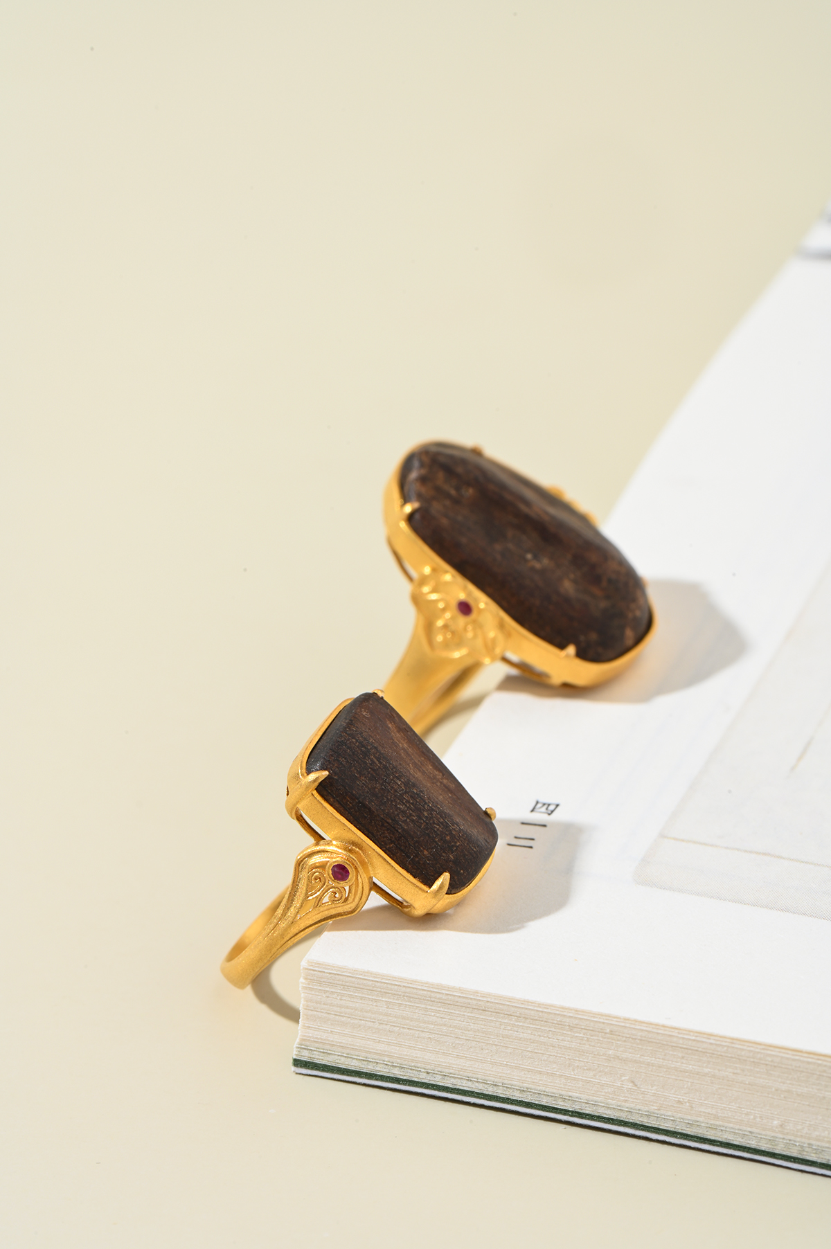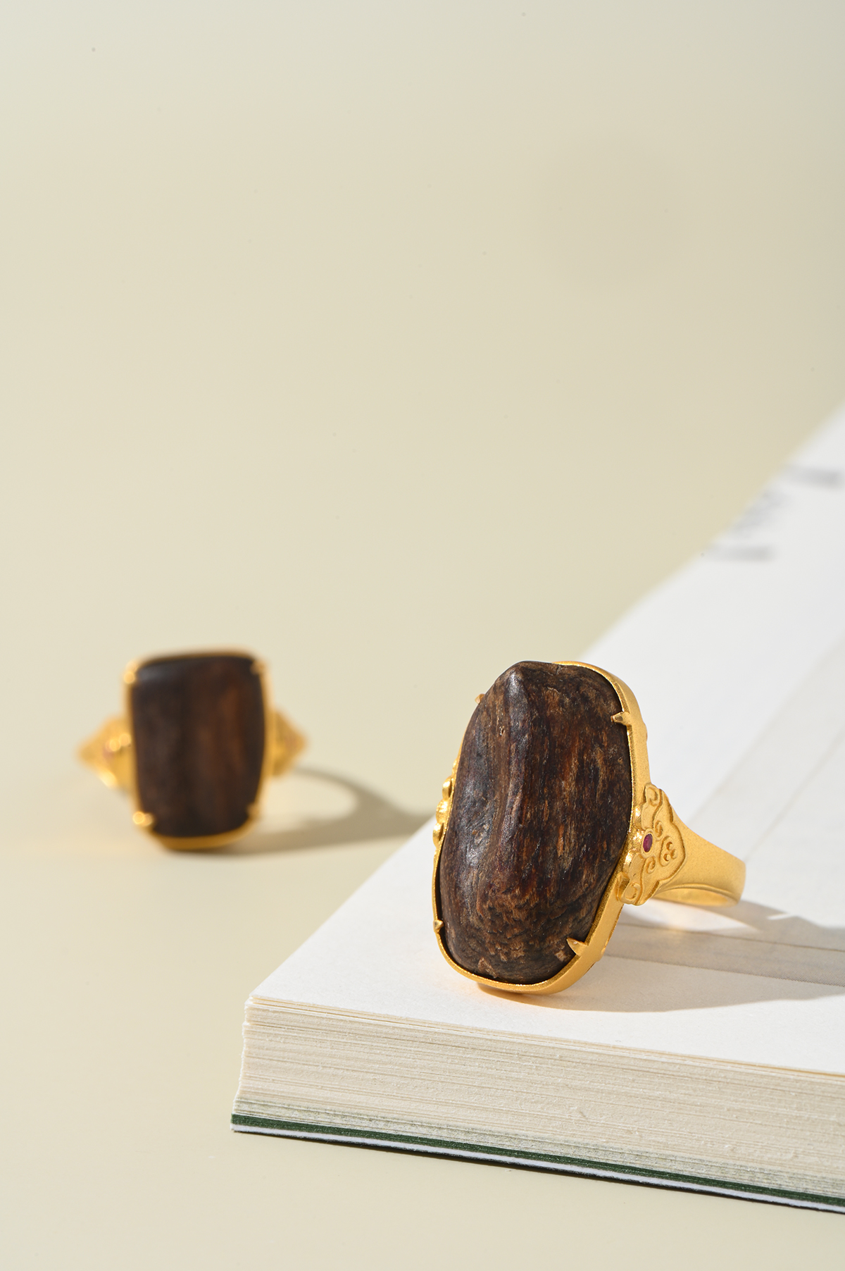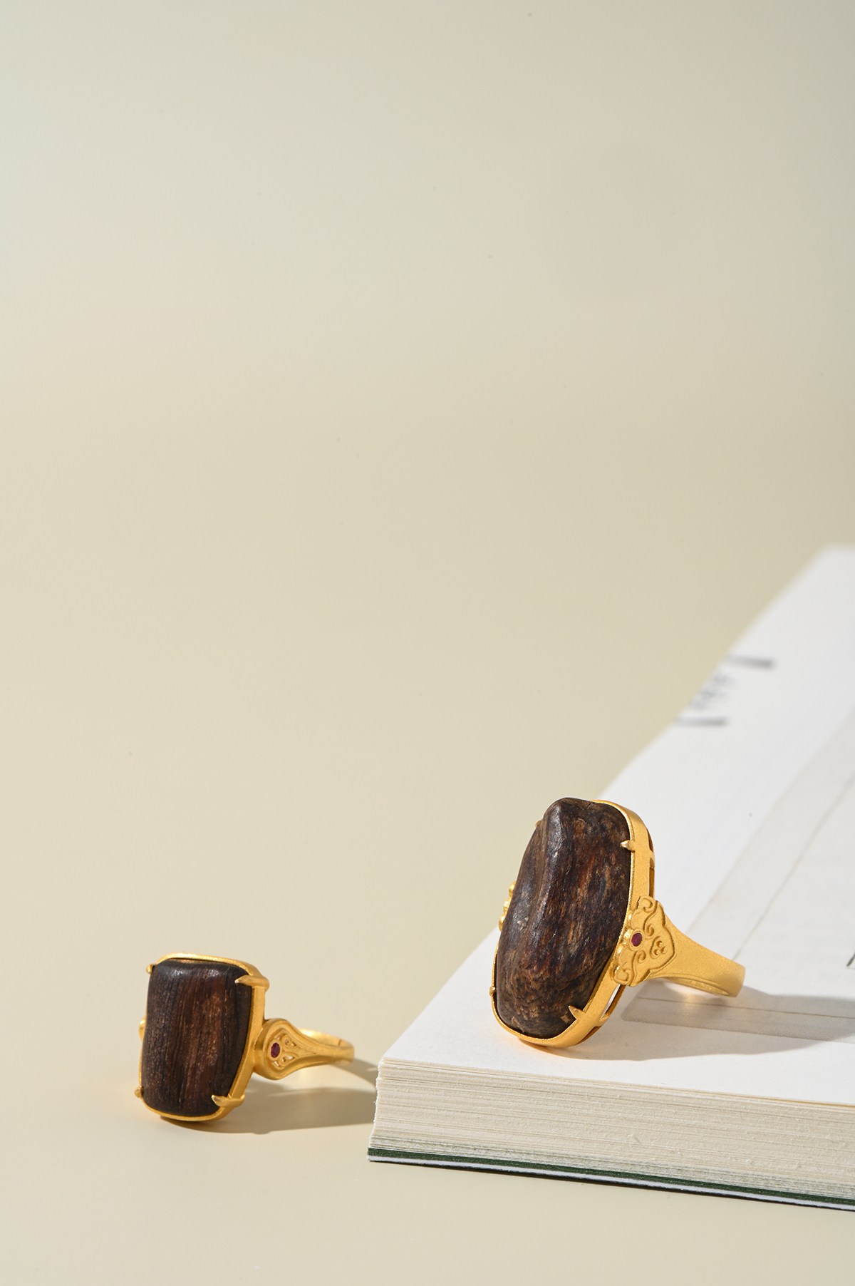戒面:如同俯瞰一片富含矿物的沃土,或是一块历经风霜的古老沉香木片,引人遐想。